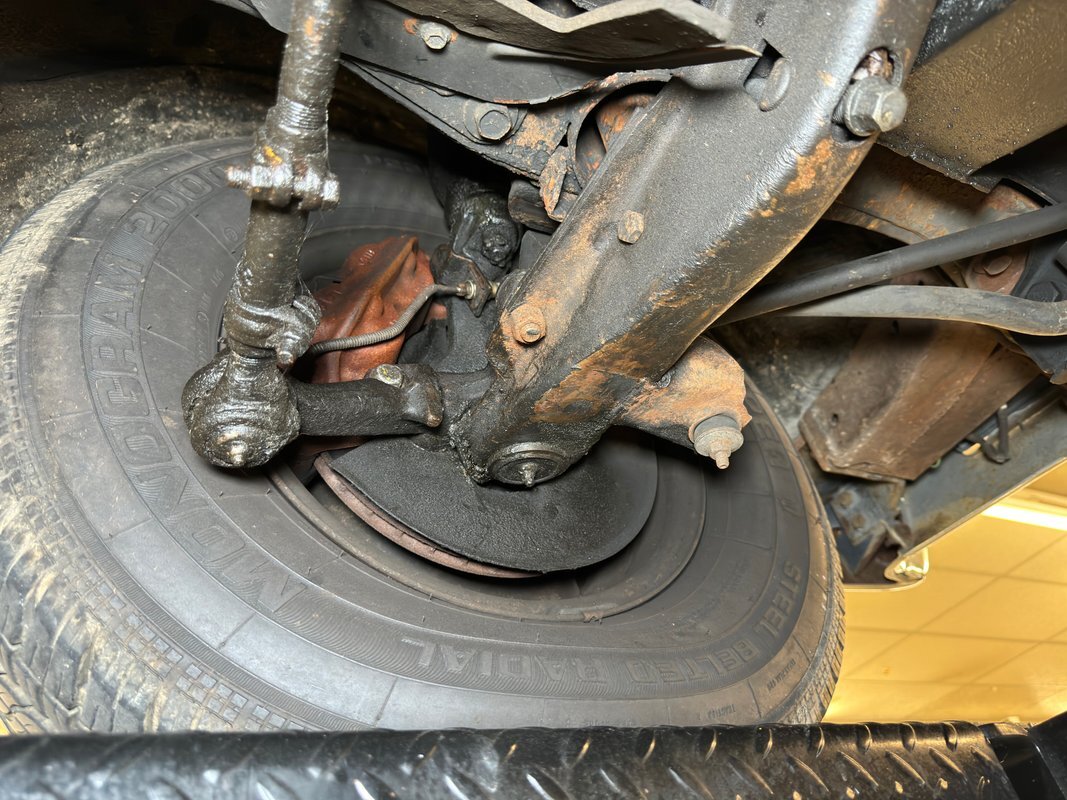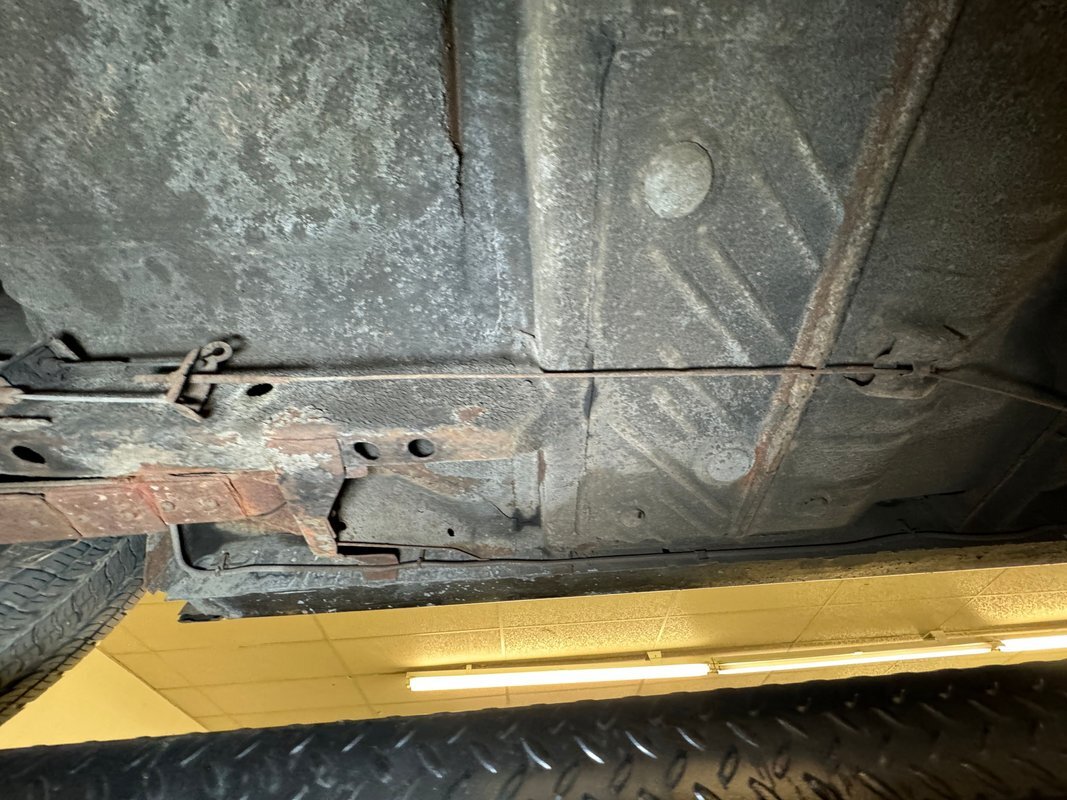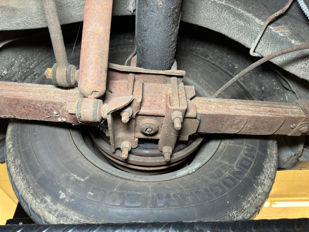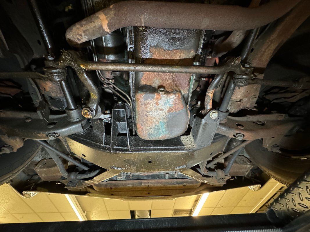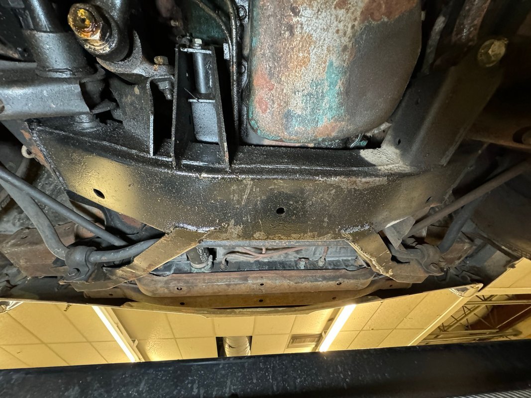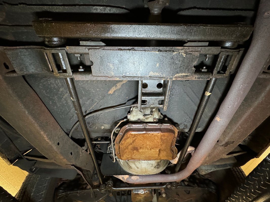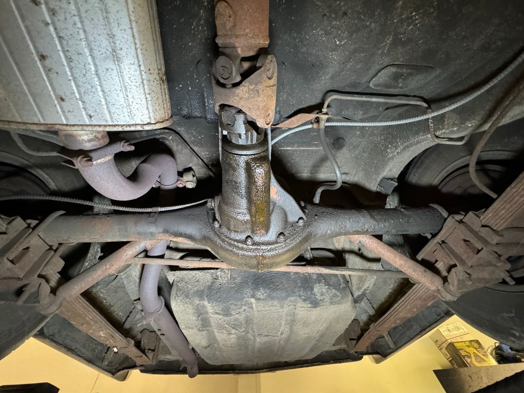 Surface rust exists on the usual places, driveshaft, leaf springs, exhaust, rear axle, rear shocks, frame rails. The front is dry, but the rear diff has oil possibly from the pinion seal. Single exhaust runs back to a stock style muffler and then terminates at the tailpipe under the car. Our Imperial is equipped with torsion bar suspension in front and leaf springs out back.