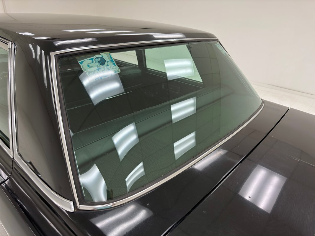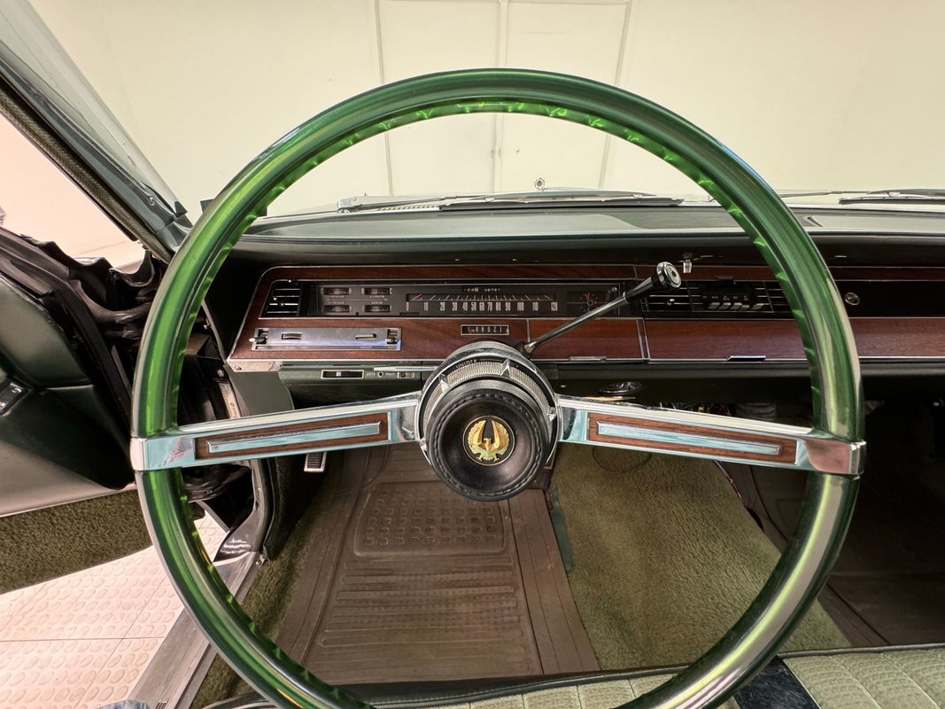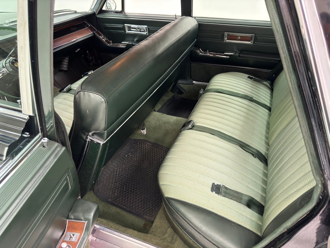 Though thinned out a bit, Imperials of this era have thick doors with robust features and an overall feeling of quality. Toggle switches and actuators are metal while the embossed green vinyl adds a touch of class along with faux wood panels and carpeted lowers. The light green stitched cloth inserts on the dark green vinyl bench seat provide some contrast and include the Imperial eagle embossed on the sides and a pulldown center armrest big enough for driver and passenger to use simultaneously. The seat shows some usage and also has a scratch in the vinyl while the back bench might look like fun but appears to have never been used. Bright green translucent plastic rings the steering wheel which also has wood trim around the horn buttons. A brushed aluminum column leads to the shifter in front of the faux wood backed dashboard and in keeping with the square theme of the car, presents gauges in rectangular bezels with barrel style readouts and a sweeping speedometer. In the center, simple climate controls are over the hidden radio. Lift the woodgrain door and we find the radio missing but a plate ready to accept one. Low pile green carpet looks good and the visors and headliner are in excellent condition, as is the huge, flat trunk.