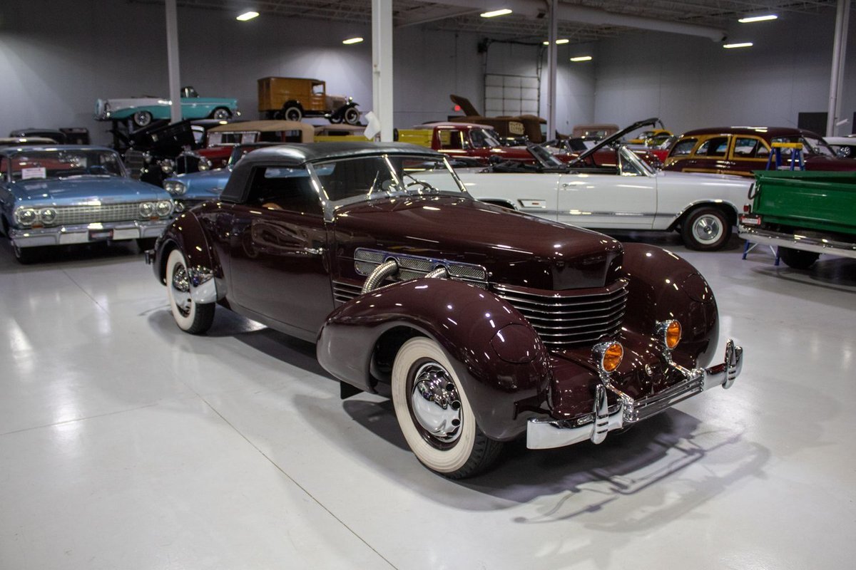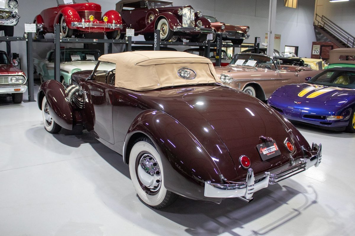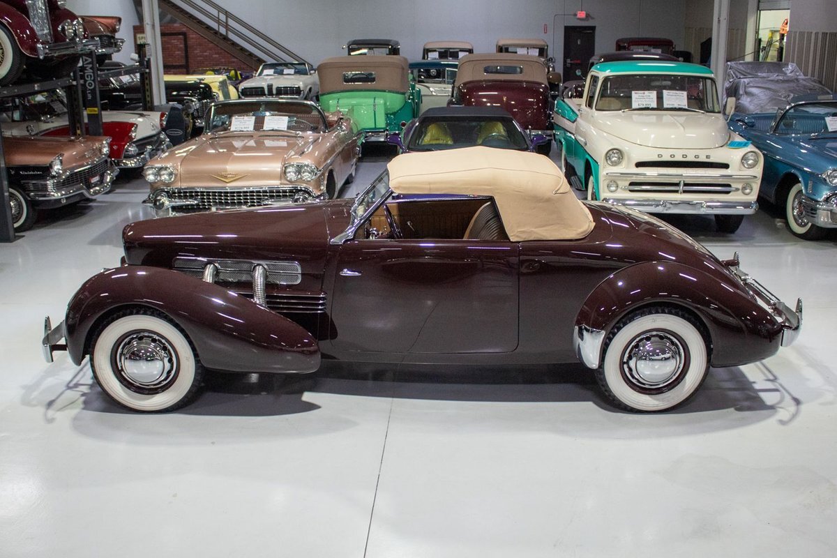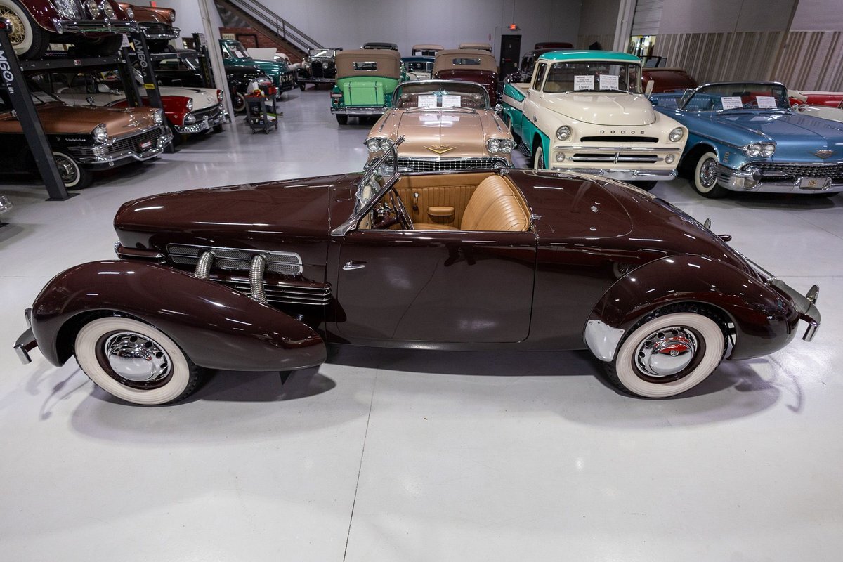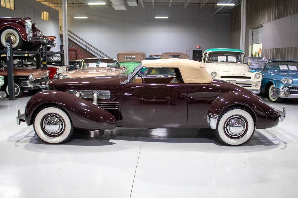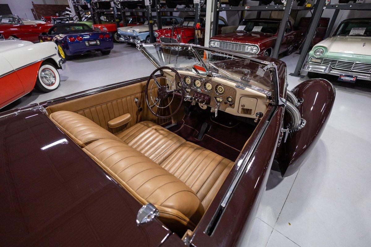 This 1937 Cord 812 Supercharged "Sportsman" Cabriolet is a beautiful, supercharged example of one of the most iconic and technologically advanced Pre-War cars ever produced. Established by namesake founder Errett Lobban "E.L." Cord in 1929, the Cord Corporation served as Mr. Cord's holding company for his automotive ventures, including his shares in the Auburn Automobile Company and Dusenberg, Inc., as well as engine builder, Lycoming Mfg. Co. To satisfy E.L. Cord's desire to produce his own namesake motor vehicle, Cord began producing the Cord L-29 in June of 1929 which served as a somewhat intermediate model sitting above the more affordably priced Auburn and below the top-of-the-line Duesenberg. Famously, the 1929 Cord L-29 beat out Ruxton to be "America's First Front-Drive Car;" however, in actuality, several automakers at the turn of the century had experimented with front wheel drive vehicles but none were particularly successful. Nonetheless, the 1929 release of the L-29 could not have come at a worse time, with the onset of the Great Depression starting in late 1929 and then continuing into 1930 and beyond. Consequently, Cord ceased production of the gorgeous L-29 at the end of 1931. By the mid-1930s however, the economy appeared as if it were beginning to recover from the horrific effects of the Depression and the Cord Corporation decided it was time to revive its novel front-wheel-drive automobiles, with a brand new design both inside and out. Styled by famed automobile designer Gordon Buehrig, the new Cord 810/812 models were essentially designed to be the "Baby Duesenberg" and featured an iconic "Coffin Nose" design. In addition to their unique style, the new Cord models are renowned for a number of revolutionary upgrades in automobile design including rear opening hoods, front wheel drive, "semi-automatic" transmissions, hide-away convertible tops, and "roll up headlights." Additionally, Cord's "coffin nose" front wheel drive design allowed for a lower ride height, which eliminated the need for running boards which would soon become obsolete across most American cars produced in the following decade or so. Of course, one of Cord's biggest innovations were introduced in 1937 with the incorporation of a supercharger that bumped the 812's horsepower from 125 to 170! In spite of all of the Cord's technological and design innovations, Cord's financial issues finally put a halt on production in August 1937, with the company producing a mere 2,992 810 and 812 models during its short run from 1936-1937. In total, a mere 2,992 "Coffin Nose" Cords were produced during their short production run from 1936 through 1937 and it is believed that just a handful of Supercharged "Sportsman" Cabriolet Convertible Coupes were produced in this configuration, which means that this particular example is quite a rare piece of automotive history. Due to its unique design, mechanical innovations, and overall rarity, the Classic Car Club of America (CCCA) has designated all Cord automobiles as Full Classics which means this '37 Cord 812 SC "Sportsman" is eligible to participate in CCCA events and CARavans. This particular example comes to us from the hands of a long line of prominent collectors, and most recently from an esteemed collection where it resided for a period of over ten years. Under the iconic, revolutionary rear-hinged hood on this '37 Cord 812 is a supercharged Lycoming 288.64 Cu. In. V8 fed by a single 2 barrel carburetor that together were said to have created an impressive 170 horsepower when new. The 289 Lycoming V8 is mated to a 4 speed manual transmission that shifted using the innovative remote controlled column-mounted pre-selector shifter. Unlike virtually all pre-war classic cars which were rear wheel drive, power is sent from the supercharged Lycoming powerplant via the transaxle to the front wheels on this front wheel drive Cord. This '37 Cord SC Sportsman rides on a set of wide whitewall bias-ply tires, accented with chrome wheelcovers and beauty rings which gives this convertible an upscale look whether parked at the local car show or cruising down the road. The luxurious look and feel of this 812 Sportsman Convertible is further supplemented with front and rear bumper guards and a pair of amber-lensed Cord-branded fog lights. In addition to the fog lamps, both headlights manually crank up and down which is one of the many technological and forward-thinking innovations of the Cord 810/812 series. This 1937 Sportsman is equipped with a manually operated beige cloth convertible soft top along with an accessory removable hardtop, both of which appear to be in wonderful condition. The exterior on this '37 Cord 812 Sportsman has been refinished in a beautiful Dark Thrust Brown paint that completes the stunning exterior look of the CCCA Full Classic. The interior on this 1937 Cord 812 Sportsman Convertible Coupe is absolutely gorgeous! The bench seat has been reupholstered with beautiful tan leather that provides a beautiful contrast from the rich exterior appearance. The matching upholstered door panels and armrests, along with the burgundy carpeting, dark ivory painted dash with its engine-turned instrument panel, and body color-matched steering wheel with chrome horn ring are all in fantastic condition as well and appear to be in their stock configuration. The instrument cluster features a wide array of instrumentation and gauges including a 150 MPH speedometer, 5,000 RPM tachometer, oil pressure gauge, temperature gauge, amp gauge, and fuel gauge. The dash is completed with an AM radio and full-size clock, as well as with a pair of locking gloveboxes that straddle the instrument panel. Whether you're buying your first full classic car or you're an established ACD or CCCA collector, this 1937 Cord 812 "Sportsman" Cabriolet would make an excellent choice. Give Ellingson's a call today at763-428-7337!