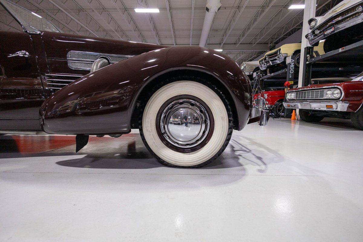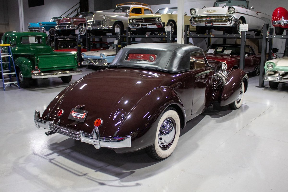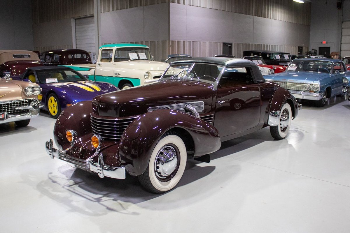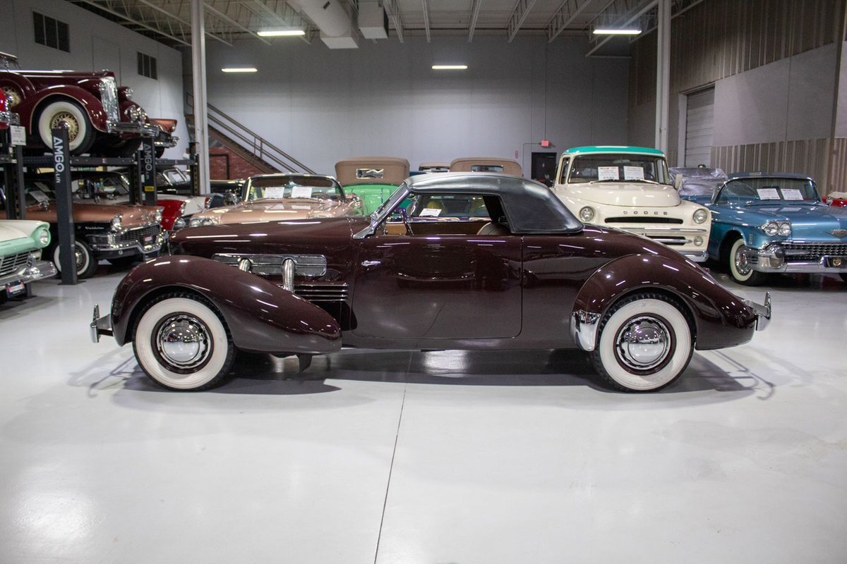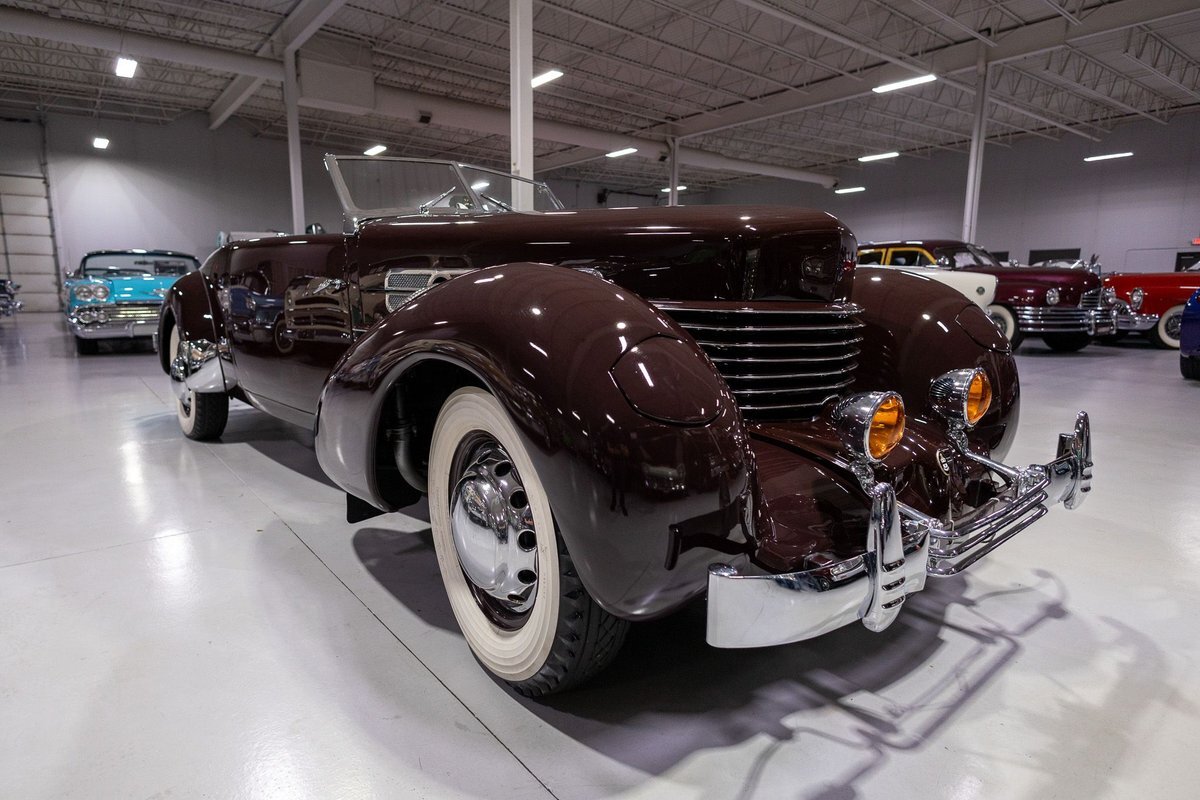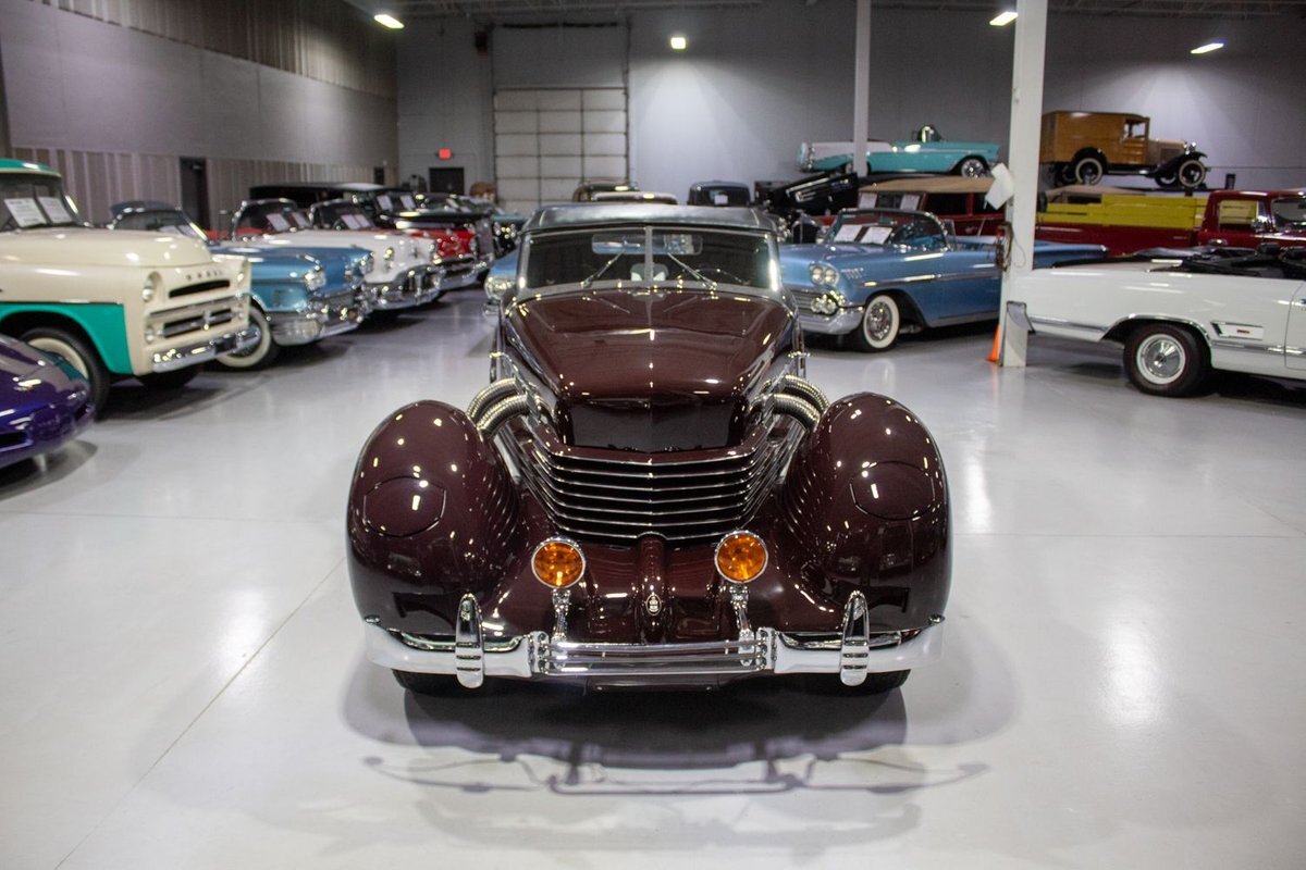 This 1937 Cord 812 Supercharged "Sportsman" Cabriolet is a beautiful, supercharged example of one of the most iconic and technologically advanced Pre-War cars ever produced. Established by namesake founder Errett Lobban "E.L." Cord in 1929, the Cord Corporation served as Mr. Cord's holding company for his automotive ventures, including his shares in the Auburn Automobile Company and Dusenberg, Inc., as well as engine builder, Lycoming Mfg. Co. To satisfy E.L. Cord's desire to produce his own namesake motor vehicle, Cord began producing the Cord L-29 in June of 1929 which served as a somewhat intermediate model sitting above the more affordably priced Auburn and below the top-of-the-line Duesenberg. Famously, the 1929 Cord L-29 beat out Ruxton to be "America's First Front-Drive Car;" however, in actuality, several automakers at the turn of the century had experimented with front wheel drive vehicles but none were particularly successful. Nonetheless, the 1929 release of the L-29 could not have come at a worse time, with the onset of the Great Depression starting in late 1929 and then continuing into 1930 and beyond. Consequently, Cord ceased production of the gorgeous L-29 at the end of 1931. By the mid-1930s however, the economy appeared as if it were beginning to recover from the horrific effects of the Depression and the Cord Corporation decided it was time to revive its novel front-wheel-drive automobiles, with a brand new design both inside and out. Styled by famed automobile designer Gordon Buehrig, the new Cord 810/812 models were essentially designed to be the "Baby Duesenberg" and featured an iconic "Coffin Nose" design. In addition to their unique style, the new Cord models are renowned for a number of revolutionary upgrades in automobile design including rear opening hoods, front wheel drive, "semi-automatic" transmissions, hide-away convertible tops, and "roll up headlights." Additionally, Cord's "coffin nose" front wheel drive design allowed for a lower ride height, which eliminated the need for running boards which would soon become obsolete across most American cars produced in the following decade or so. Of course, one of Cord's biggest innovations were introduced in 1937 with the incorporation of a supercharger that bumped the 812's horsepower from 125 to 170! In spite of all of the Cord's technological and design innovations, Cord's financial issues finally put a halt on production in August 1937, with the company producing a mere 2,992 810 and 812 models during its short run from 1936-1937. In total, a mere 2,992 "Coffin Nose" Cords were produced during their short production run from 1936 through 1937 and it is believed that just a handful of Supercharged "Sportsman" Cabriolet Convertible Coupes were produced in this configuration, which means that this particular example is quite a rare piece of automotive history. Due to its unique design, mechanical innovations, and overall rarity, the Classic Car Club of America (CCCA) has designated all Cord automobiles as Full Classics which means this '37 Cord 812 SC "Sportsman" is eligible to participate in CCCA events and CARavans. This particular example comes to us from the hands of a long line of prominent collectors, and most recently from an esteemed collection where it resided for a period of over ten years. Under the iconic, revolutionary rear-hinged hood on this '37 Cord 812 is a supercharged Lycoming 288.64 Cu. In. V8 fed by a single 2 barrel carburetor that together were said to have created an impressive 170 horsepower when new. The 289 Lycoming V8 is mated to a 4 speed manual transmission that shifted using the innovative remote controlled column-mounted pre-selector shifter. Unlike virtually all pre-war classic cars which were rear wheel drive, power is sent from the supercharged Lycoming powerplant via the transaxle to the front wheels on this front wheel drive Cord. This '37 Cord SC Sportsman rides on a set of wide whitewall bias-ply tires, accented with chrome wheelcovers and beauty rings which gives this convertible an upscale look whether parked at the local car show or cruising down the road. The luxurious look and feel of this 812 Sportsman Convertible is further supplemented with front and rear bumper guards and a pair of amber-lensed Cord-branded fog lights. In addition to the fog lamps, both headlights manually crank up and down which is one of the many technological and forward-thinking innovations of the Cord 810/812 series. This 1937 Sportsman is equipped with a manually operated beige cloth convertible soft top along with an accessory removable hardtop, both of which appear to be in wonderful condition. The exterior on this '37 Cord 812 Sportsman has been refinished in a beautiful Dark Thrust Brown paint that completes the stunning exterior look of the CCCA Full Classic. The interior on this 1937 Cord 812 Sportsman Convertible Coupe is absolutely gorgeous! The bench seat has been reupholstered with beautiful tan leather that provides a beautiful contrast from the rich exterior appearance. The matching upholstered door panels and armrests, along with the burgundy carpeting, dark ivory painted dash with its engine-turned instrument panel, and body color-matched steering wheel with chrome horn ring are all in fantastic condition as well and appear to be in their stock configuration. The instrument cluster features a wide array of instrumentation and gauges including a 150 MPH speedometer, 5,000 RPM tachometer, oil pressure gauge, temperature gauge, amp gauge, and fuel gauge. The dash is completed with an AM radio and full-size clock, as well as with a pair of locking gloveboxes that straddle the instrument panel. Whether you're buying your first full classic car or you're an established ACD or CCCA collector, this 1937 Cord 812 "Sportsman" Cabriolet would make an excellent choice. Give Ellingson's a call today at763-428-7337!