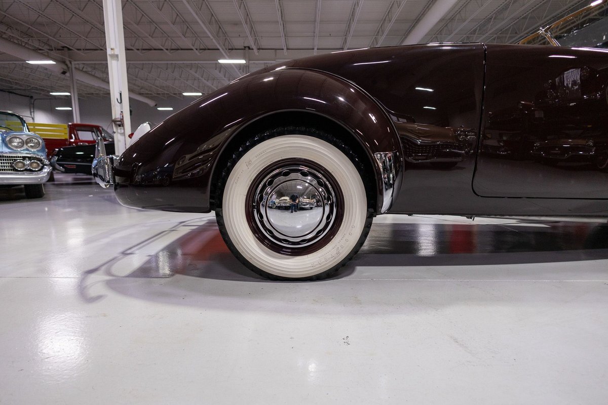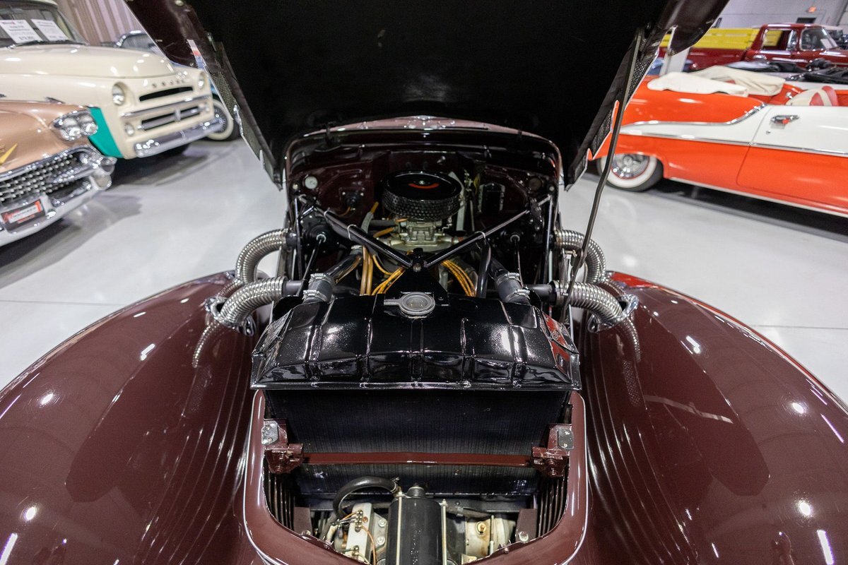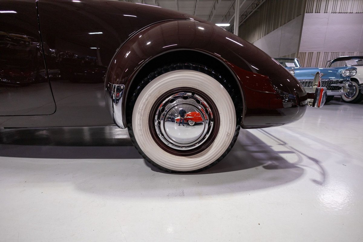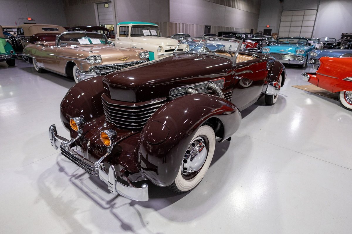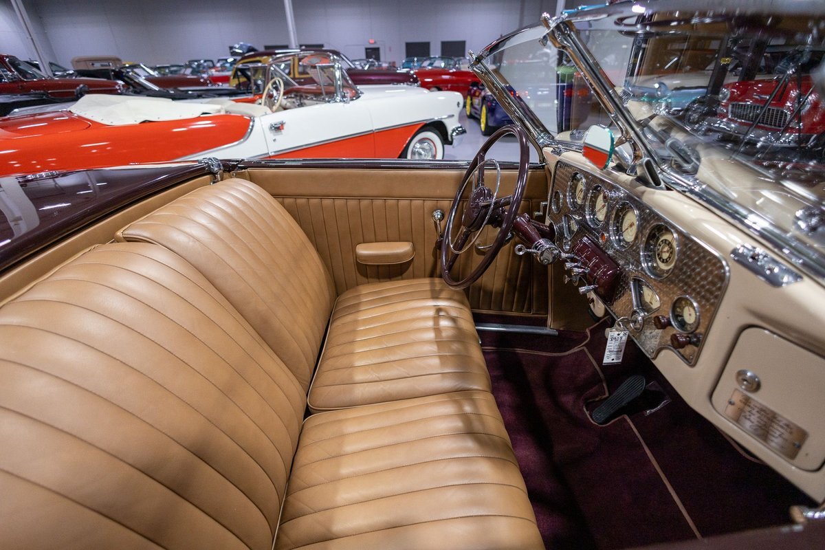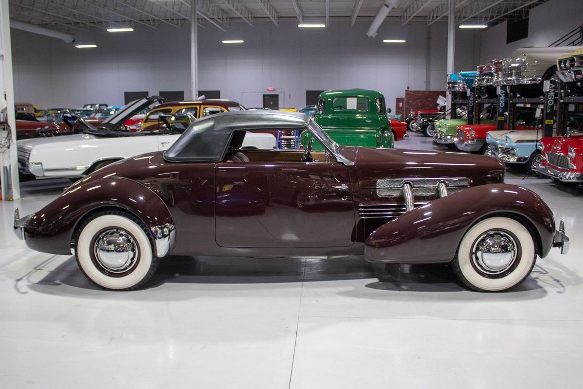 This 1937 Cord 812 Supercharged "Sportsman" Cabriolet is a beautiful, supercharged example of one of the most iconic and technologically advanced Pre-War cars ever produced. Established by namesake founder Errett Lobban "E.L." Cord in 1929, the Cord Corporation served as Mr. Cord's holding company for his automotive ventures, including his shares in the Auburn Automobile Company and Dusenberg, Inc., as well as engine builder, Lycoming Mfg. Co. To satisfy E.L. Cord's desire to produce his own namesake motor vehicle, Cord began producing the Cord L-29 in June of 1929 which served as a somewhat intermediate model sitting above the more affordably priced Auburn and below the top-of-the-line Duesenberg. Famously, the 1929 Cord L-29 beat out Ruxton to be "America's First Front-Drive Car;" however, in actuality, several automakers at the turn of the century had experimented with front wheel drive vehicles but none were particularly successful. Nonetheless, the 1929 release of the L-29 could not have come at a worse time, with the onset of the Great Depression starting in late 1929 and then continuing into 1930 and beyond. Consequently, Cord ceased production of the gorgeous L-29 at the end of 1931. By the mid-1930s however, the economy appeared as if it were beginning to recover from the horrific effects of the Depression and the Cord Corporation decided it was time to revive its novel front-wheel-drive automobiles, with a brand new design both inside and out. Styled by famed automobile designer Gordon Buehrig, the new Cord 810/812 models were essentially designed to be the "Baby Duesenberg" and featured an iconic "Coffin Nose" design. In addition to their unique style, the new Cord models are renowned for a number of revolutionary upgrades in automobile design including rear opening hoods, front wheel drive, "semi-automatic" transmissions, hide-away convertible tops, and "roll up headlights." Additionally, Cord's "coffin nose" front wheel drive design allowed for a lower ride height, which eliminated the need for running boards which would soon become obsolete across most American cars produced in the following decade or so. Of course, one of Cord's biggest innovations were introduced in 1937 with the incorporation of a supercharger that bumped the 812's horsepower from 125 to 170! In spite of all of the Cord's technological and design innovations, Cord's financial issues finally put a halt on production in August 1937, with the company producing a mere 2,992 810 and 812 models during its short run from 1936-1937. In total, a mere 2,992 "Coffin Nose" Cords were produced during their short production run from 1936 through 1937 and it is believed that just a handful of Supercharged "Sportsman" Cabriolet Convertible Coupes were produced in this configuration, which means that this particular example is quite a rare piece of automotive history. Due to its unique design, mechanical innovations, and overall rarity, the Classic Car Club of America (CCCA) has designated all Cord automobiles as Full Classics which means this '37 Cord 812 SC "Sportsman" is eligible to participate in CCCA events and CARavans. This particular example comes to us from the hands of a long line of prominent collectors, and most recently from an esteemed collection where it resided for a period of over ten years. Under the iconic, revolutionary rear-hinged hood on this '37 Cord 812 is a supercharged Lycoming 288.64 Cu. In. V8 fed by a single 2 barrel carburetor that together were said to have created an impressive 170 horsepower when new. The 289 Lycoming V8 is mated to a 4 speed manual transmission that shifted using the innovative remote controlled column-mounted pre-selector shifter. Unlike virtually all pre-war classic cars which were rear wheel drive, power is sent from the supercharged Lycoming powerplant via the transaxle to the front wheels on this front wheel drive Cord. This '37 Cord SC Sportsman rides on a set of wide whitewall bias-ply tires, accented with chrome wheelcovers and beauty rings which gives this convertible an upscale look whether parked at the local car show or cruising down the road. The luxurious look and feel of this 812 Sportsman Convertible is further supplemented with front and rear bumper guards and a pair of amber-lensed Cord-branded fog lights. In addition to the fog lamps, both headlights manually crank up and down which is one of the many technological and forward-thinking innovations of the Cord 810/812 series. This 1937 Sportsman is equipped with a manually operated beige cloth convertible soft top along with an accessory removable hardtop, both of which appear to be in wonderful condition. The exterior on this '37 Cord 812 Sportsman has been refinished in a beautiful Dark Thrust Brown paint that completes the stunning exterior look of the CCCA Full Classic. The interior on this 1937 Cord 812 Sportsman Convertible Coupe is absolutely gorgeous! The bench seat has been reupholstered with beautiful tan leather that provides a beautiful contrast from the rich exterior appearance. The matching upholstered door panels and armrests, along with the burgundy carpeting, dark ivory painted dash with its engine-turned instrument panel, and body color-matched steering wheel with chrome horn ring are all in fantastic condition as well and appear to be in their stock configuration. The instrument cluster features a wide array of instrumentation and gauges including a 150 MPH speedometer, 5,000 RPM tachometer, oil pressure gauge, temperature gauge, amp gauge, and fuel gauge. The dash is completed with an AM radio and full-size clock, as well as with a pair of locking gloveboxes that straddle the instrument panel. Whether you're buying your first full classic car or you're an established ACD or CCCA collector, this 1937 Cord 812 "Sportsman" Cabriolet would make an excellent choice. Give Ellingson's a call today at763-428-7337!