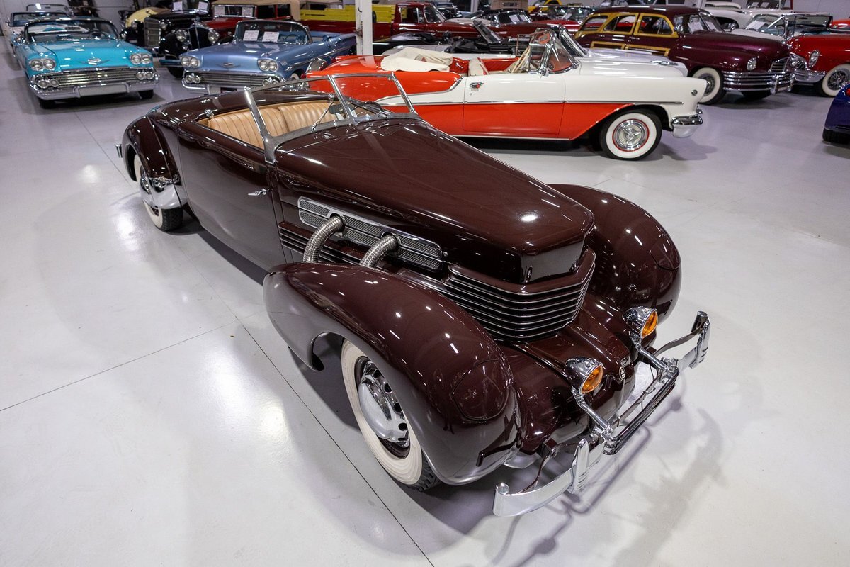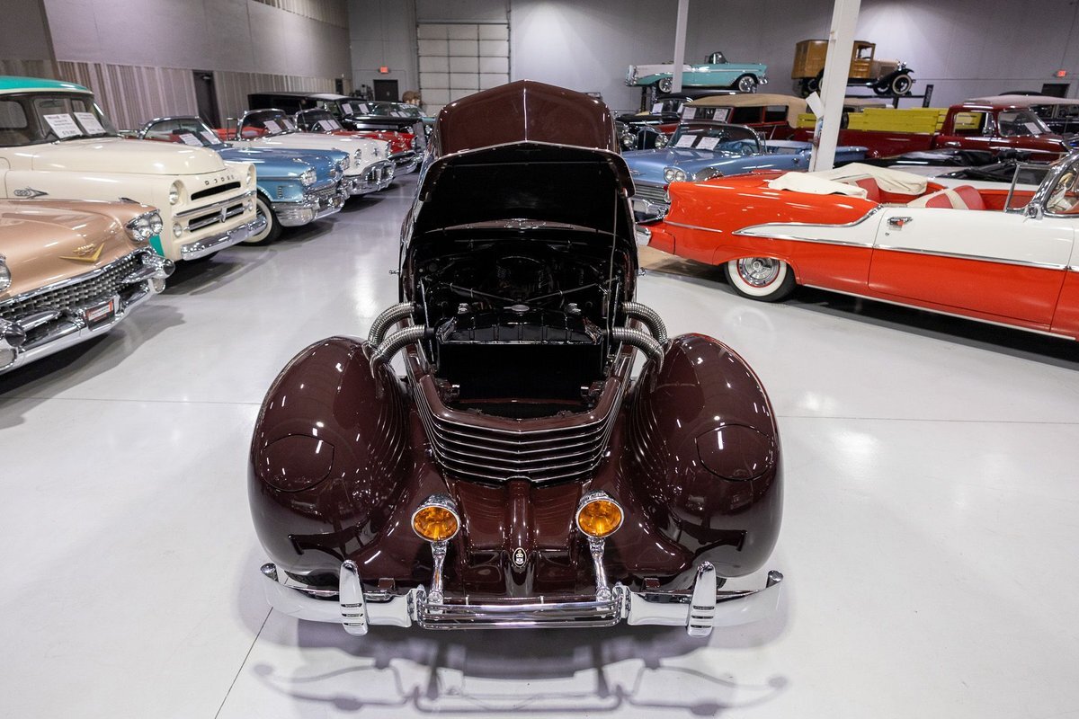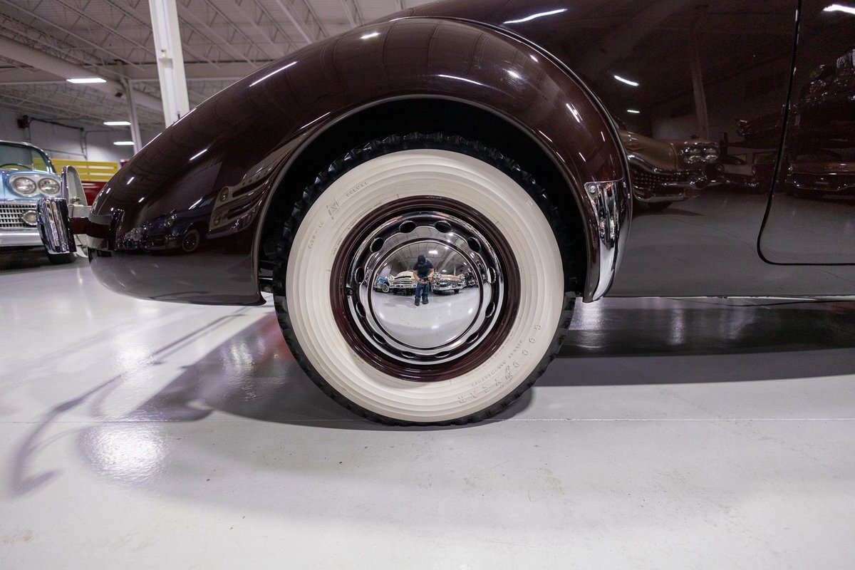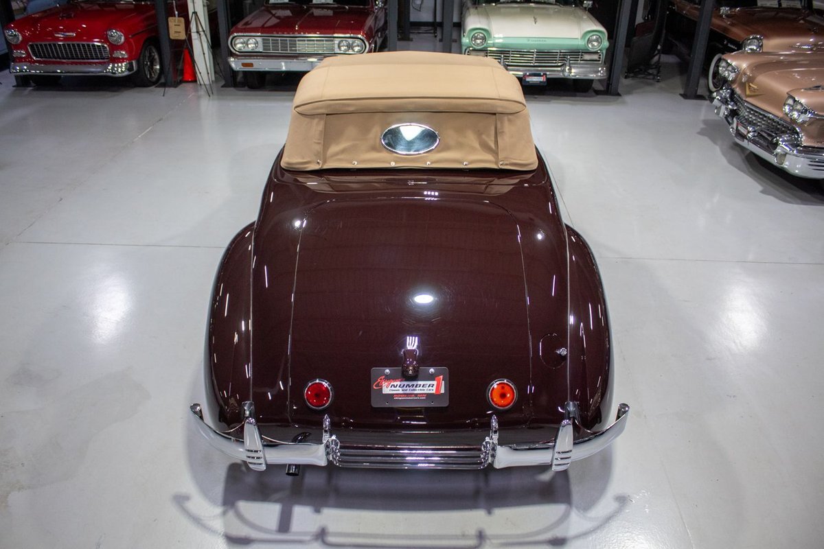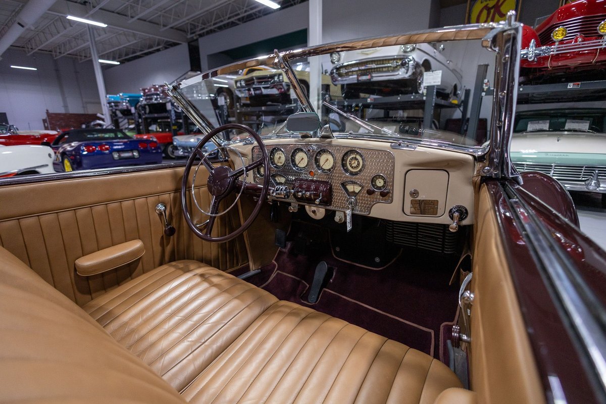 This 1937 Cord 812 Supercharged "Sportsman" Cabriolet is a beautiful, supercharged example of one of the most iconic and technologically advanced Pre-War cars ever produced. Established by namesake founder Errett Lobban "E.L." Cord in 1929, the Cord Corporation served as Mr. Cord's holding company for his automotive ventures, including his shares in the Auburn Automobile Company and Dusenberg, Inc., as well as engine builder, Lycoming Mfg. Co. To satisfy E.L. Cord's desire to produce his own namesake motor vehicle, Cord began producing the Cord L-29 in June of 1929 which served as a somewhat intermediate model sitting above the more affordably priced Auburn and below the top-of-the-line Duesenberg. Famously, the 1929 Cord L-29 beat out Ruxton to be "America's First Front-Drive Car;" however, in actuality, several automakers at the turn of the century had experimented with front wheel drive vehicles but none were particularly successful. Nonetheless, the 1929 release of the L-29 could not have come at a worse time, with the onset of the Great Depression starting in late 1929 and then continuing into 1930 and beyond. Consequently, Cord ceased production of the gorgeous L-29 at the end of 1931. By the mid-1930s however, the economy appeared as if it were beginning to recover from the horrific effects of the Depression and the Cord Corporation decided it was time to revive its novel front-wheel-drive automobiles, with a brand new design both inside and out. Styled by famed automobile designer Gordon Buehrig, the new Cord 810/812 models were essentially designed to be the "Baby Duesenberg" and featured an iconic "Coffin Nose" design. In addition to their unique style, the new Cord models are renowned for a number of revolutionary upgrades in automobile design including rear opening hoods, front wheel drive, "semi-automatic" transmissions, hide-away convertible tops, and "roll up headlights." Additionally, Cord's "coffin nose" front wheel drive design allowed for a lower ride height, which eliminated the need for running boards which would soon become obsolete across most American cars produced in the following decade or so. Of course, one of Cord's biggest innovations were introduced in 1937 with the incorporation of a supercharger that bumped the 812's horsepower from 125 to 170! In spite of all of the Cord's technological and design innovations, Cord's financial issues finally put a halt on production in August 1937, with the company producing a mere 2,992 810 and 812 models during its short run from 1936-1937. In total, a mere 2,992 "Coffin Nose" Cords were produced during their short production run from 1936 through 1937 and it is believed that just a handful of Supercharged "Sportsman" Cabriolet Convertible Coupes were produced in this configuration, which means that this particular example is quite a rare piece of automotive history. Due to its unique design, mechanical innovations, and overall rarity, the Classic Car Club of America (CCCA) has designated all Cord automobiles as Full Classics which means this '37 Cord 812 SC "Sportsman" is eligible to participate in CCCA events and CARavans. This particular example comes to us from the hands of a long line of prominent collectors, and most recently from an esteemed collection where it resided for a period of over ten years. Under the iconic, revolutionary rear-hinged hood on this '37 Cord 812 is a supercharged Lycoming 288.64 Cu. In. V8 fed by a single 2 barrel carburetor that together were said to have created an impressive 170 horsepower when new. The 289 Lycoming V8 is mated to a 4 speed manual transmission that shifted using the innovative remote controlled column-mounted pre-selector shifter. Unlike virtually all pre-war classic cars which were rear wheel drive, power is sent from the supercharged Lycoming powerplant via the transaxle to the front wheels on this front wheel drive Cord. This '37 Cord SC Sportsman rides on a set of wide whitewall bias-ply tires, accented with chrome wheelcovers and beauty rings which gives this convertible an upscale look whether parked at the local car show or cruising down the road. The luxurious look and feel of this 812 Sportsman Convertible is further supplemented with front and rear bumper guards and a pair of amber-lensed Cord-branded fog lights. In addition to the fog lamps, both headlights manually crank up and down which is one of the many technological and forward-thinking innovations of the Cord 810/812 series. This 1937 Sportsman is equipped with a manually operated beige cloth convertible soft top along with an accessory removable hardtop, both of which appear to be in wonderful condition. The exterior on this '37 Cord 812 Sportsman has been refinished in a beautiful Dark Thrust Brown paint that completes the stunning exterior look of the CCCA Full Classic. The interior on this 1937 Cord 812 Sportsman Convertible Coupe is absolutely gorgeous! The bench seat has been reupholstered with beautiful tan leather that provides a beautiful contrast from the rich exterior appearance. The matching upholstered door panels and armrests, along with the burgundy carpeting, dark ivory painted dash with its engine-turned instrument panel, and body color-matched steering wheel with chrome horn ring are all in fantastic condition as well and appear to be in their stock configuration. The instrument cluster features a wide array of instrumentation and gauges including a 150 MPH speedometer, 5,000 RPM tachometer, oil pressure gauge, temperature gauge, amp gauge, and fuel gauge. The dash is completed with an AM radio and full-size clock, as well as with a pair of locking gloveboxes that straddle the instrument panel. Whether you're buying your first full classic car or you're an established ACD or CCCA collector, this 1937 Cord 812 "Sportsman" Cabriolet would make an excellent choice. Give Ellingson's a call today at763-428-7337!