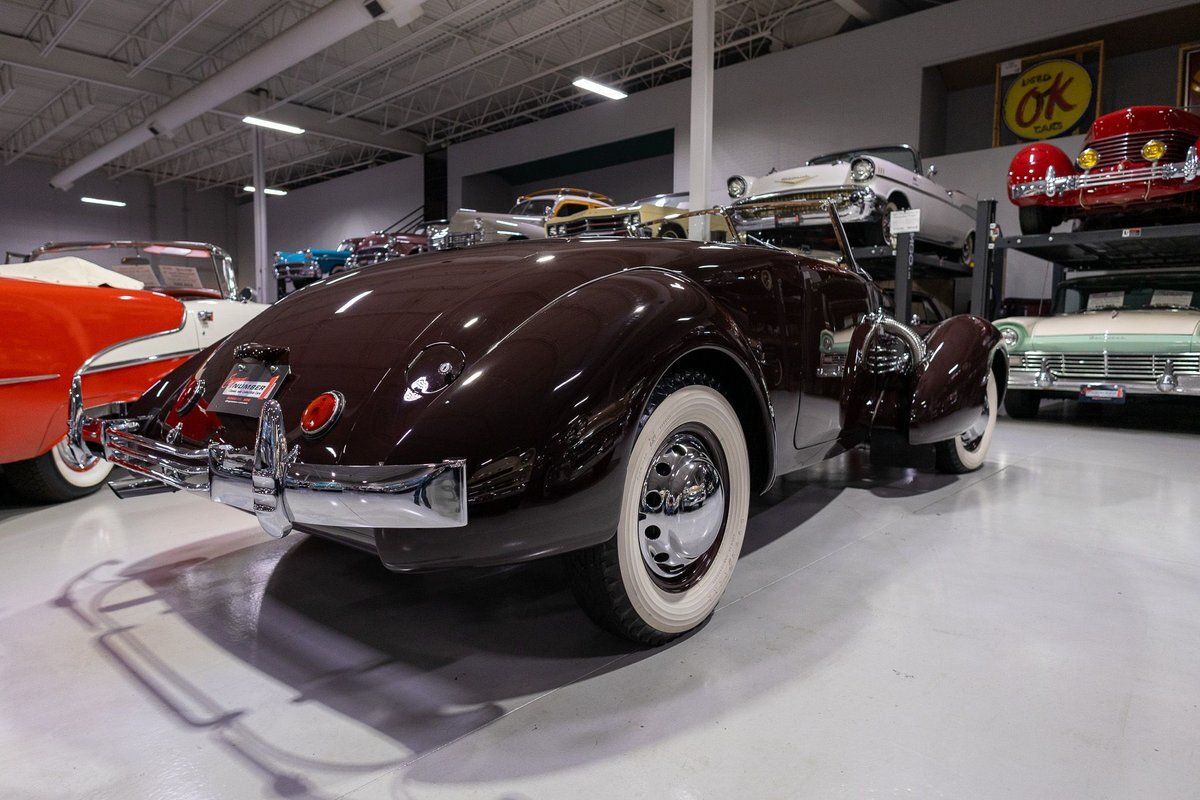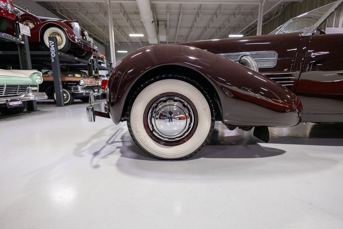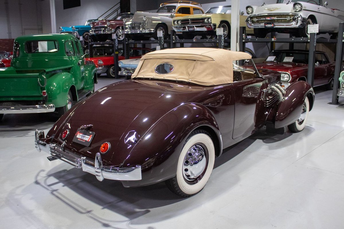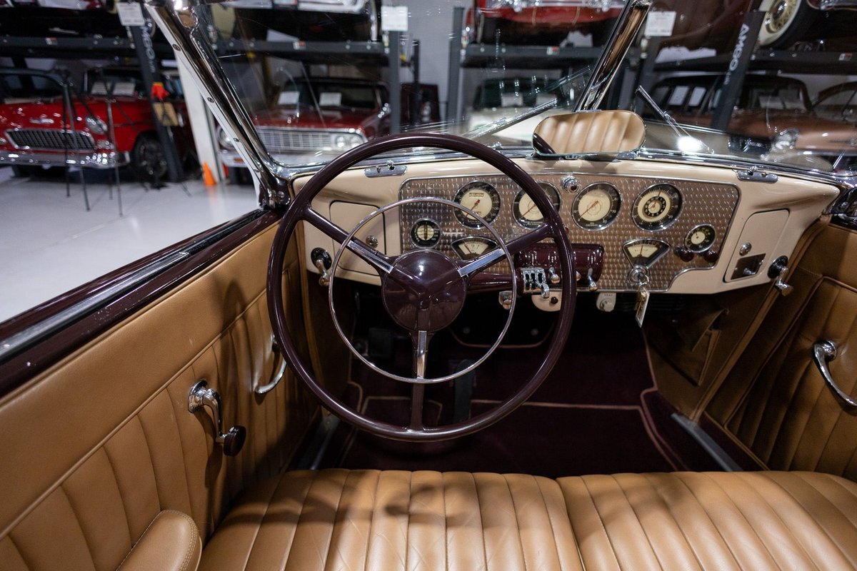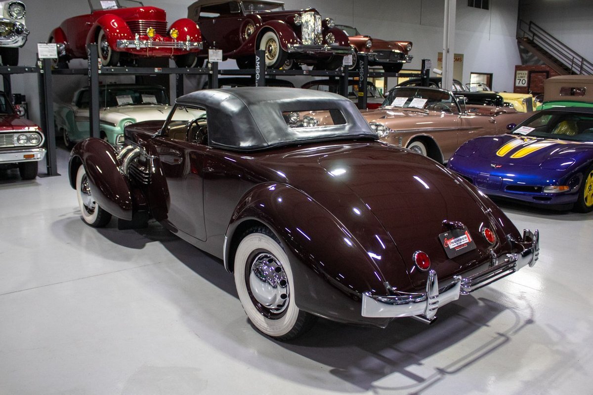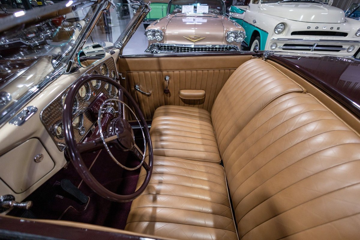This 1937 Cord 812 Supercharged "Sportsman" Cabriolet is a beautiful, supercharged example of one of the most iconic and technologically advanced Pre-War cars ever produced. Established by namesake founder Errett Lobban "E.L." Cord in 1929, the Cord Corporation served as Mr. Cord's holding company for his automotive ventures, including his shares in the Auburn Automobile Company and Dusenberg, Inc., as well as engine builder, Lycoming Mfg. Co. To satisfy E.L. Cord's desire to produce his own namesake motor vehicle, Cord began producing the Cord L-29 in June of 1929 which served as a somewhat intermediate model sitting above the more affordably priced Auburn and below the top-of-the-line Duesenberg. Famously, the 1929 Cord L-29 beat out Ruxton to be "America's First Front-Drive Car;" however, in actuality, several automakers at the turn of the century had experimented with front wheel drive vehicles but none were particularly successful. Nonetheless, the 1929 release of the L-29 could not have come at a worse time, with the onset of the Great Depression starting in late 1929 and then continuing into 1930 and beyond. Consequently, Cord ceased production of the gorgeous L-29 at the end of 1931. By the mid-1930s however, the economy appeared as if it were beginning to recover from the horrific effects of the Depression and the Cord Corporation decided it was time to revive its novel front-wheel-drive automobiles, with a brand new design both inside and out. Styled by famed automobile designer Gordon Buehrig, the new Cord 810/812 models were essentially designed to be the "Baby Duesenberg" and featured an iconic "Coffin Nose" design. In addition to their unique style, the new Cord models are renowned for a number of revolutionary upgrades in automobile design including rear opening hoods, front wheel drive, "semi-automatic" transmissions, hide-away convertible tops, and "roll up headlights." Additionally, Cord's "coffin nose" front wheel drive design allowed for a lower ride height, which eliminated the need for running boards which would soon become obsolete across most American cars produced in the following decade or so. Of course, one of Cord's biggest innovations were introduced in 1937 with the incorporation of a supercharger that bumped the 812's horsepower from 125 to 170! In spite of all of the Cord's technological and design innovations, Cord's financial issues finally put a halt on production in August 1937, with the company producing a mere 2,992 810 and 812 models during its short run from 1936-1937. In total, a mere 2,992 "Coffin Nose" Cords were produced during their short production run from 1936 through 1937 and it is believed that just a handful of Supercharged "Sportsman" Cabriolet Convertible Coupes were produced in this configuration, which means that this particular example is quite a rare piece of automotive history. Due to its unique design, mechanical innovations, and overall rarity, the Classic Car Club of America (CCCA) has designated all Cord automobiles as Full Classics which means this '37 Cord 812 SC "Sportsman" is eligible to participate in CCCA events and CARavans. This particular example comes to us from the hands of a long line of prominent collectors, and most recently from an esteemed collection where it resided for a period of over ten years. Under the iconic, revolutionary rear-hinged hood on this '37 Cord 812 is a supercharged Lycoming 288.64 Cu. In. V8 fed by a single 2 barrel carburetor that together were said to have created an impressive 170 horsepower when new. The 289 Lycoming V8 is mated to a 4 speed manual transmission that shifted using the innovative remote controlled column-mounted pre-selector shifter. Unlike virtually all pre-war classic cars which were rear wheel drive, power is sent from the supercharged Lycoming powerplant via the transaxle to the front wheels on this front wheel drive Cord. This '37 Cord SC Sportsman rides on a set of wide whitewall bias-ply tires, accented with chrome wheelcovers and beauty rings which gives this convertible an upscale look whether parked at the local car show or cruising down the road. The luxurious look and feel of this 812 Sportsman Convertible is further supplemented with front and rear bumper guards and a pair of amber-lensed Cord-branded fog lights. In addition to the fog lamps, both headlights manually crank up and down which is one of the many technological and forward-thinking innovations of the Cord 810/812 series. This 1937 Sportsman is equipped with a manually operated beige cloth convertible soft top along with an accessory removable hardtop, both of which appear to be in wonderful condition. The exterior on this '37 Cord 812 Sportsman has been refinished in a beautiful Dark Thrust Brown paint that completes the stunning exterior look of the CCCA Full Classic. The interior on this 1937 Cord 812 Sportsman Convertible Coupe is absolutely gorgeous! The bench seat has been reupholstered with beautiful tan leather that provides a beautiful contrast from the rich exterior appearance. The matching upholstered door panels and armrests, along with the burgundy carpeting, dark ivory painted dash with its engine-turned instrument panel, and body color-matched steering wheel with chrome horn ring are all in fantastic condition as well and appear to be in their stock configuration. The instrument cluster features a wide array of instrumentation and gauges including a 150 MPH speedometer, 5,000 RPM tachometer, oil pressure gauge, temperature gauge, amp gauge, and fuel gauge. The dash is completed with an AM radio and full-size clock, as well as with a pair of locking gloveboxes that straddle the instrument panel. Whether you're buying your first full classic car or you're an established ACD or CCCA collector, this 1937 Cord 812 "Sportsman" Cabriolet would make an excellent choice. Give Ellingson's a call today at763-428-7337!