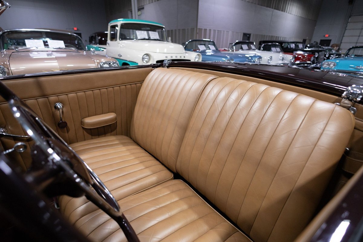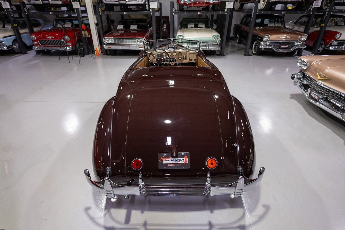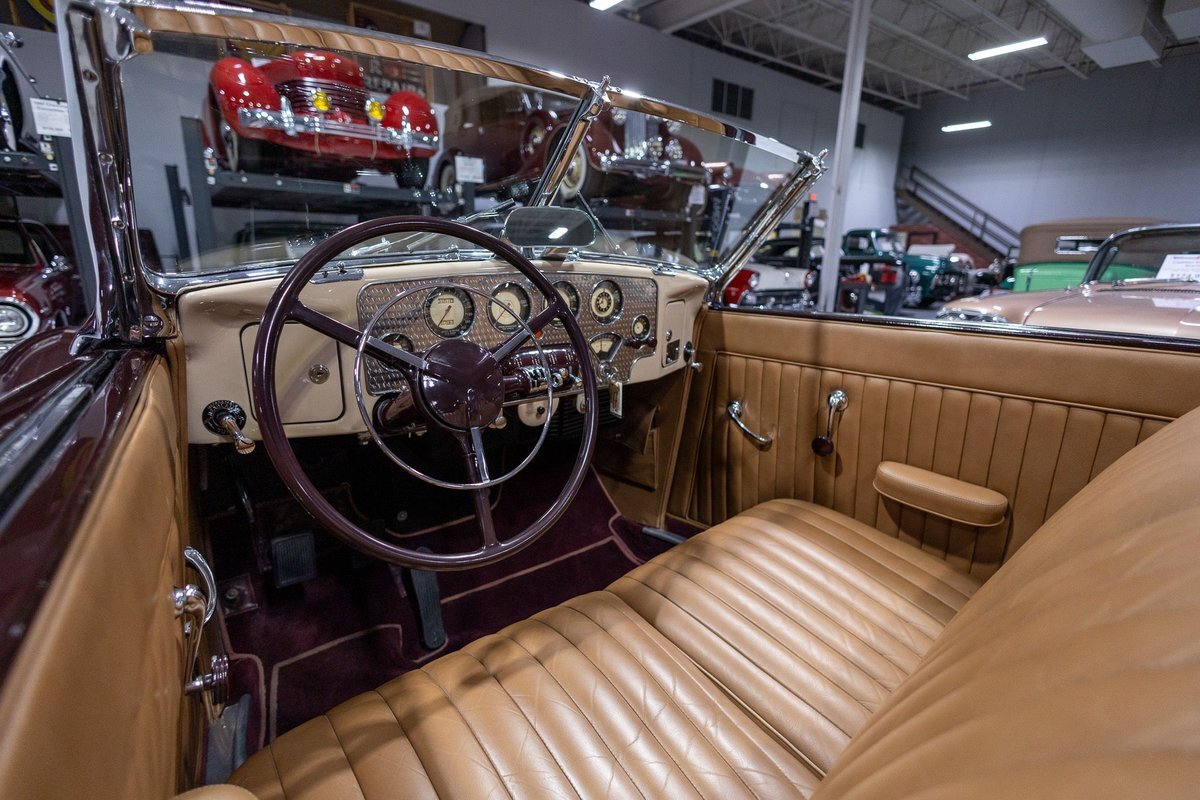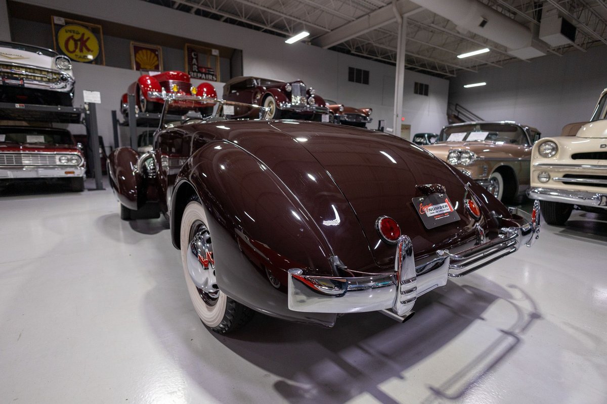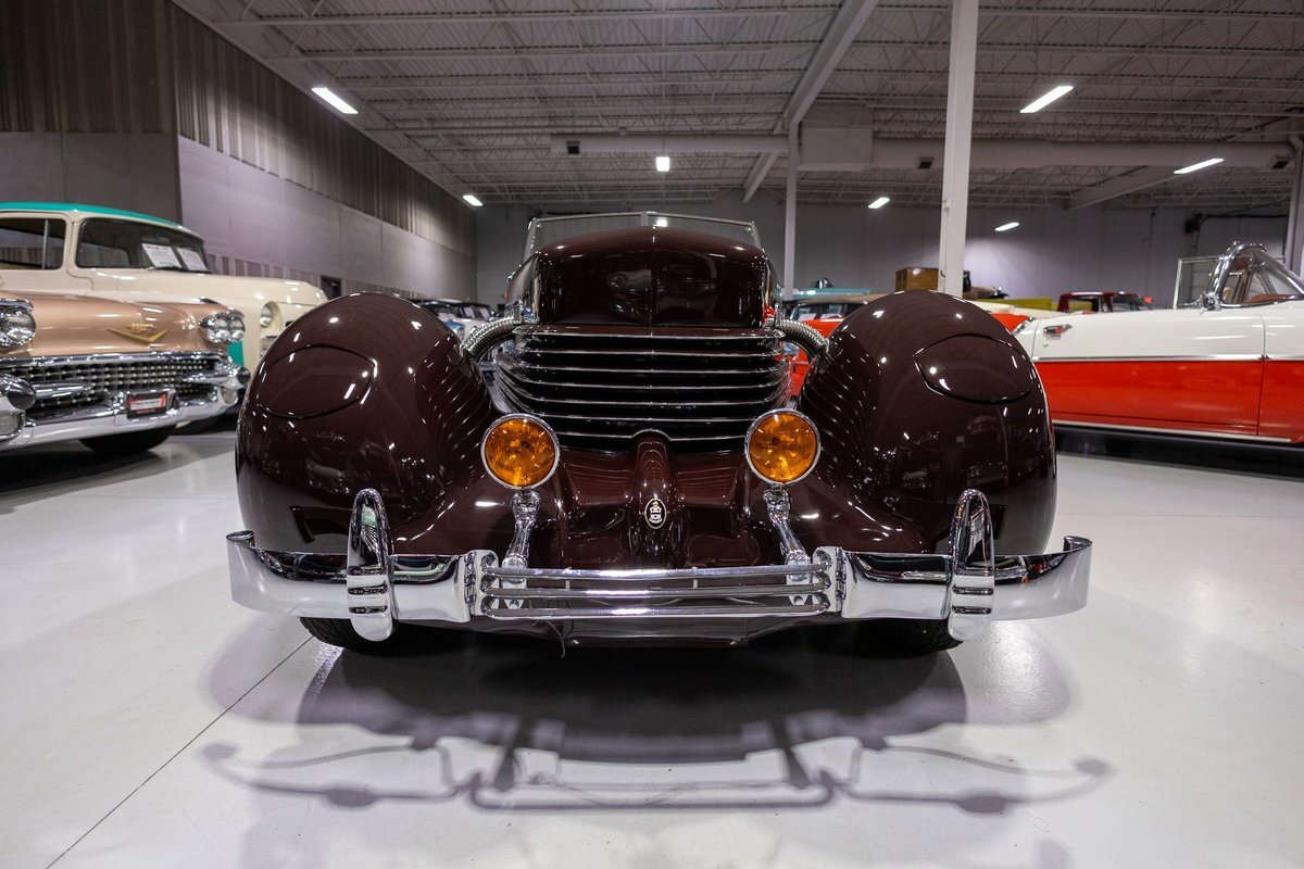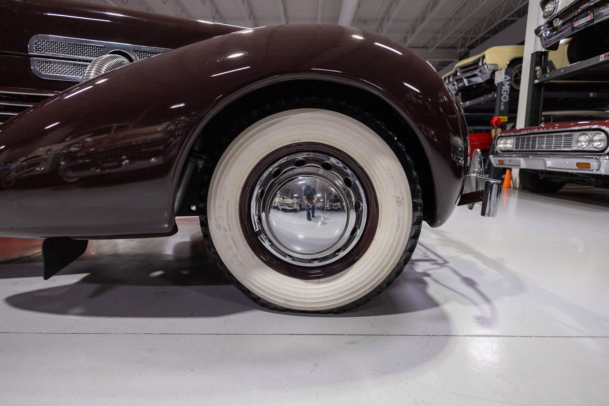 This 1937 Cord 812 Supercharged "Sportsman" Cabriolet is a beautiful, supercharged example of one of the most iconic and technologically advanced Pre-War cars ever produced. Established by namesake founder Errett Lobban "E.L." Cord in 1929, the Cord Corporation served as Mr. Cord's holding company for his automotive ventures, including his shares in the Auburn Automobile Company and Dusenberg, Inc., as well as engine builder, Lycoming Mfg. Co. To satisfy E.L. Cord's desire to produce his own namesake motor vehicle, Cord began producing the Cord L-29 in June of 1929 which served as a somewhat intermediate model sitting above the more affordably priced Auburn and below the top-of-the-line Duesenberg. Famously, the 1929 Cord L-29 beat out Ruxton to be "America's First Front-Drive Car;" however, in actuality, several automakers at the turn of the century had experimented with front wheel drive vehicles but none were particularly successful. Nonetheless, the 1929 release of the L-29 could not have come at a worse time, with the onset of the Great Depression starting in late 1929 and then continuing into 1930 and beyond. Consequently, Cord ceased production of the gorgeous L-29 at the end of 1931. By the mid-1930s however, the economy appeared as if it were beginning to recover from the horrific effects of the Depression and the Cord Corporation decided it was time to revive its novel front-wheel-drive automobiles, with a brand new design both inside and out. Styled by famed automobile designer Gordon Buehrig, the new Cord 810/812 models were essentially designed to be the "Baby Duesenberg" and featured an iconic "Coffin Nose" design. In addition to their unique style, the new Cord models are renowned for a number of revolutionary upgrades in automobile design including rear opening hoods, front wheel drive, "semi-automatic" transmissions, hide-away convertible tops, and "roll up headlights." Additionally, Cord's "coffin nose" front wheel drive design allowed for a lower ride height, which eliminated the need for running boards which would soon become obsolete across most American cars produced in the following decade or so. Of course, one of Cord's biggest innovations were introduced in 1937 with the incorporation of a supercharger that bumped the 812's horsepower from 125 to 170! In spite of all of the Cord's technological and design innovations, Cord's financial issues finally put a halt on production in August 1937, with the company producing a mere 2,992 810 and 812 models during its short run from 1936-1937. In total, a mere 2,992 "Coffin Nose" Cords were produced during their short production run from 1936 through 1937 and it is believed that just a handful of Supercharged "Sportsman" Cabriolet Convertible Coupes were produced in this configuration, which means that this particular example is quite a rare piece of automotive history. Due to its unique design, mechanical innovations, and overall rarity, the Classic Car Club of America (CCCA) has designated all Cord automobiles as Full Classics which means this '37 Cord 812 SC "Sportsman" is eligible to participate in CCCA events and CARavans. This particular example comes to us from the hands of a long line of prominent collectors, and most recently from an esteemed collection where it resided for a period of over ten years. Under the iconic, revolutionary rear-hinged hood on this '37 Cord 812 is a supercharged Lycoming 288.64 Cu. In. V8 fed by a single 2 barrel carburetor that together were said to have created an impressive 170 horsepower when new. The 289 Lycoming V8 is mated to a 4 speed manual transmission that shifted using the innovative remote controlled column-mounted pre-selector shifter. Unlike virtually all pre-war classic cars which were rear wheel drive, power is sent from the supercharged Lycoming powerplant via the transaxle to the front wheels on this front wheel drive Cord. This '37 Cord SC Sportsman rides on a set of wide whitewall bias-ply tires, accented with chrome wheelcovers and beauty rings which gives this convertible an upscale look whether parked at the local car show or cruising down the road. The luxurious look and feel of this 812 Sportsman Convertible is further supplemented with front and rear bumper guards and a pair of amber-lensed Cord-branded fog lights. In addition to the fog lamps, both headlights manually crank up and down which is one of the many technological and forward-thinking innovations of the Cord 810/812 series. This 1937 Sportsman is equipped with a manually operated beige cloth convertible soft top along with an accessory removable hardtop, both of which appear to be in wonderful condition. The exterior on this '37 Cord 812 Sportsman has been refinished in a beautiful Dark Thrust Brown paint that completes the stunning exterior look of the CCCA Full Classic. The interior on this 1937 Cord 812 Sportsman Convertible Coupe is absolutely gorgeous! The bench seat has been reupholstered with beautiful tan leather that provides a beautiful contrast from the rich exterior appearance. The matching upholstered door panels and armrests, along with the burgundy carpeting, dark ivory painted dash with its engine-turned instrument panel, and body color-matched steering wheel with chrome horn ring are all in fantastic condition as well and appear to be in their stock configuration. The instrument cluster features a wide array of instrumentation and gauges including a 150 MPH speedometer, 5,000 RPM tachometer, oil pressure gauge, temperature gauge, amp gauge, and fuel gauge. The dash is completed with an AM radio and full-size clock, as well as with a pair of locking gloveboxes that straddle the instrument panel. Whether you're buying your first full classic car or you're an established ACD or CCCA collector, this 1937 Cord 812 "Sportsman" Cabriolet would make an excellent choice. Give Ellingson's a call today at763-428-7337!