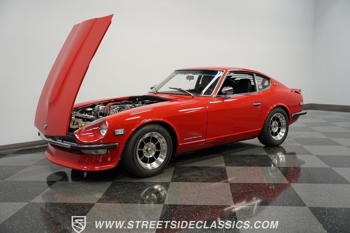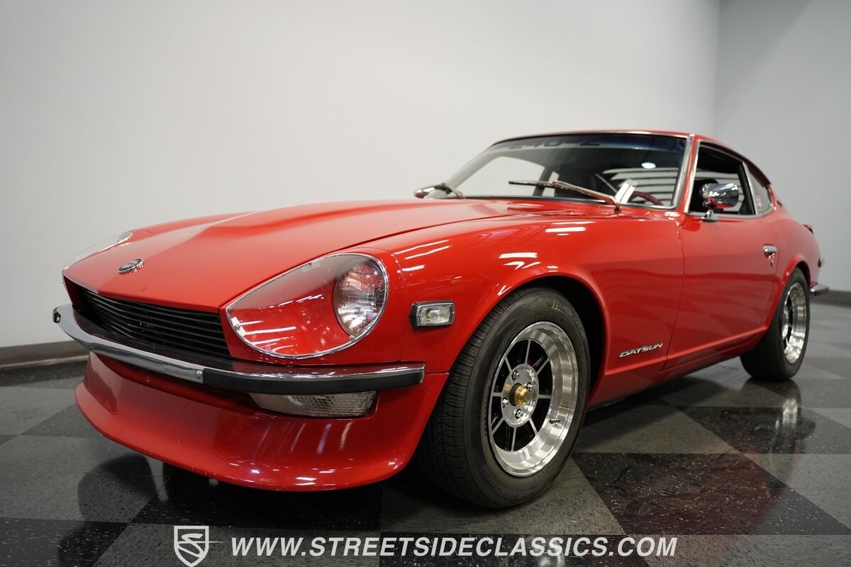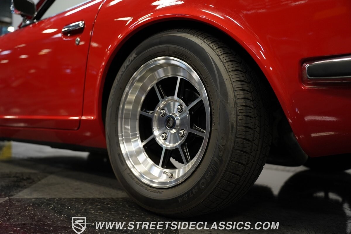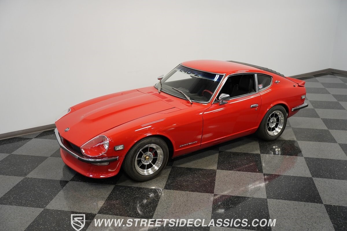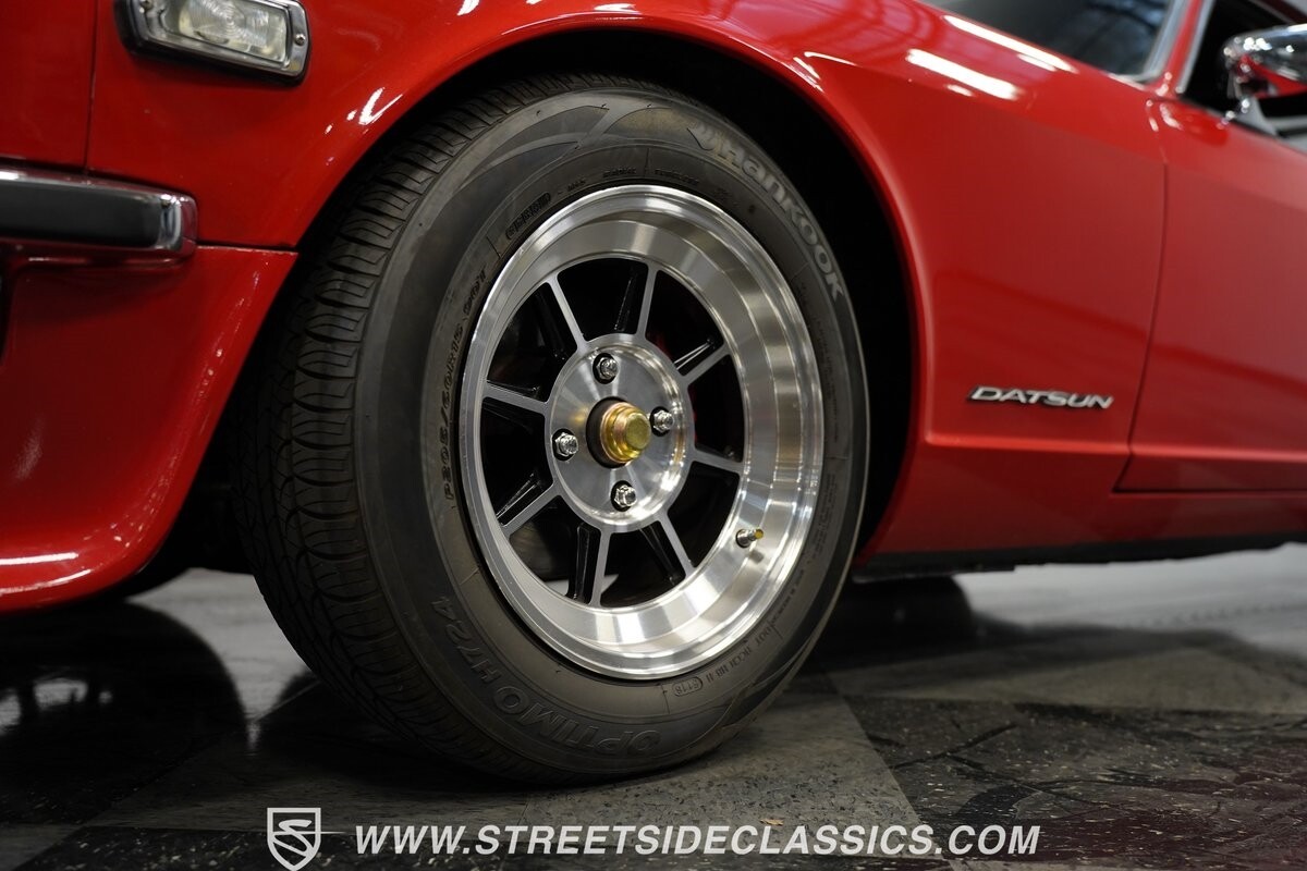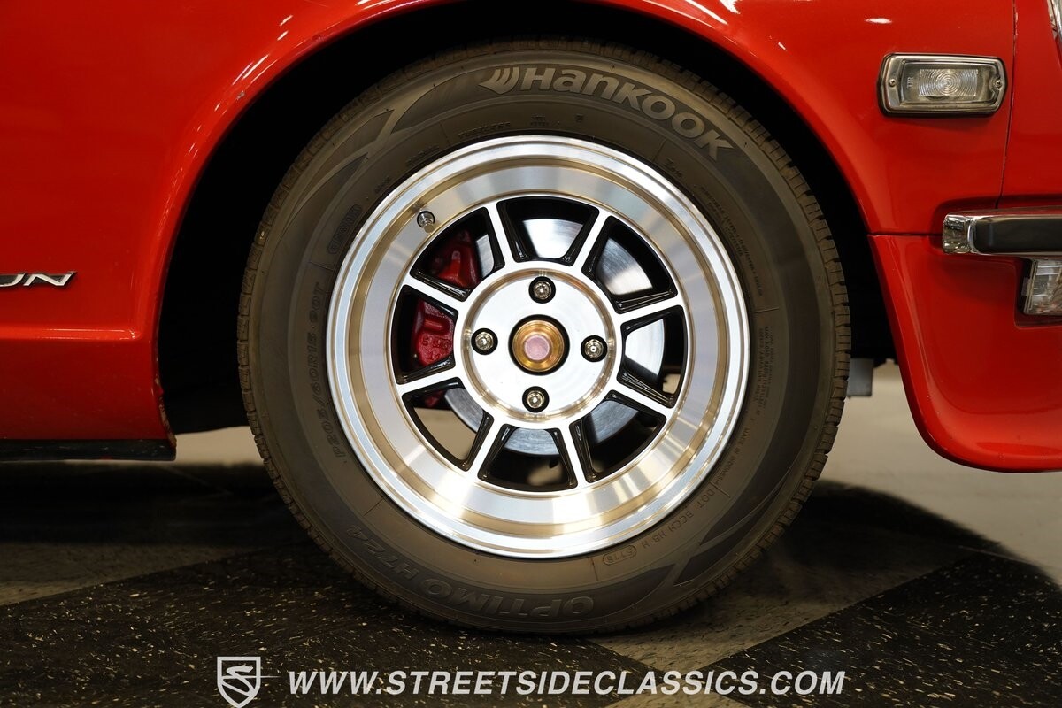 Get ready to experience the thrill of driving this fierce 1970 Datsun 240Z Series 1. Its sleek, muscular body is cloaked in a mesmerizing red paint with a heavy dose of gold flake that dances in the sunlight. The aggressive front splitter, short Japanese market bumpers, rear louvers, and subtle hatch wing all contribute to its unapologetic sportiness. This Z rides on 15-inch Rota alloy wheels, wrapped in 205/60R15 Hankook Optimo H724 tires from 2016 that grip the road with tenacity.