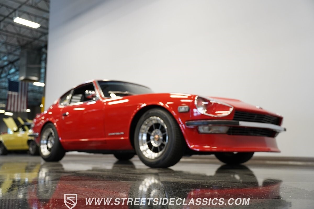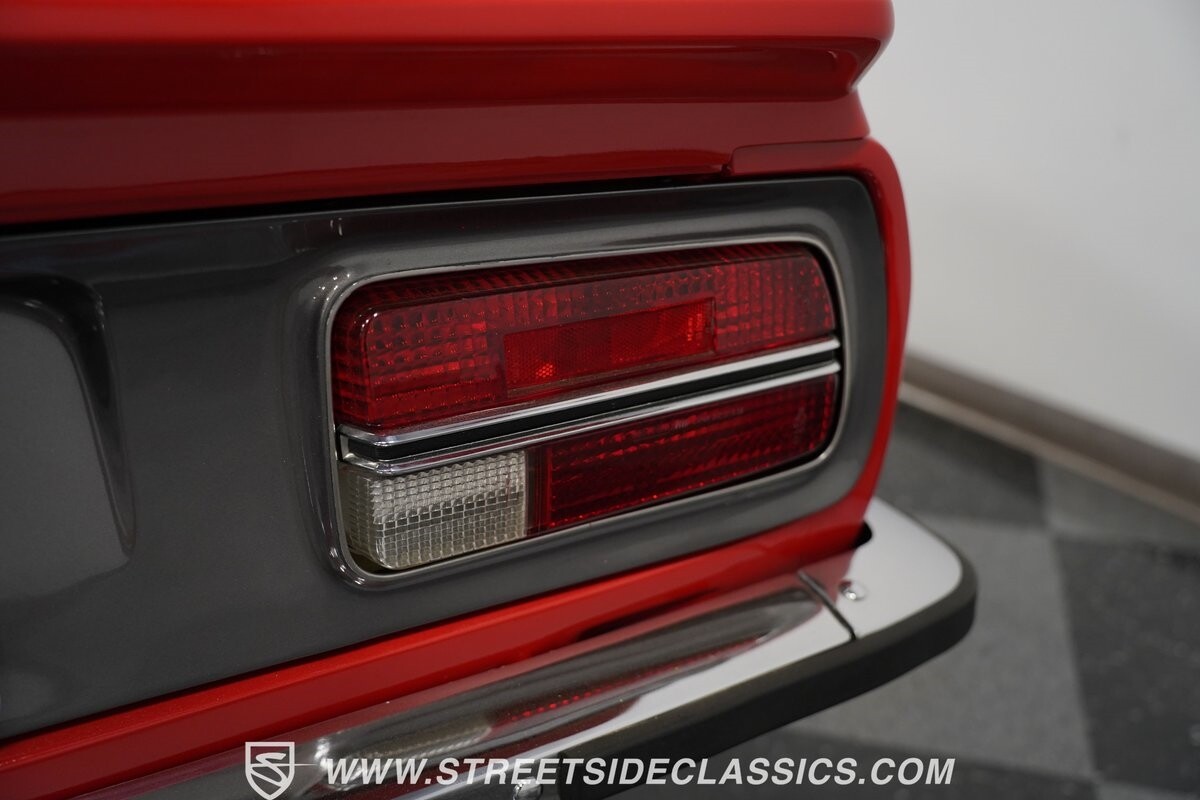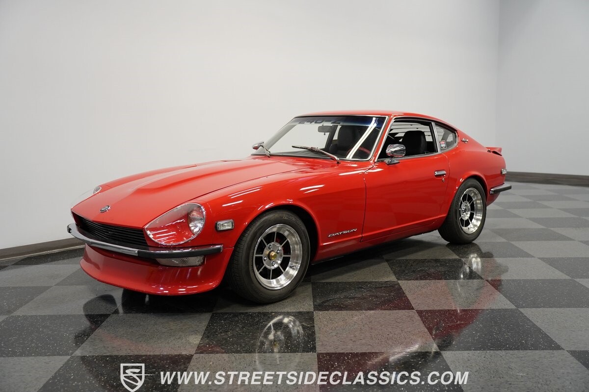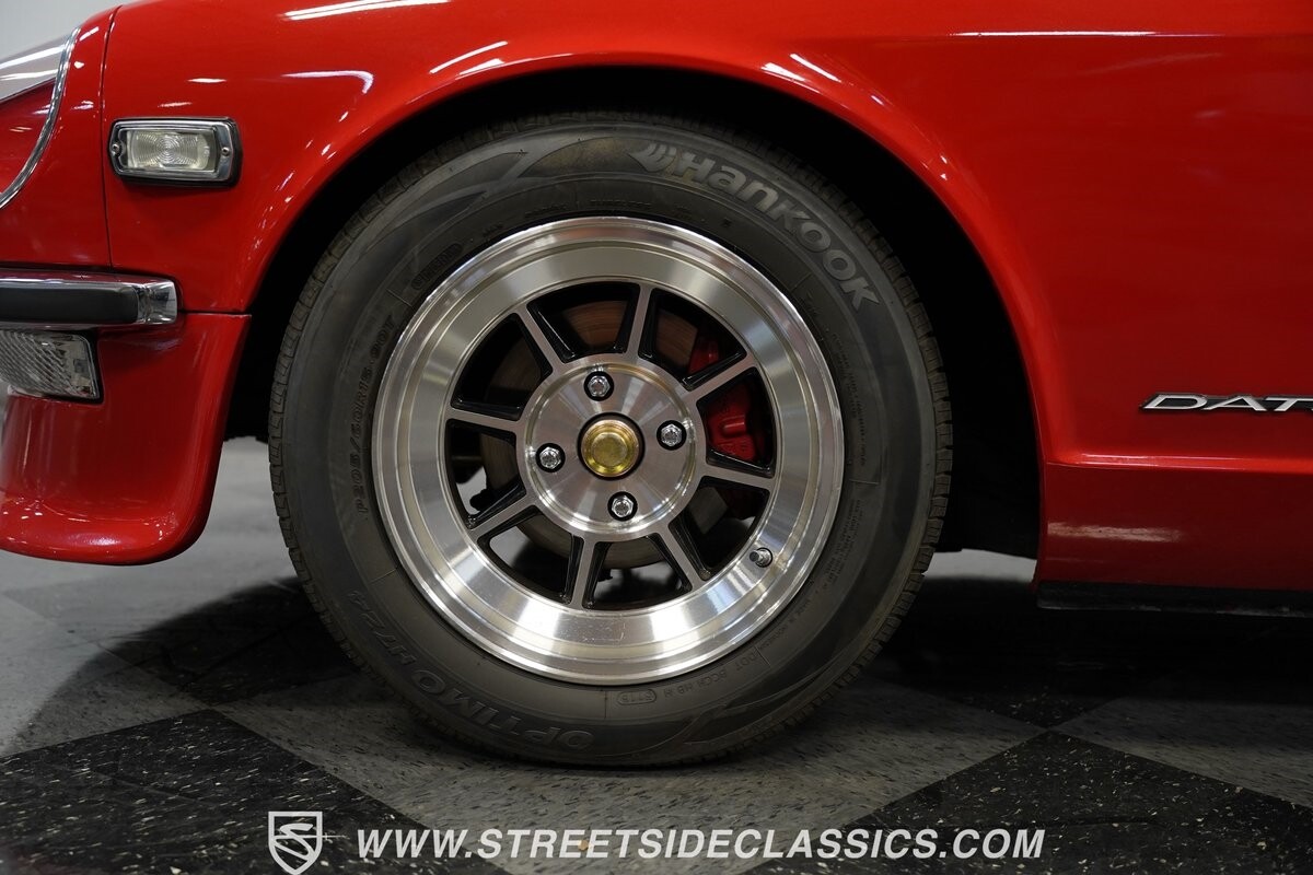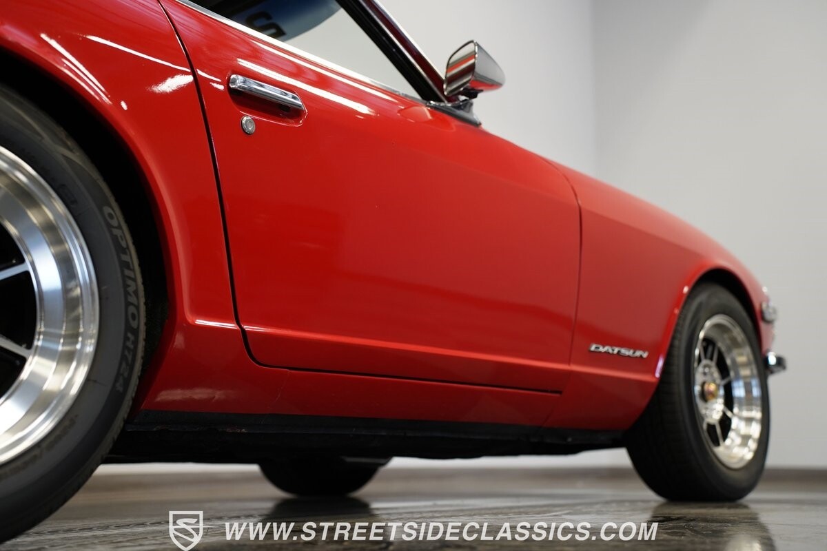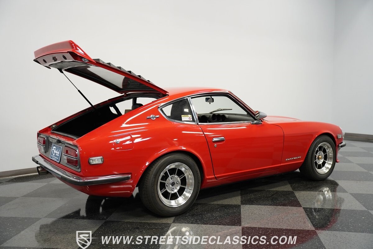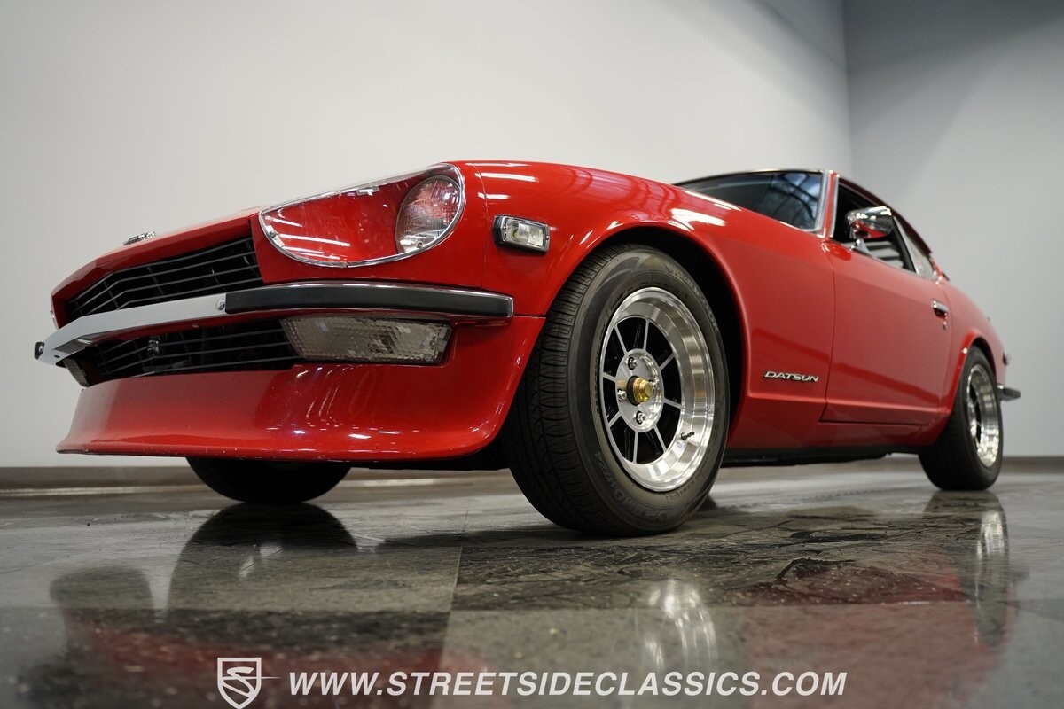 Get ready to experience the thrill of driving this fierce 1970 Datsun 240Z Series 1. Its sleek, muscular body is cloaked in a mesmerizing red paint with a heavy dose of gold flake that dances in the sunlight. The aggressive front splitter, short Japanese market bumpers, rear louvers, and subtle hatch wing all contribute to its unapologetic sportiness. This Z rides on 15-inch Rota alloy wheels, wrapped in 205/60R15 Hankook Optimo H724 tires from 2016 that grip the road with tenacity.
