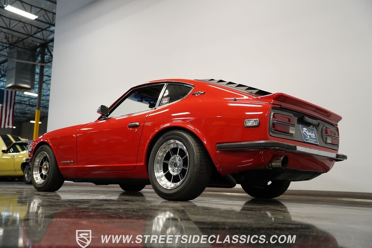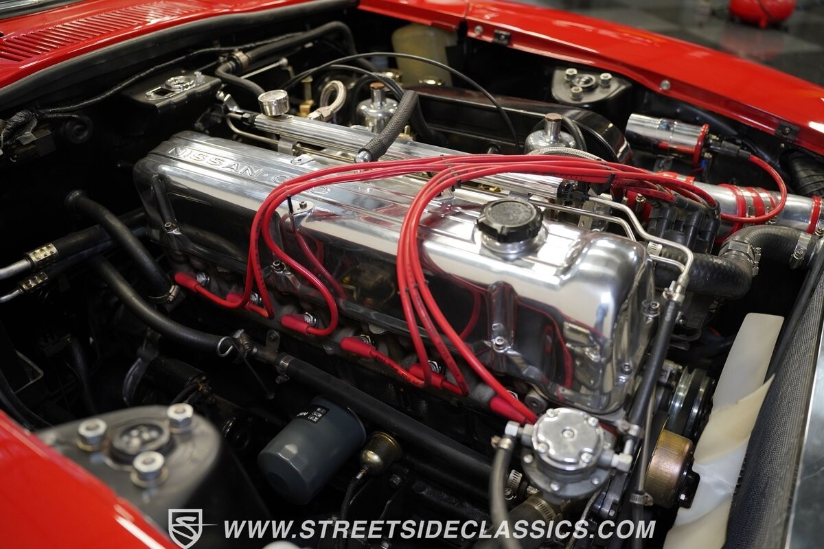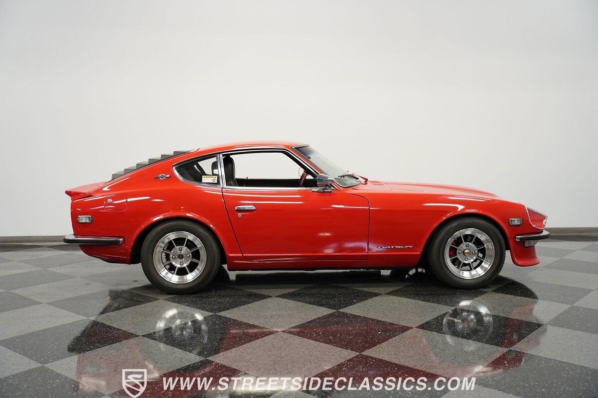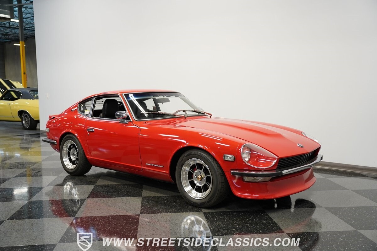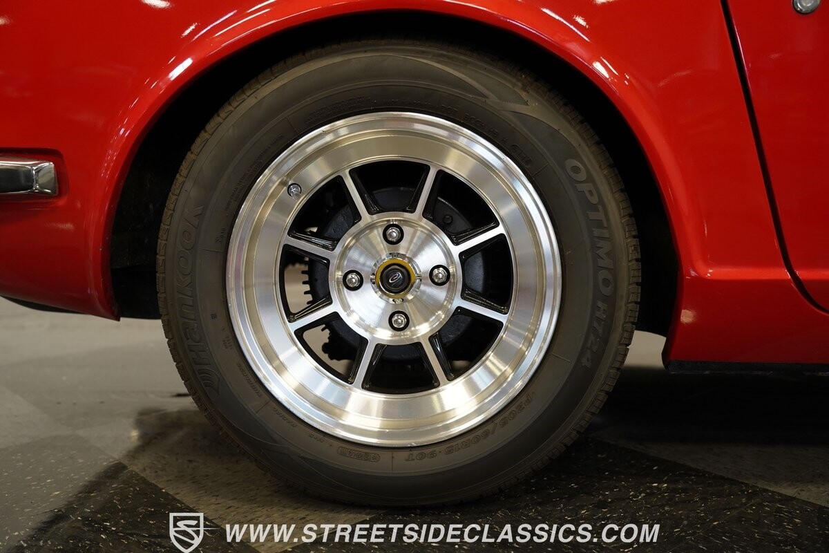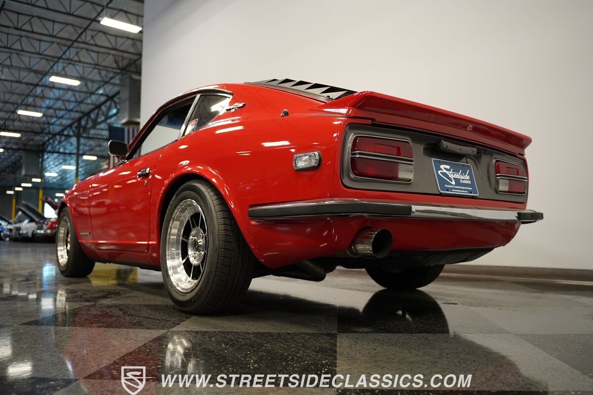 Get ready to experience the thrill of driving this fierce 1970 Datsun 240Z Series 1. Its sleek, muscular body is cloaked in a mesmerizing red paint with a heavy dose of gold flake that dances in the sunlight. The aggressive front splitter, short Japanese market bumpers, rear louvers, and subtle hatch wing all contribute to its unapologetic sportiness. This Z rides on 15-inch Rota alloy wheels, wrapped in 205/60R15 Hankook Optimo H724 tires from 2016 that grip the road with tenacity.