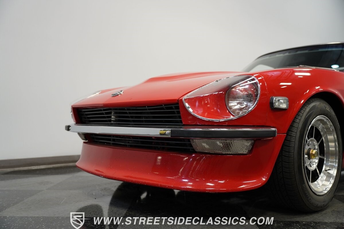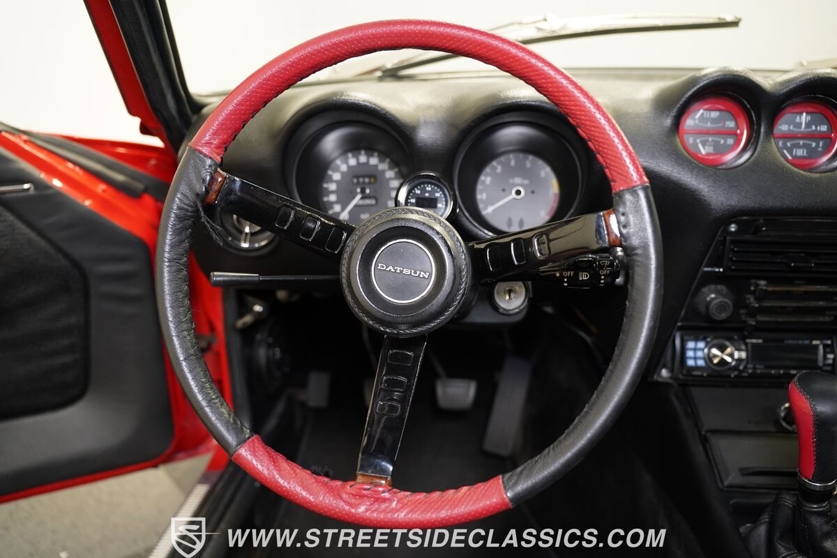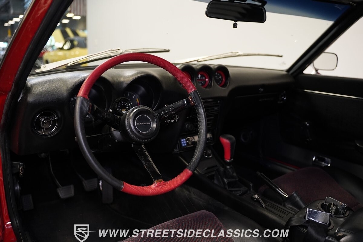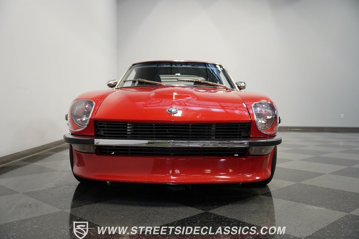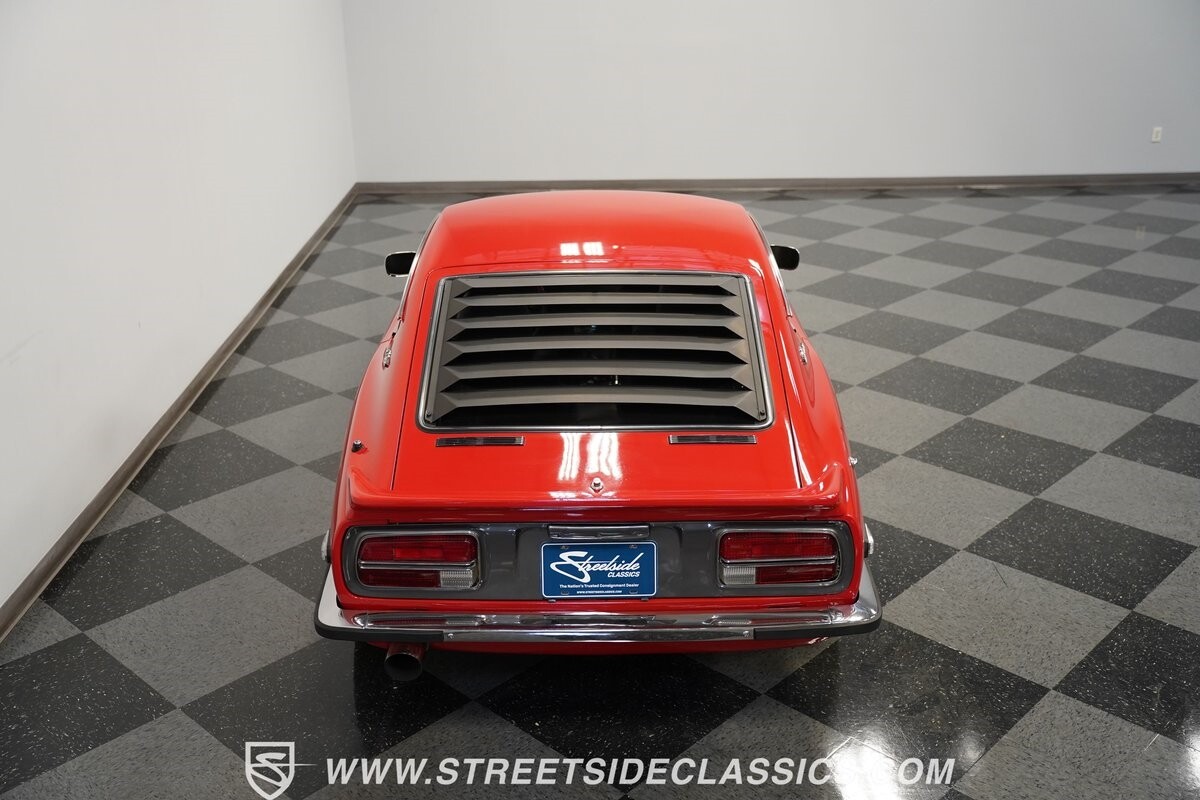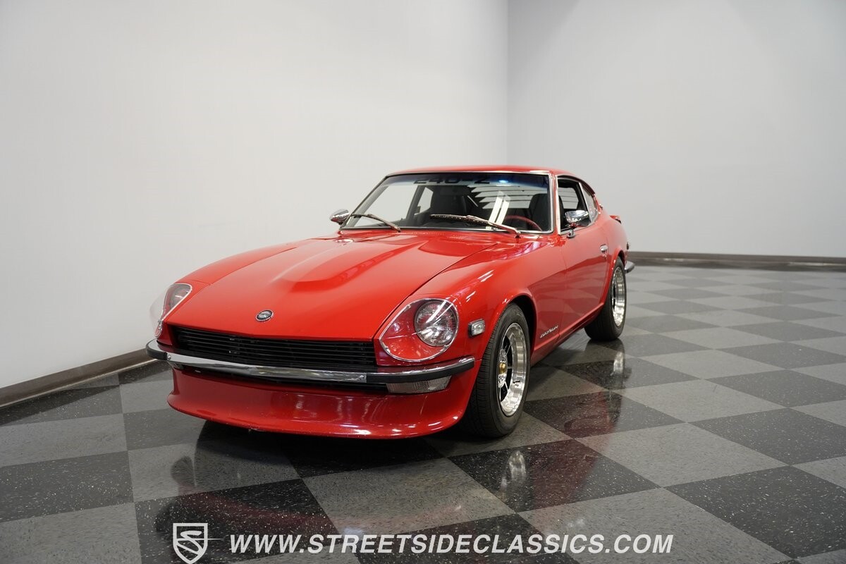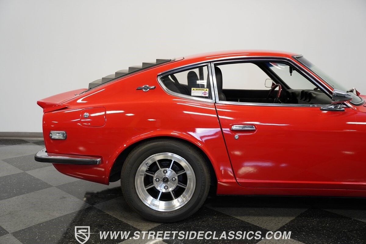 Get ready to experience the thrill of driving this fierce 1970 Datsun 240Z Series 1. Its sleek, muscular body is cloaked in a mesmerizing red paint with a heavy dose of gold flake that dances in the sunlight. The aggressive front splitter, short Japanese market bumpers, rear louvers, and subtle hatch wing all contribute to its unapologetic sportiness. This Z rides on 15-inch Rota alloy wheels, wrapped in 205/60R15 Hankook Optimo H724 tires from 2016 that grip the road with tenacity.