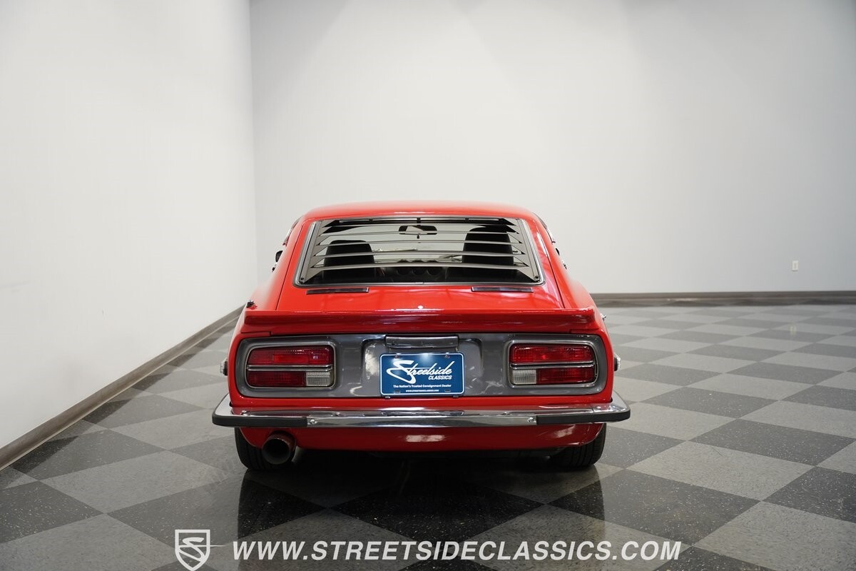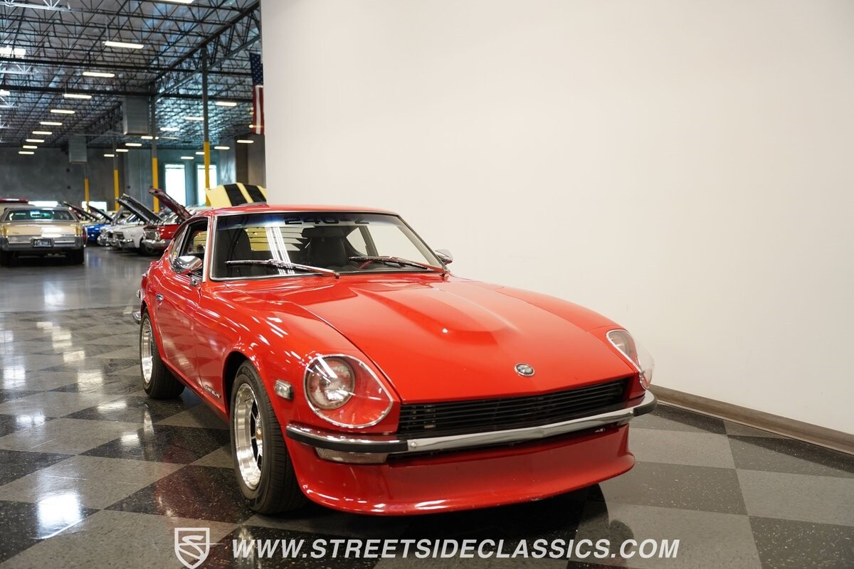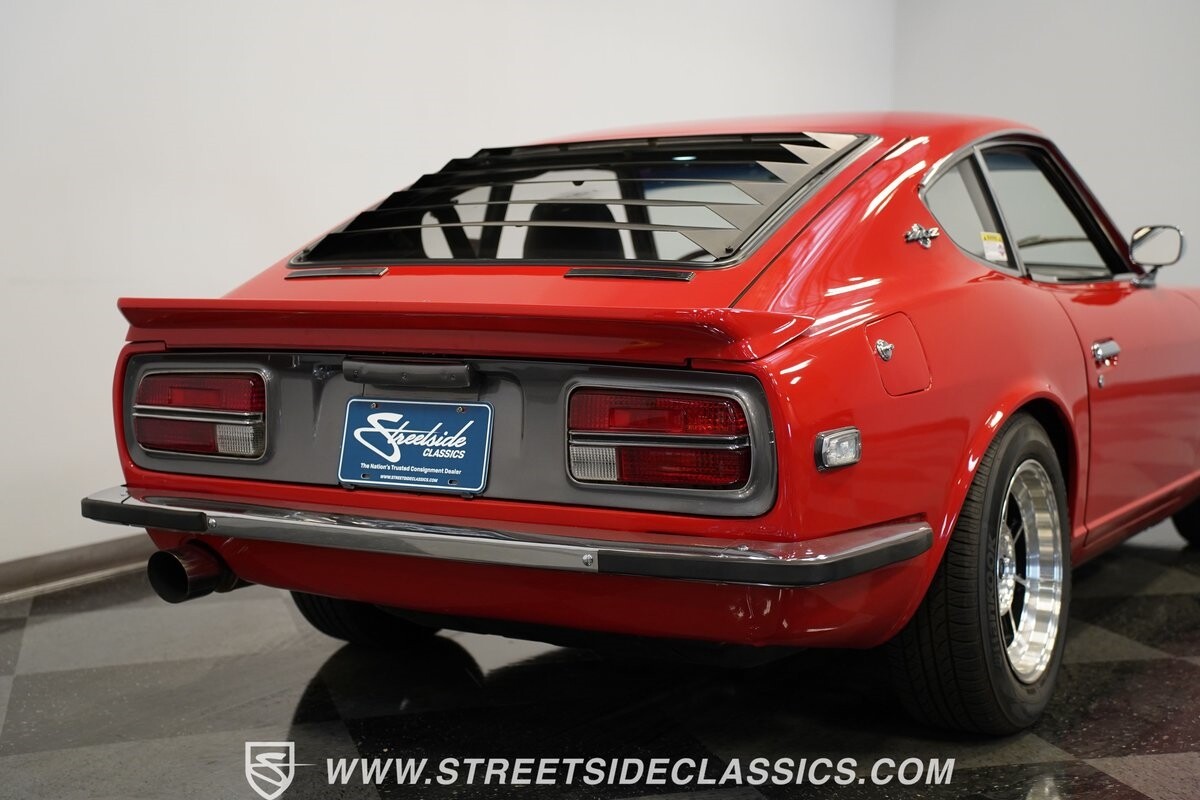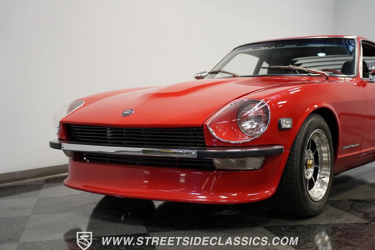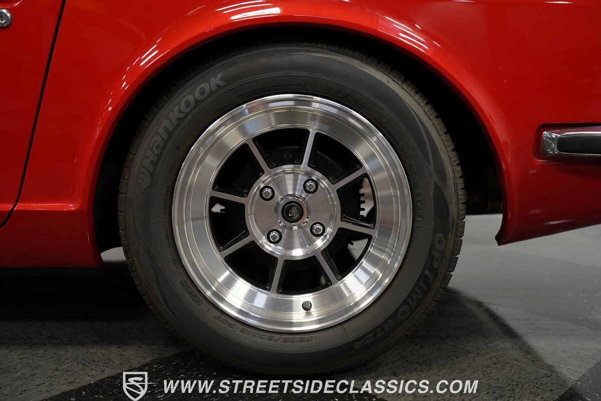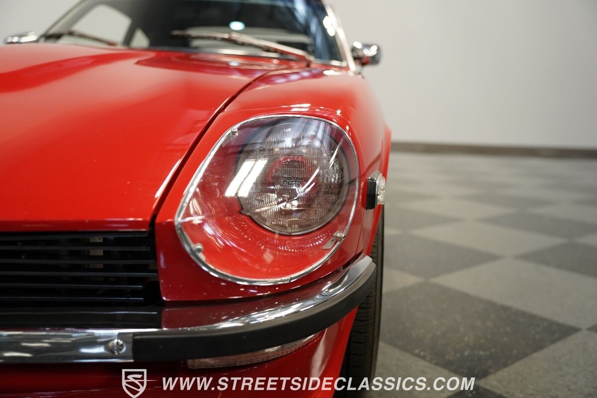 Get ready to experience the thrill of driving this fierce 1970 Datsun 240Z Series 1. Its sleek, muscular body is cloaked in a mesmerizing red paint with a heavy dose of gold flake that dances in the sunlight. The aggressive front splitter, short Japanese market bumpers, rear louvers, and subtle hatch wing all contribute to its unapologetic sportiness. This Z rides on 15-inch Rota alloy wheels, wrapped in 205/60R15 Hankook Optimo H724 tires from 2016 that grip the road with tenacity.