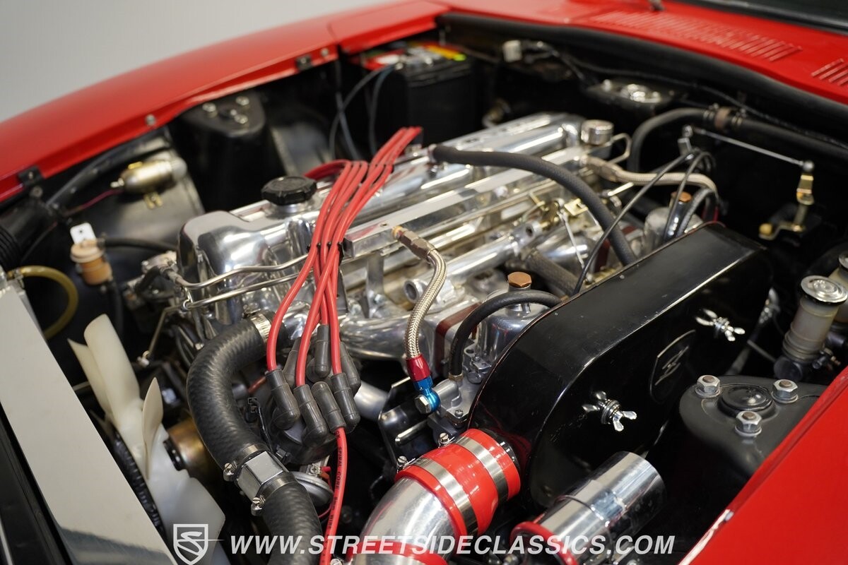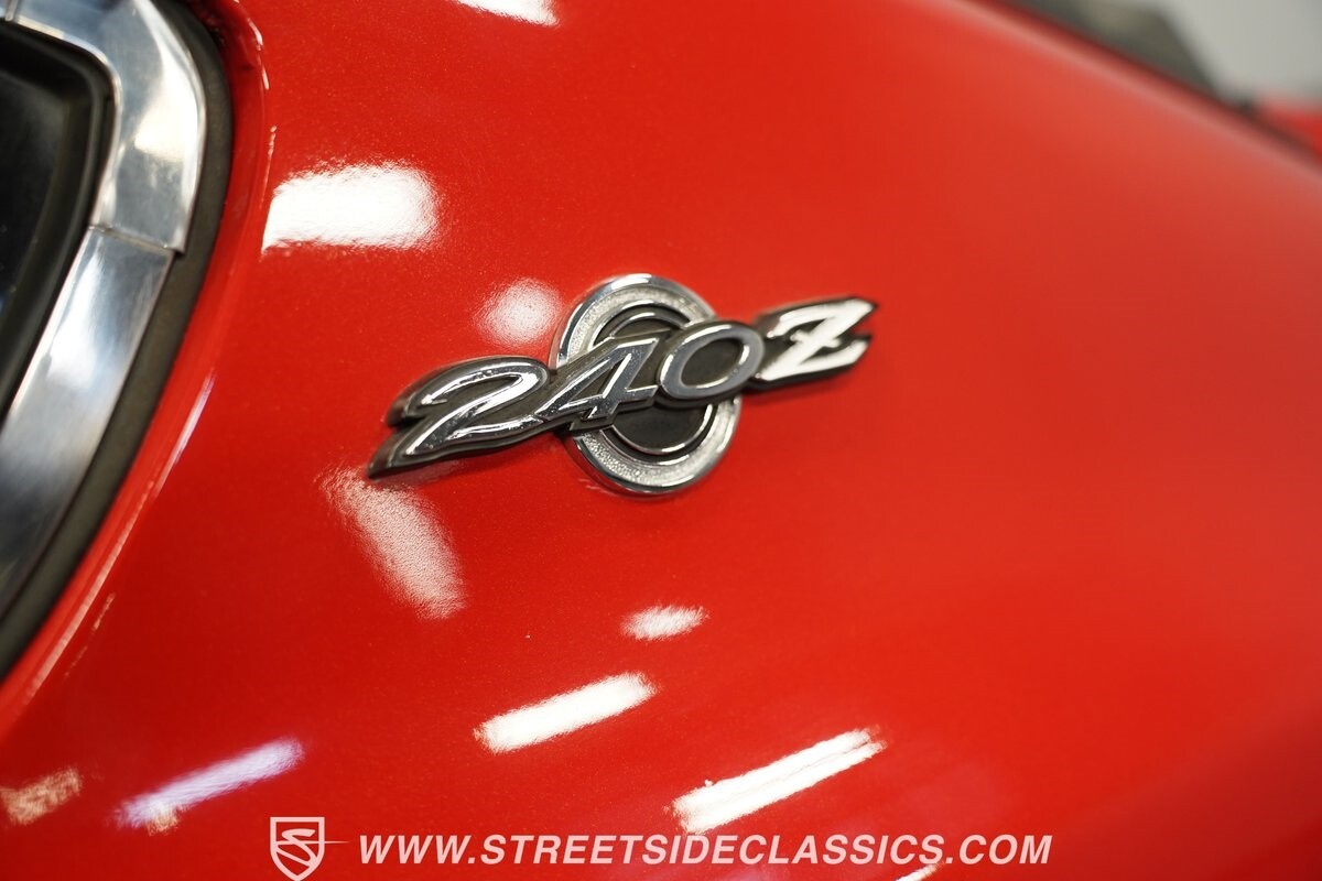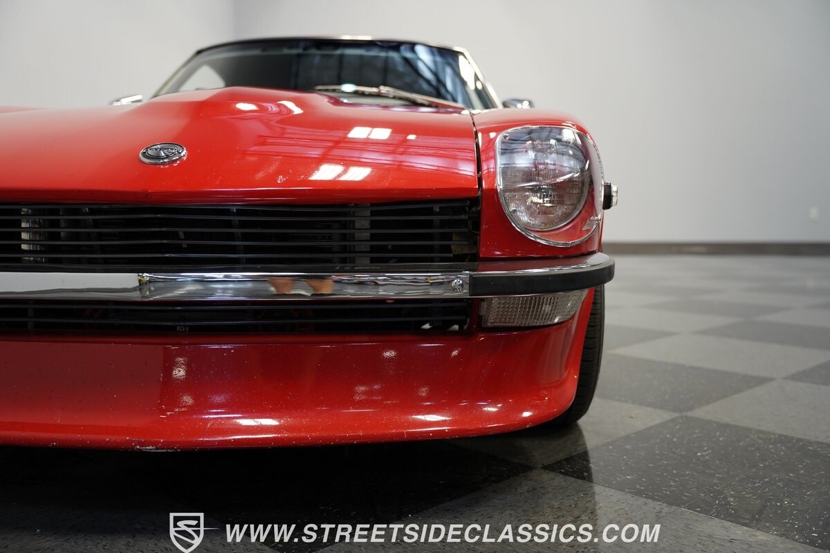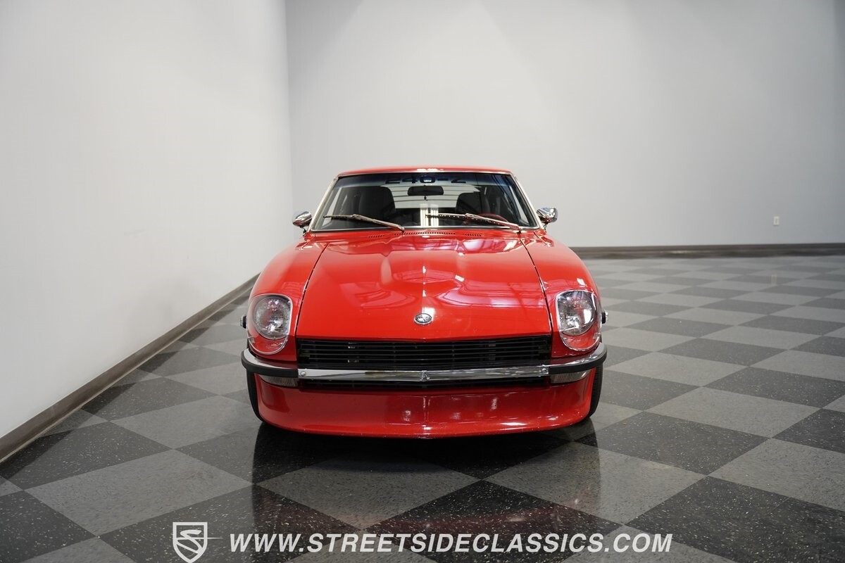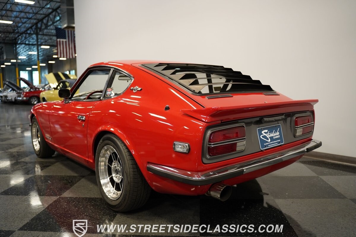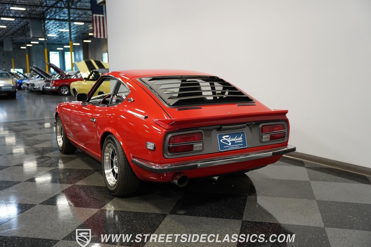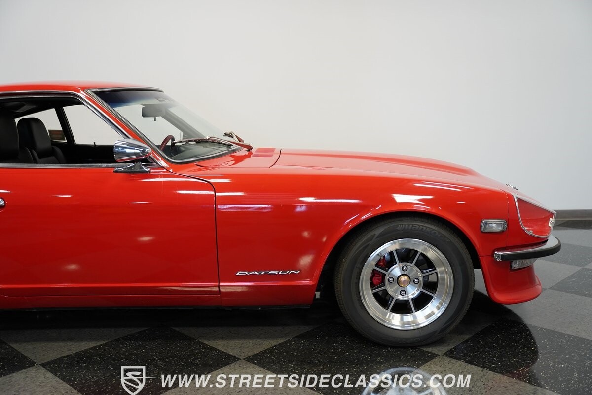 Get ready to experience the thrill of driving this fierce 1970 Datsun 240Z Series 1. Its sleek, muscular body is cloaked in a mesmerizing red paint with a heavy dose of gold flake that dances in the sunlight. The aggressive front splitter, short Japanese market bumpers, rear louvers, and subtle hatch wing all contribute to its unapologetic sportiness. This Z rides on 15-inch Rota alloy wheels, wrapped in 205/60R15 Hankook Optimo H724 tires from 2016 that grip the road with tenacity.