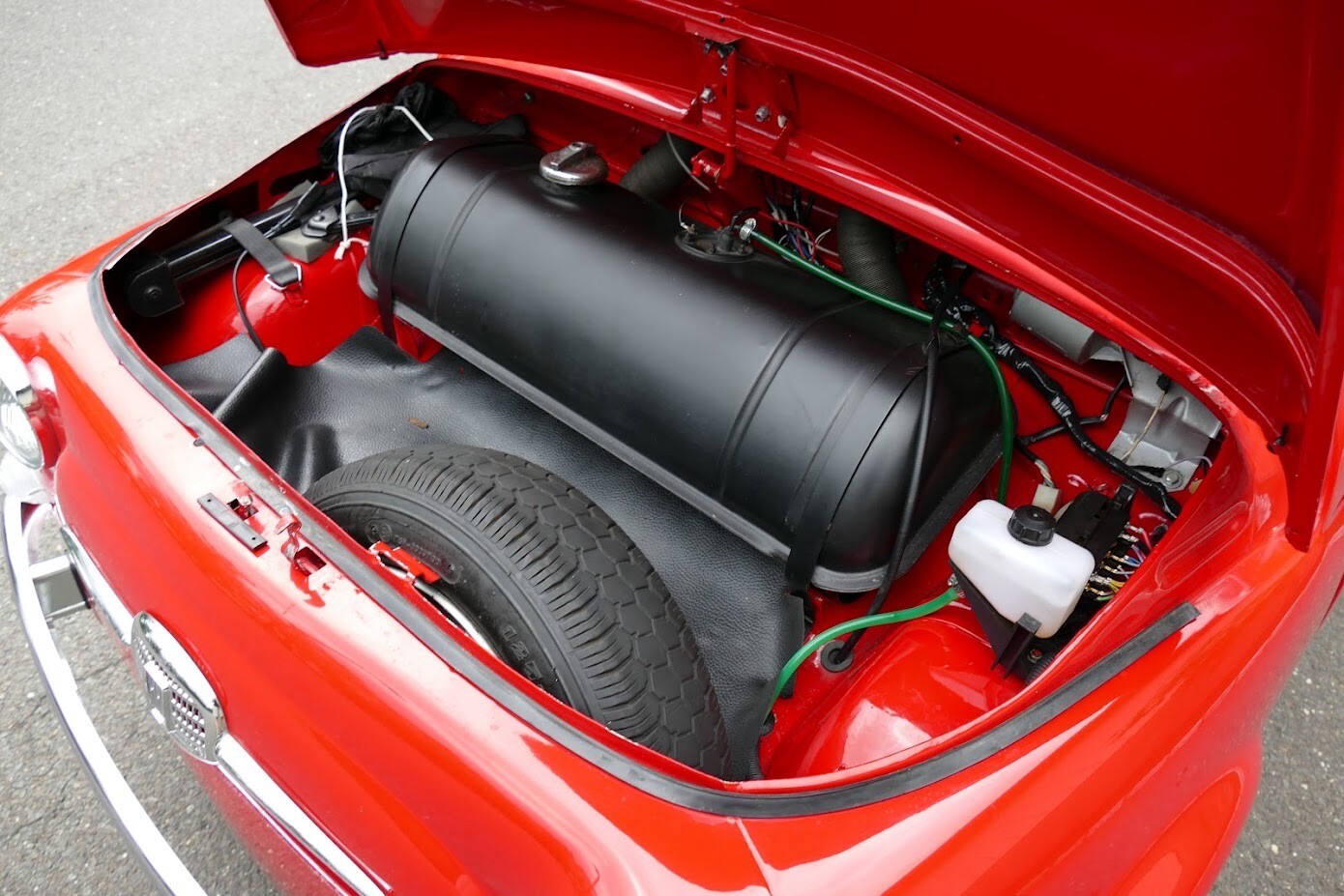 This 1967 Fiat 500F was refurbished and modified during prior ownership, with work including refinishing the exterior in red, reupholstering the two-tone seats, and installation of a 600cc twin. Equipment includes a four-speed manual transaxle, a sliding cloth sunroof, vent windows, a parcel rack, and 12? wheels. The selling dealer acquired the car out of New Jersey in June 2021, and is now offering this 500F at no reserve with a wicker basket, European-style license plates