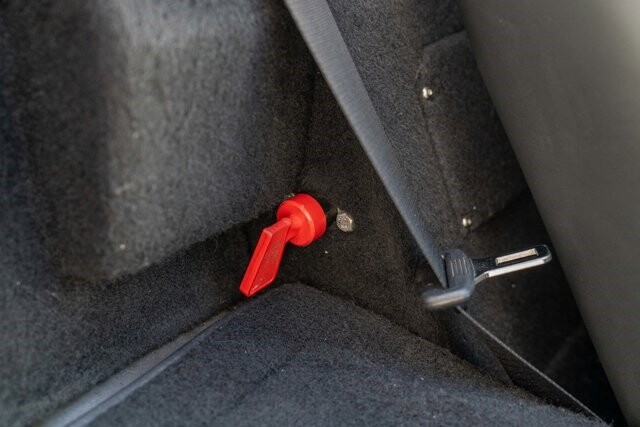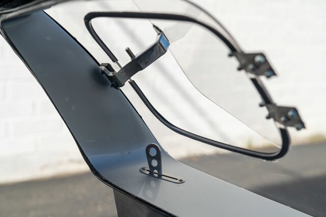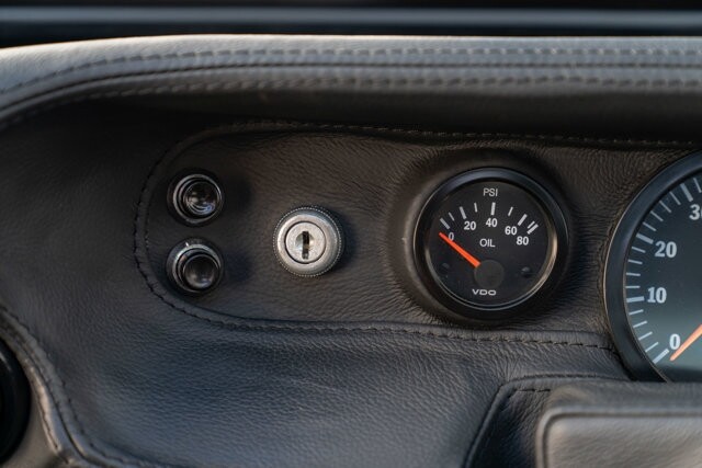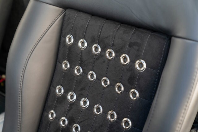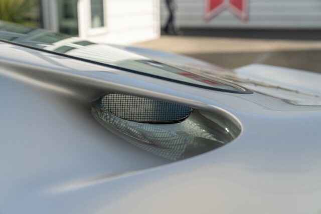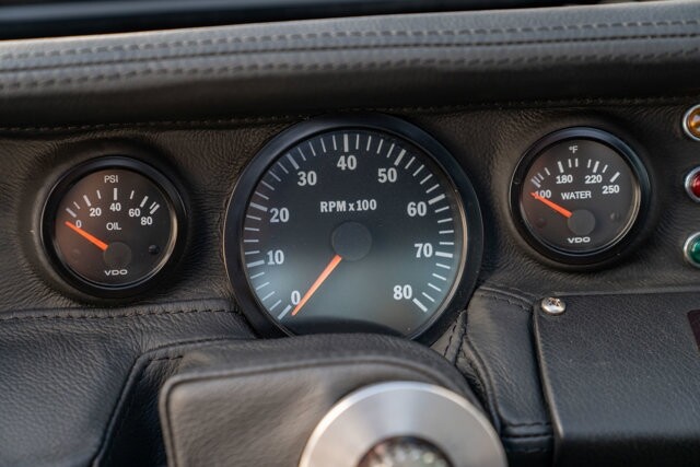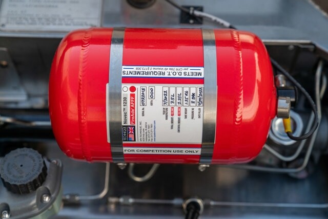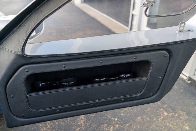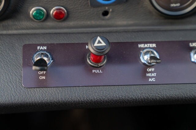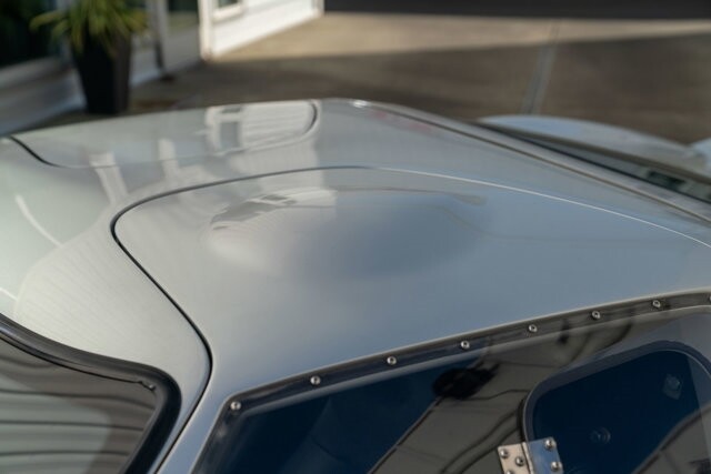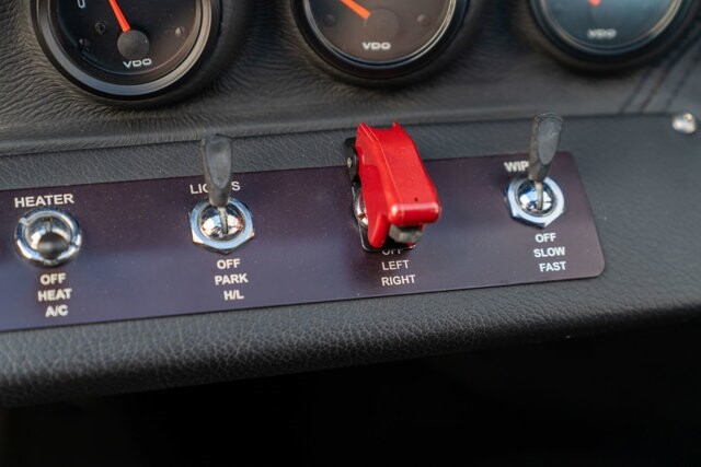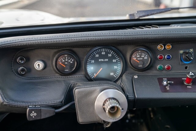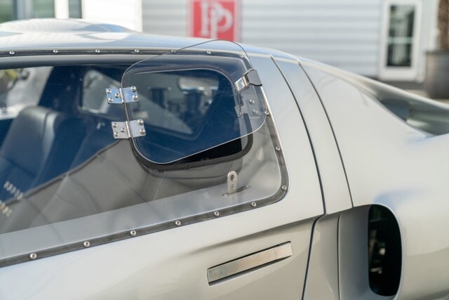 The interior of the GT40 features two seats with the infamous metal eyelets, which were first installed in the GT40 race cars to theoretically provide some ventilation during endurance racing. These have now become a required stylistic element in any GT40 recreation, and are on full display here, although the seats themselves are made of memory foam and wrapped in leather with Alcantara centers. This GT40 was built with a left hand drive, center shift specification, making it more accessible than the original race car's right hand drive, sill shift setup. Settle into the cabin and you are greeted by a 3-spoke leather wrapped aluminum steering wheel, that frames a large tachometer, and a speedometer that sits just at the edge of your peripheral vision off to the right. Given the GT40s side windows have an opening just large enough to hand toll through, it is crucial that any recreation is fitted with air conditioning- which is present on this example and keeps the cabin nice and cool on even the hottest days. A new electrical system keeps this car reliable and, as a safety precaution if you plan to hit the track, a full, new fire suppression system has been installed.