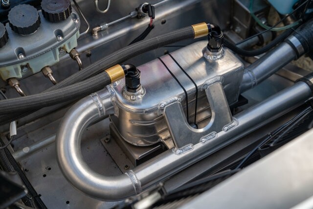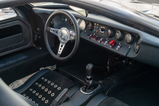 This 1966 GT40 replica is built by CAV- or Cape Advanced Vehicles- in South Africa. Produced in the early 2000s, the GT40 is finished in Metallic silver and has recently undergone a full rebuild while under the care of the consignor. After purchasing the car in 2021, numerous upgrades were carried out to the vehicle to improve its looks and make it a far better performer. On the exterior, the paint remained the same color, but the GT40 received black stripes down the lower sills, and a new set of BRM-style knock off wheels with black centers and silver knock-offs, makes the car look far more authentic than the larger wheels typically found on GT40 recreations.
