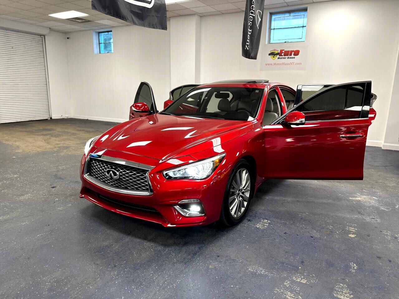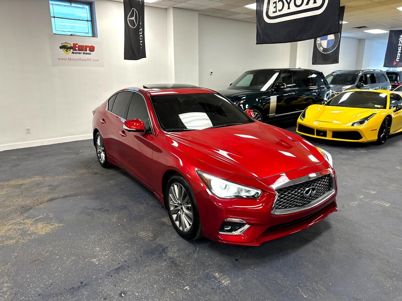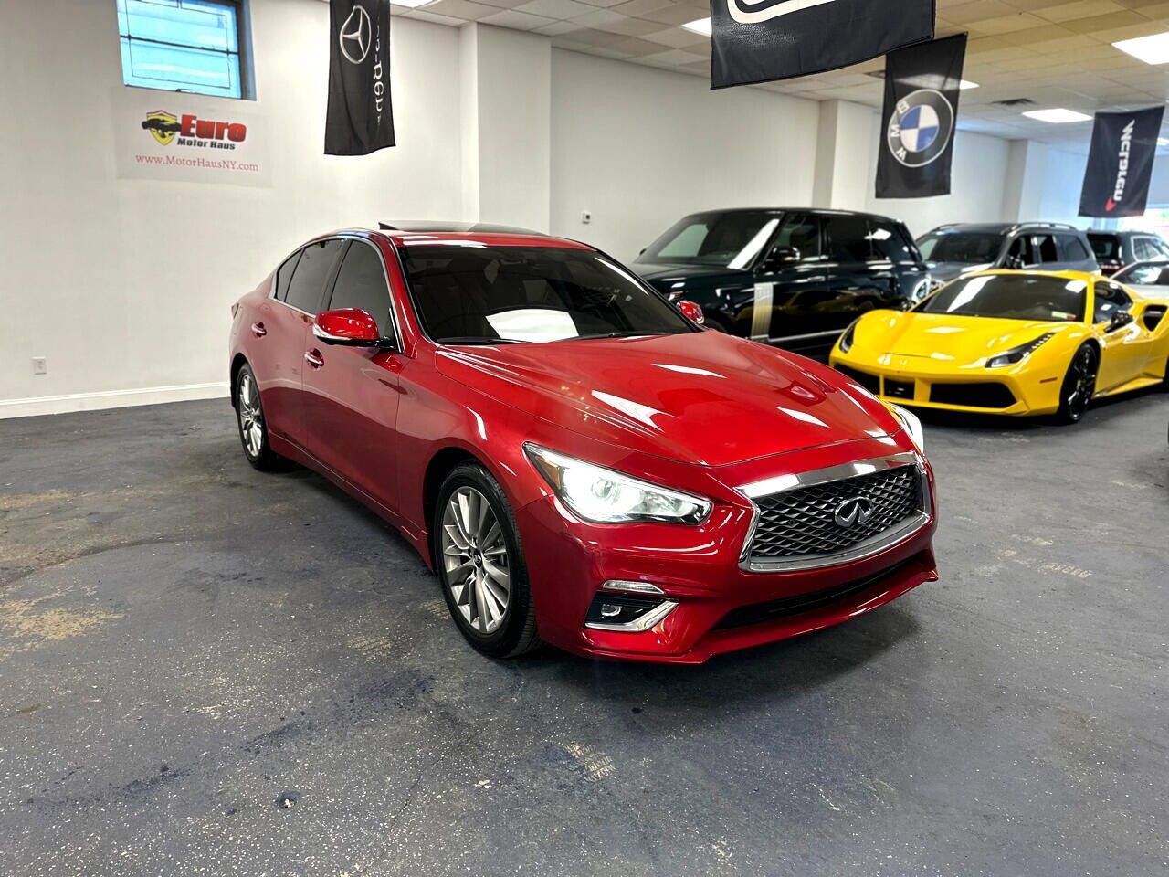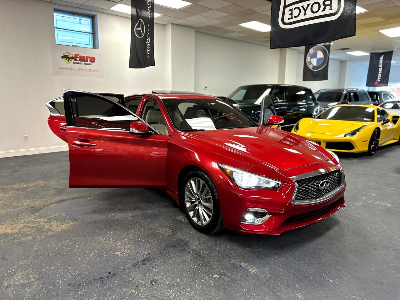 Introducing the 2022 Infiniti Q50 3.0t LUXE AWD, a dynamic and thrilling car with just 11,756 miles on the clock, making it practically new. This high-performance sedan boasts a head-turning Dynamic Sunstone Red exterior that perfectly complements the elegant white leather interior.Equipped with the following options, this Q50 is ready to impress. It comes with Dynamic Sunstone Red paint, adding a bold statement, and the luxurious and comfortable leather seating surfaces. The 50 State Emissions provide flexibility, while the Exclusive Paint Dynamic Sunstone Red adds a unique touch. The Cargo Package enhances practicality with shopping bag hooks, a cargo net, first aid kit, and trunk mat. Splash Guards protect the car's exterior, and rear USB Charging Ports ensure your devices stay powered. With the added Literature Kit and an Original Shipping Charge, the original retail price for this thrilling ride was $46,665. What sets this Q50 apart is the Sport Exhaust, adding an exhilarating acoustic experience to your driving. If you're looking for a hot and fun car with a like-new condition, this 2022 Infiniti Q50 is the perfect choice. Don't miss the chance to experience its excitement schedule a test drive today! ? Call or Text 516-614-1693 prior to your visit for special internet pricing and quick answers to your questions ? Visit Euro Motor Haus online at to see more pictures of this vehicle or stop in person and view our large variety of certified pre owned luxury vehicles at 305 East Shore Road Great Neck NY 11023 or call/text us at516-614-1693 today to schedule your test drive. We are a FRANCHISE Affiliated Luxury Pre-Owned Car dealership connected to over 4 Franchise Dealerships. What that means for you is that we have ability to obtain you low rate financing through our major lending institutions. Wells Fargo TD Bank Capital One Bank Bank of America US Bank Exeter auto finance Chase Automotive Ally Financial Santander Key Bank all NY based credit unions and many more.The benefits of which are then transferred to our clientele. We are able to offer FRANCHISE finance rates up to 84 months. With our affiliation we are also permitted to sell New Car Service Contracts here with our CERTIFIED PRE-OWNED PROGRAM backed by SafeGuard and GWC and NIADA Warrantech . Come in and have our friendly and knowledgeable staff facilitate your needs. Euro Motor Haus Inc does not guarantee any ad disclaimer guarantees etc on any 3rd party website.Please note that the advertised price does not include sales tax registration DMV transportation of vehicle costs incurred by the dealer as for safety including but not limited to brakes tires and fluids and any additional fees required by law. Prices exclude any additional charges included with the cost of closing including any governmental charges and taxes any finance charges documentation preparation or warranty. The advertised price represents the vehicle in its current condition and subject to change depending on any additional costs incurred or market fluctuations. Inventory prices are liable to change without warning. Vehicles are offered on a first come first serve basis. Please call to inquire. Advertised price includes all dealer rebates and incentives but not inclusive of certification & dealer prep. We make every attempt to adequately represent the condition and features of all inventory including vehicle information pictures pricing and status but there may be inaccuracies. Updates may be delayed. Dealer assumes no responsibility for inaccuracies in online information. All internet special prices expire at 11:59 pm today. Must present offer prior to expiration.All of our vehicles go through a rigorous Safeguard/ GWC & NIADA certified and backed inspection. They Are pre certified. You work you drive!!! Instant financing available!!! We have great relationships with many lending institutions and we are the Home of the Guaranteed Approval.All finance deals are subject to primary lender approval. Challenged credit no credit no problem! PRICES MAY DIFFER WITH PAYMENT OPTIONS. **Many are 1 owner or off lease vehicles. **Free Vehicle History Reports **100% TOTALLY Indoor Facility **Nationwide Financing available **Extended Service Contracts available **Our cars under 100k miles all come with at least a 30 day warranty standard **Many are out of state clean cars **Trade ins welcomed **No Haggle Pricing!