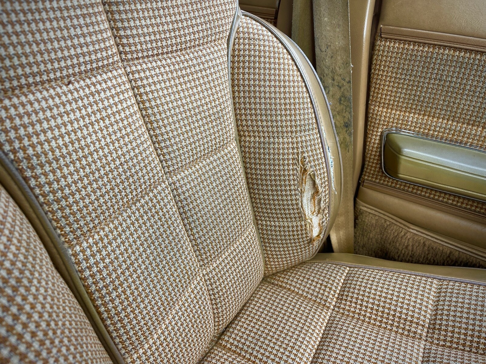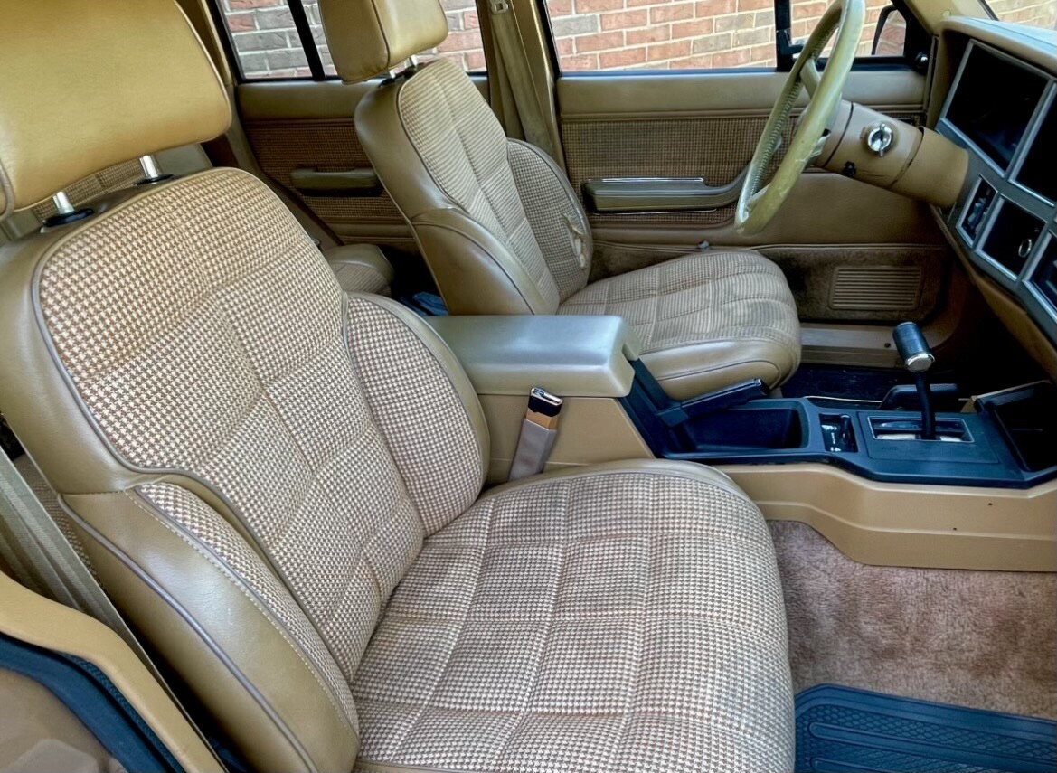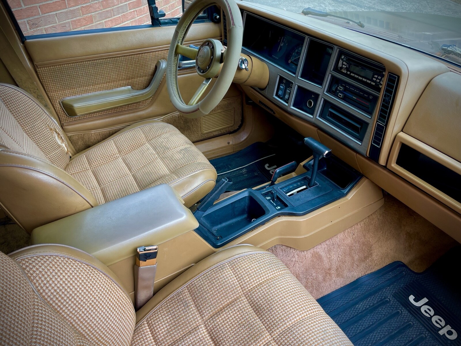 The interior is vintage 1986. It has the original carpets, seats, and spare tire cover. The seats are factory Jeep plaid. There is a tear on the driver’s seat, but this is an easy fix. The vehicle has original gauges. It comes with power steering, power windows, power seats, power door locks, tilt, cruise, and a leather wrapped steering wheel.