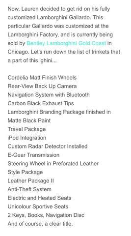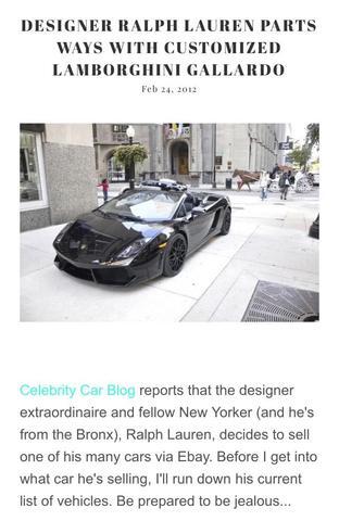 2010 Lamborghini Gallardo LP560-4 Spyder (VIN: ZHWGU6AUXALA08933), Nero Noctis exterior with a black top and Nero Perseus full leather interior with black stitching and black carpeting, 6,950 original miles, E-gear paddle shift 6-spd. trans., sold new in St. Louis, MO to fashion designer Ralph Lauren, 5.2L mid-engine light alloy 90