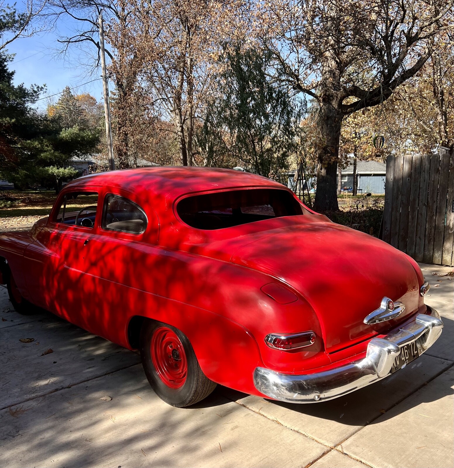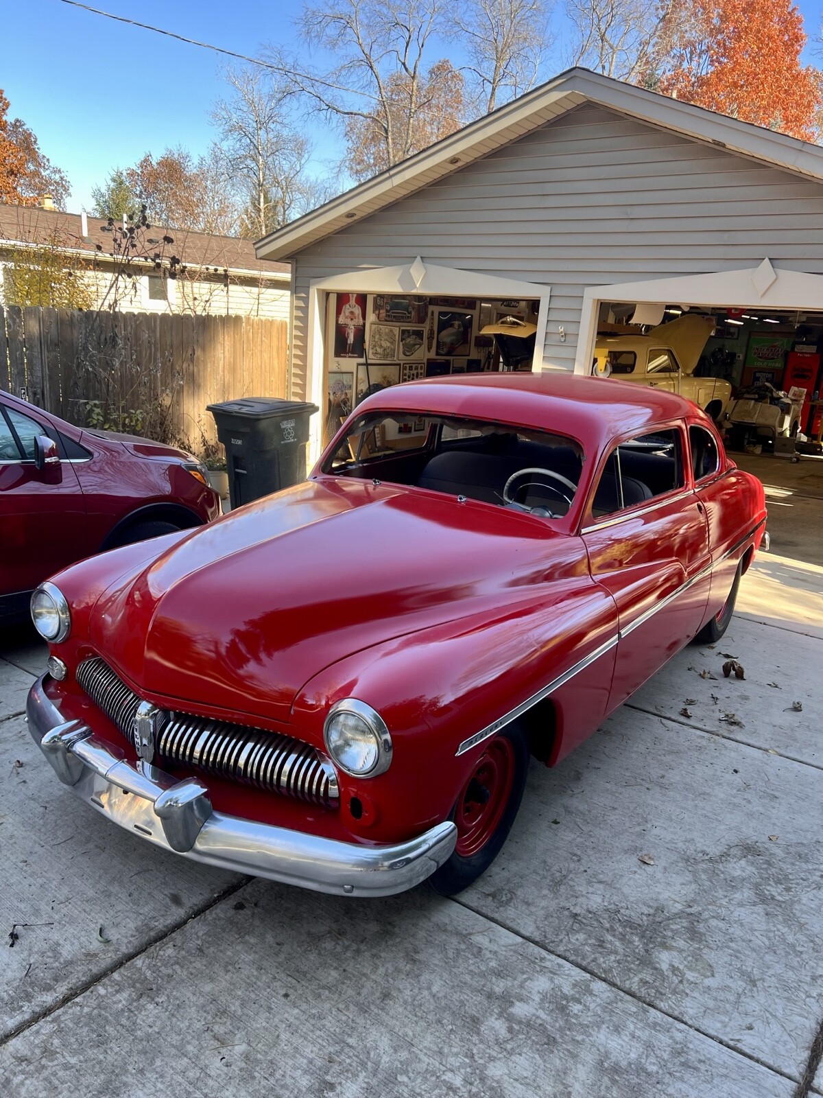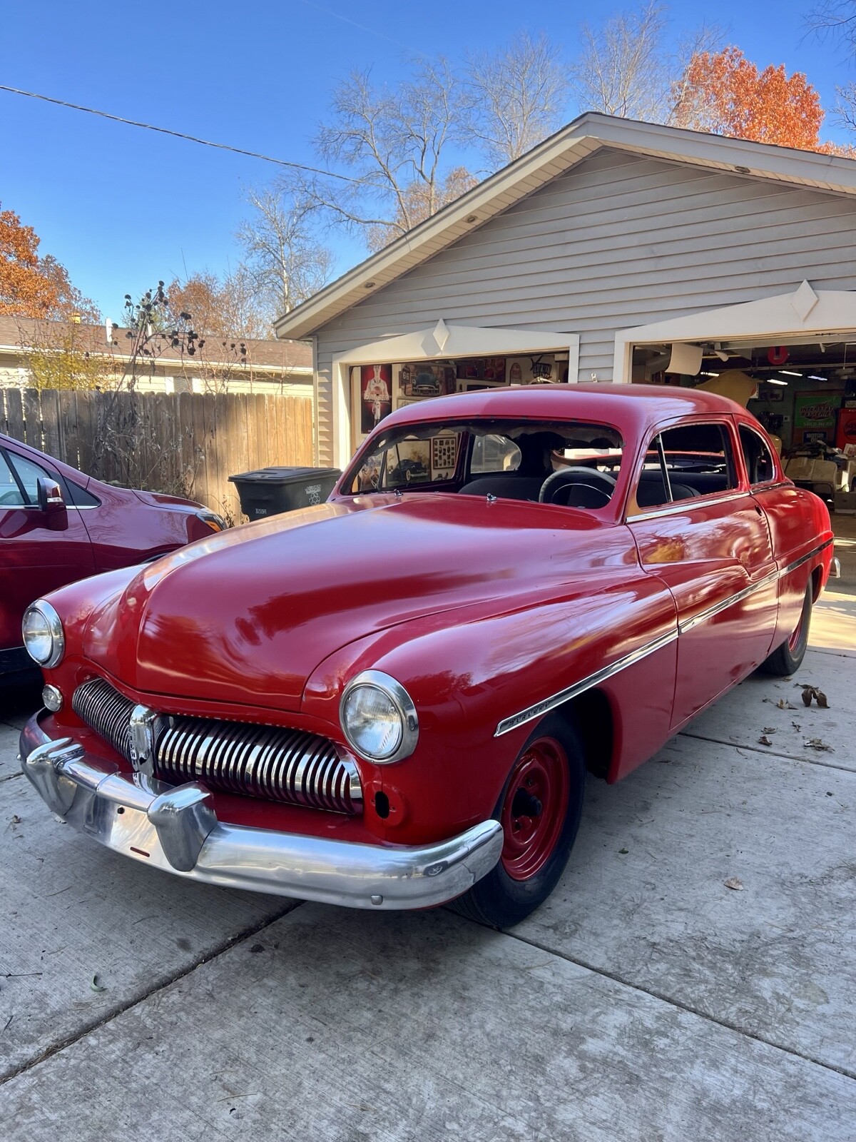 Nice 1949 Mercury coupe that I discovered in long term storage, it had the rockers replaced and an amateur paint job. Car was missing most of the bright work (bumpers,moldings,etc. I have spent the last 2 years rounding up missing parts. I have located and purchased about 90% of the stuff need to complete. Engine runs but needs the fuel tank cleaned flathead and 3 speed overdrive trans. New brakes, hoses, belts,lamps etc