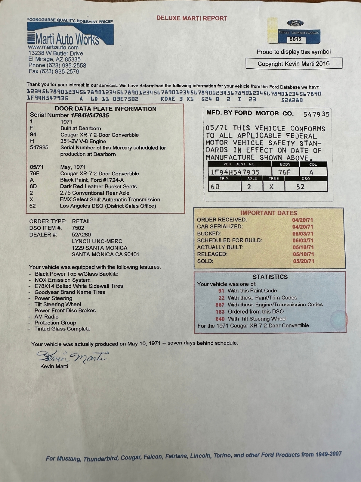 1971 MERCURY COUGAR XR7 CONVERTIBLE351CI V8 AUTO WESTERN CARRARE ONLY 22 MADE YEAR: 1971 MAKE: MERCURY MODEL: COUGAR XR7 BODY: CONVERTIBLE COLOR: BLACK/BLACK TOP TRIM: RED LEATHER ENGINE: 351 2V V8 TRANS: AUTOMATIC REAR: 2.75 TO 1 MILES: 93,000 (EXEMPT) SERIAL#: 1F94H547935 FACTORY OPTIONS *XR7 *351CI V8 *AUTOMATIC TRANS *POWER TOP *POWER STEERING *POWER FRONT DISC BRAKES *TITL WHEEL *AM RADIO *PROTECTION GROUP *TINTED GLASS *RALLY WHEELS *W/L RADIAL TIRES SERIAL # BREAKDOWN 1-1971 F-DEARBORN PLANT 94-XR7 CONV. H-351 2V V8 547935-SEQ# BODY TAG 76F-COUGAR XR7 A-BLACK 6D-DARK RED LEATHER 2-2.75 TO 1 REAR END X-FMX TRANS *52-LOS ANGELAS DISTRICT DOCUMENTATION *MARTI REPORT*ORIGINAL OWNERS MANUAL COMMENTS This beautiful 71 Mercury Cougar XR7 is all original.(one repaint) This was a western car, very solid and dry. Original color and trim. Original driveline. The paint is spectacular. New rally rims and tires. Based on Marti report, only 22 PRODUCED IN THIS COMBINATION.