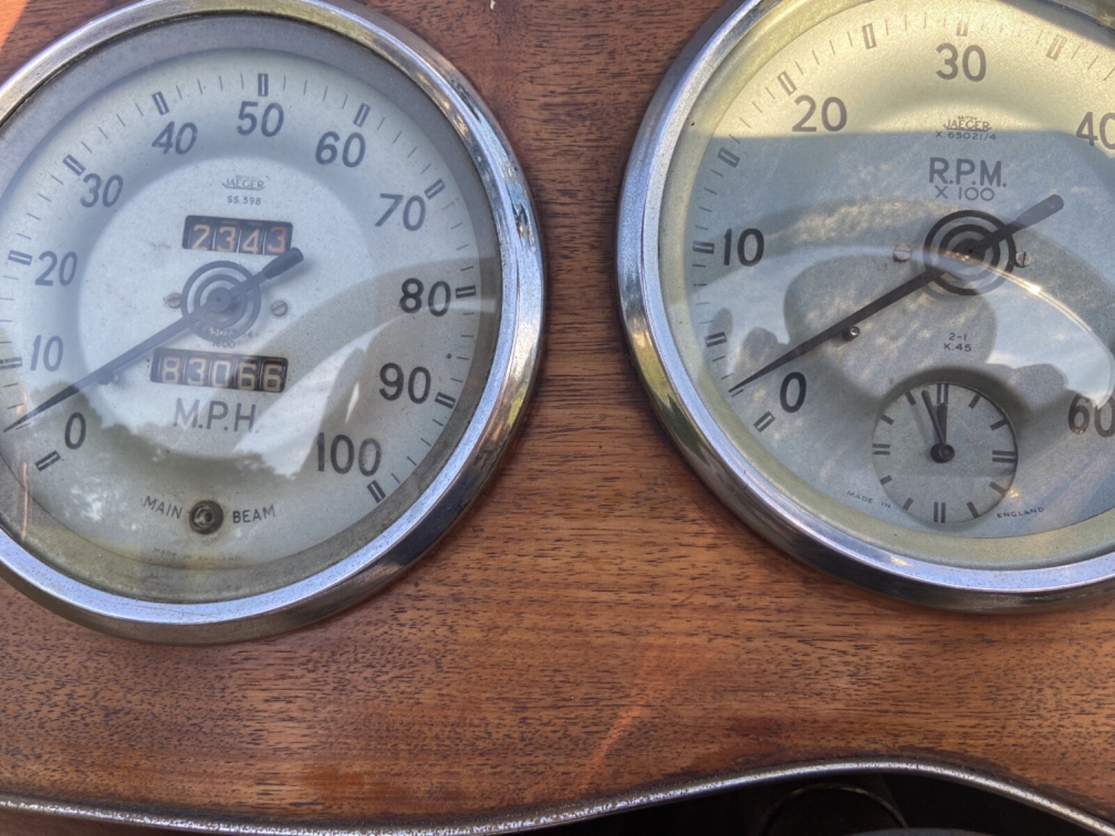 The green leather interior appears to be in good condition, and unmodified except for the addition of a Moto-Lita style wood-rim steering wheel. All gauges and controls appear complete on the wood dashboard, including the odometer showing 83,066 miles, also believed to be original per the seller. He states that all gauges function normally. The carpet is described as in “fair” condition, with no reported holes or tears. No modifications have been made to the interior, which was not equipped with a heater or a radio as new.