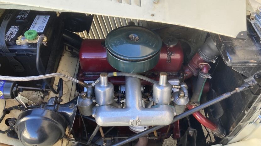 No issues are reported with the manual rack-and-pinion steering, suspension service, bushings, or shocks, per the seller, who also notes that the tie rod ends have been replaced and that the brakes “are new.” The sturdy 15-inch steel wheels were another improvement on the TD, compared with earlier wire wheels. The wheels on this example appear in the photos to be in good condition. The age of the 5.50x15 tires mounted on the wheels is not specified by the seller, and DOT date codes are not visible in the images provided. Tires should be inspected for age and condition before the car is driven any distance.