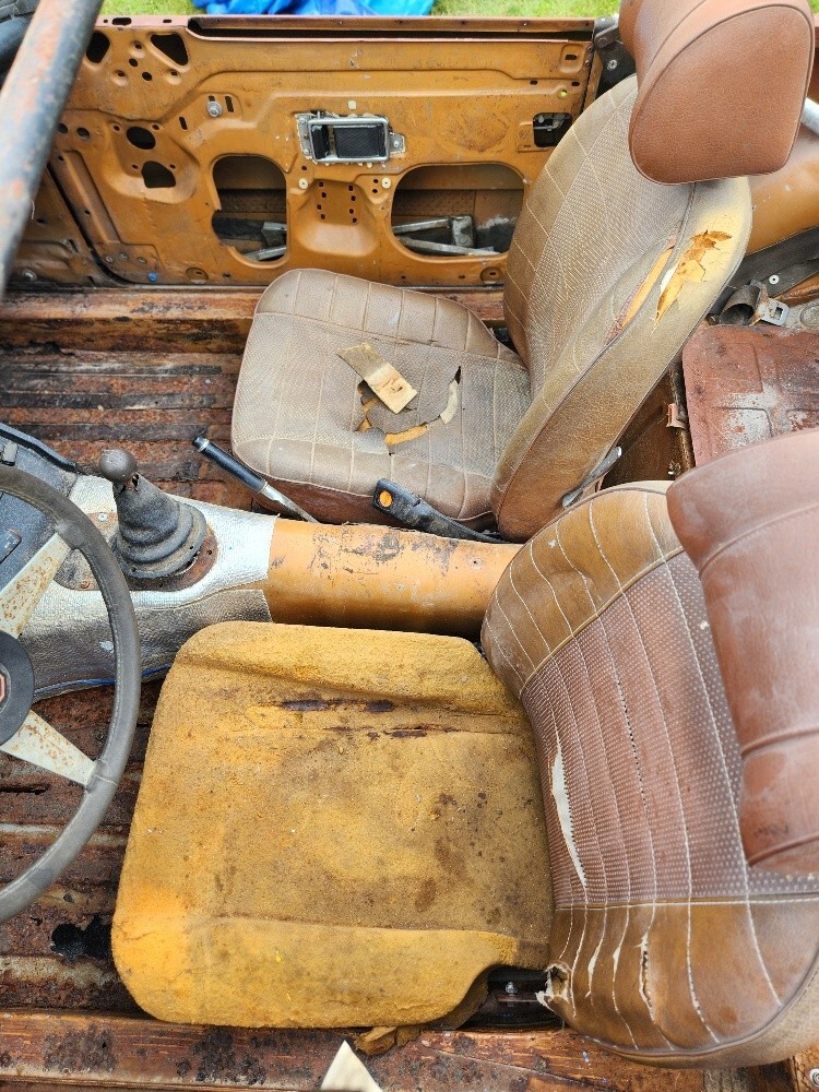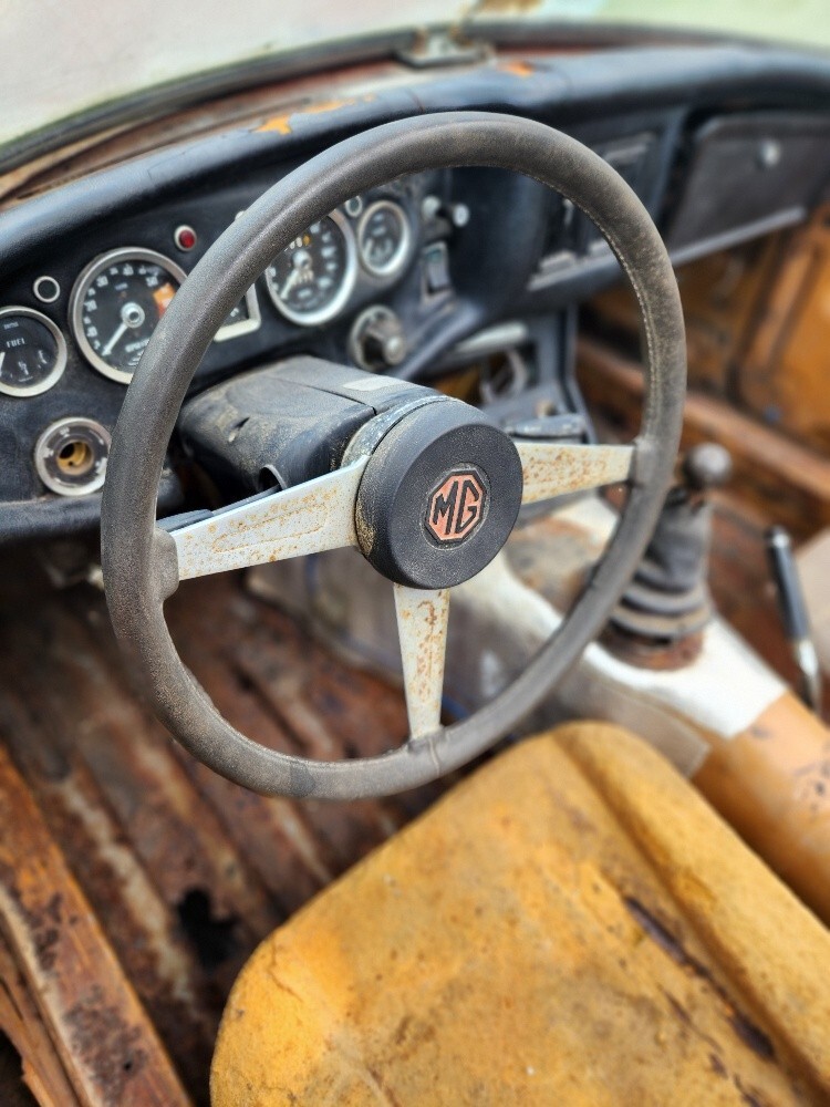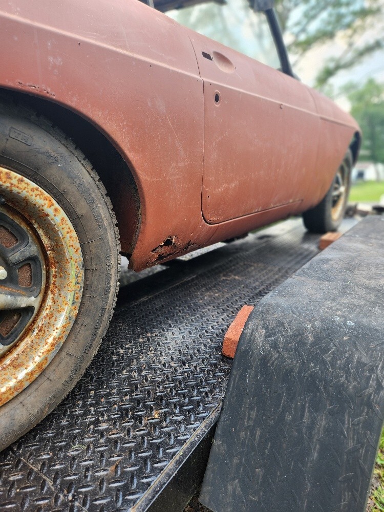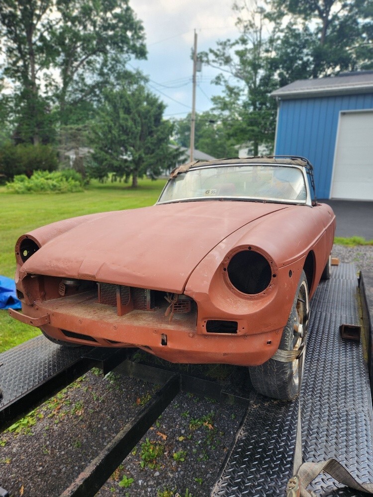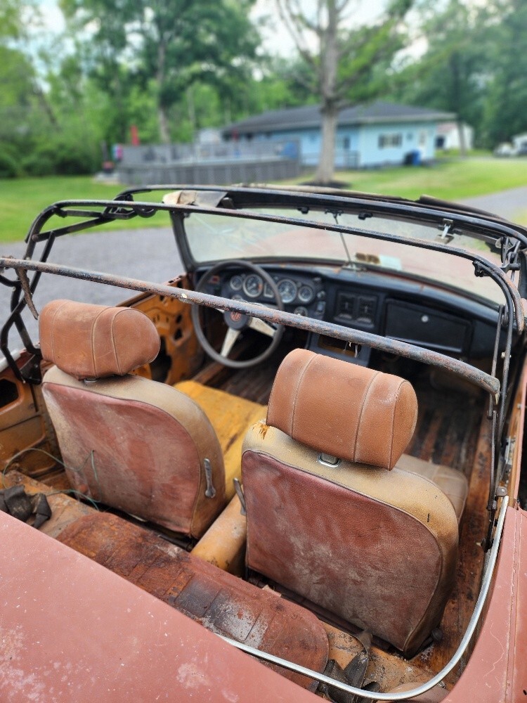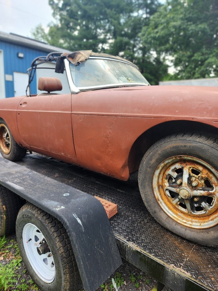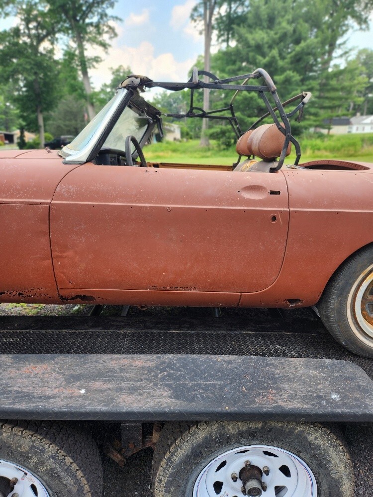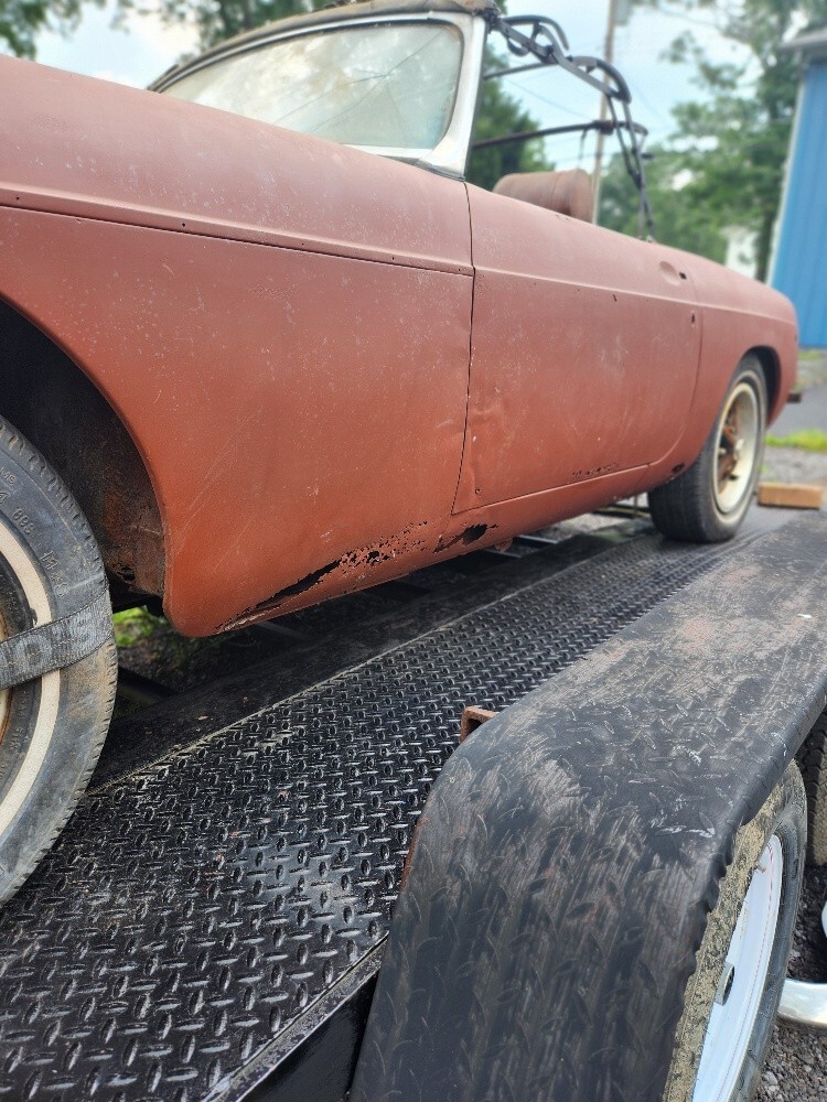 Got this 74 MGB from an estate as a parts car. Car was being restored but owner passed away leaving it to his brother. Car was bead and sand blasted then primed. It has no additional rust since the prime paint. It will need rust repair on rockers and floors. The car comes with 2 new British Heritage floor pans as seen in the photos. They retail for $299.99 each. Door hardware includes good door glass, both wing vents, window mechanisms, door cappings and inside door latches. Windshield frame, with cracked windshield, functional top bow, spare wheel, original jack and a bin of other parts including lights, etc. The engine is all original including the air pump that still has a belt on, all wiring looks to be original on the inner fender. Engine turns freely and has original HIF Carbs with original air cleaners. This car is equipped with an overdrive transmission as seen in the undercarriage photos and sticker on the steering surround. I am willing to assist in shipping as long as all arrangements are made well in advance. I can be reached at 814-931-0627 with any questions. A $500 non refundable deposit is required upon completion of auction. The car is known to be for sale locally and the auction will be cancelled with a local sale. There is NO TITLE and the car is being sold as a parts car. This MG should be saved and with the floor pans and overdrive is well worth the low reserve.