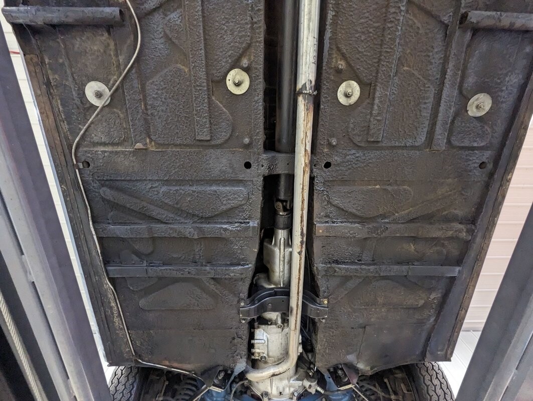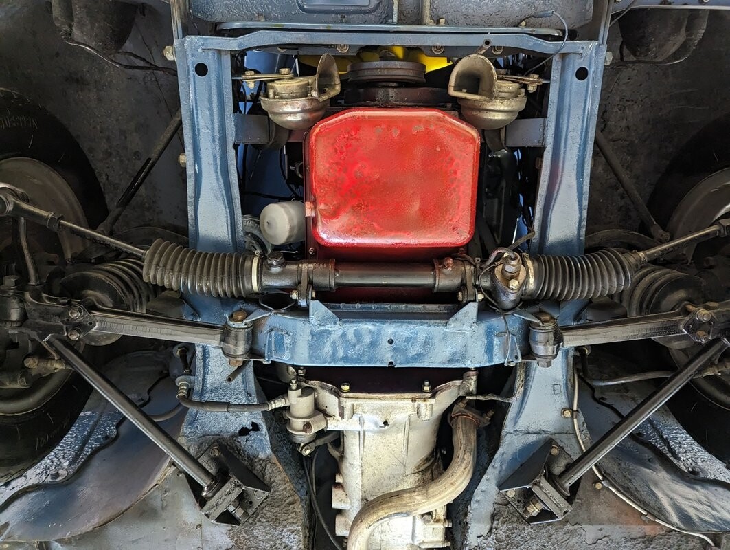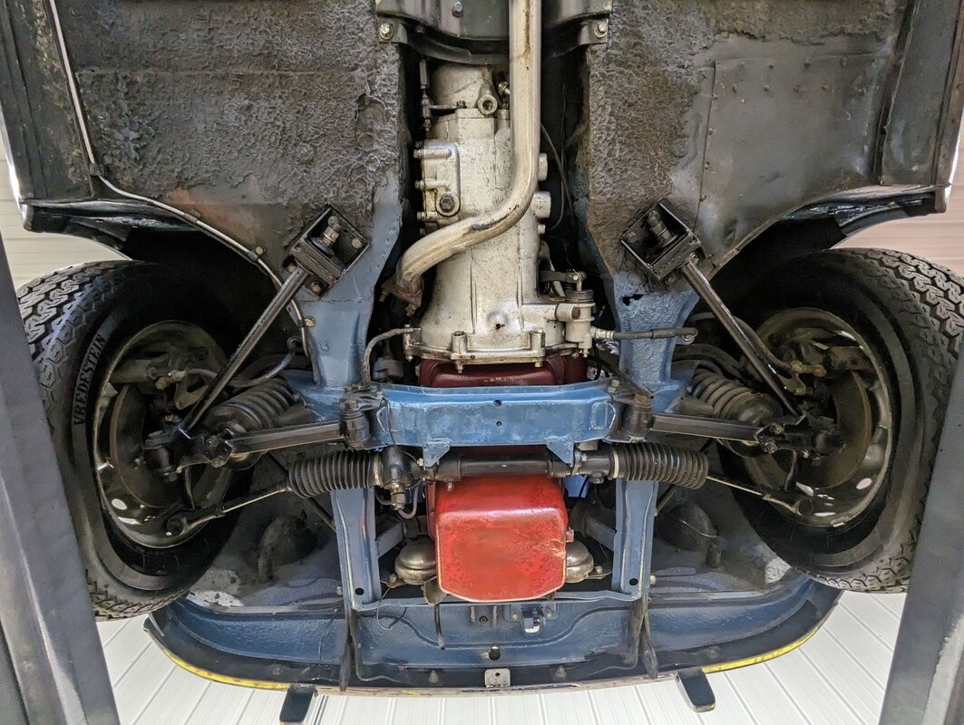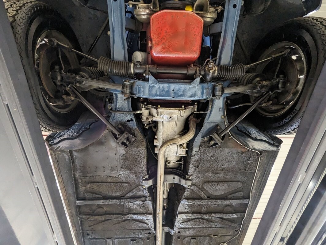 UNDERSIDE: Underneath the car is clean, the frame is painted the same French blue, floors are solid. It has rack and pinion steering and disc brakes in the front. It appears the front end components were taken apart and rebuilt. A nice single exhaust system is hung properly, and the rear suspension looks to be replaced.
