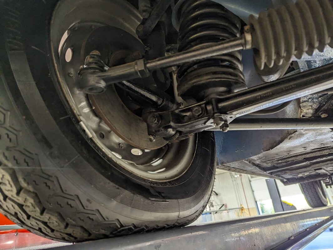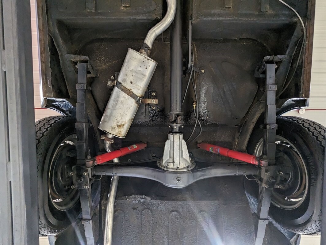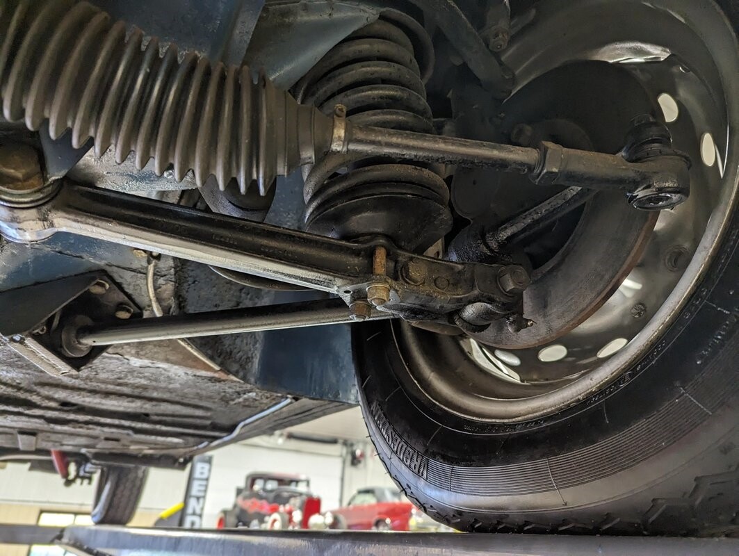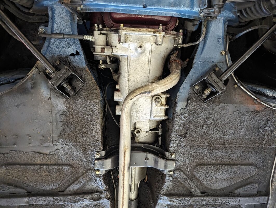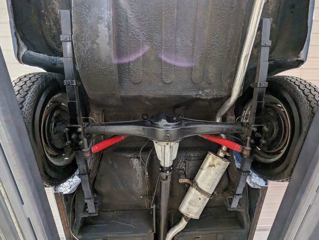UNDERSIDE: Underneath the car is clean, the frame is painted the same French blue, floors are solid. It has rack and pinion steering and disc brakes in the front. It appears the front end components were taken apart and rebuilt. A nice single exhaust system is hung properly, and the rear suspension looks to be replaced.