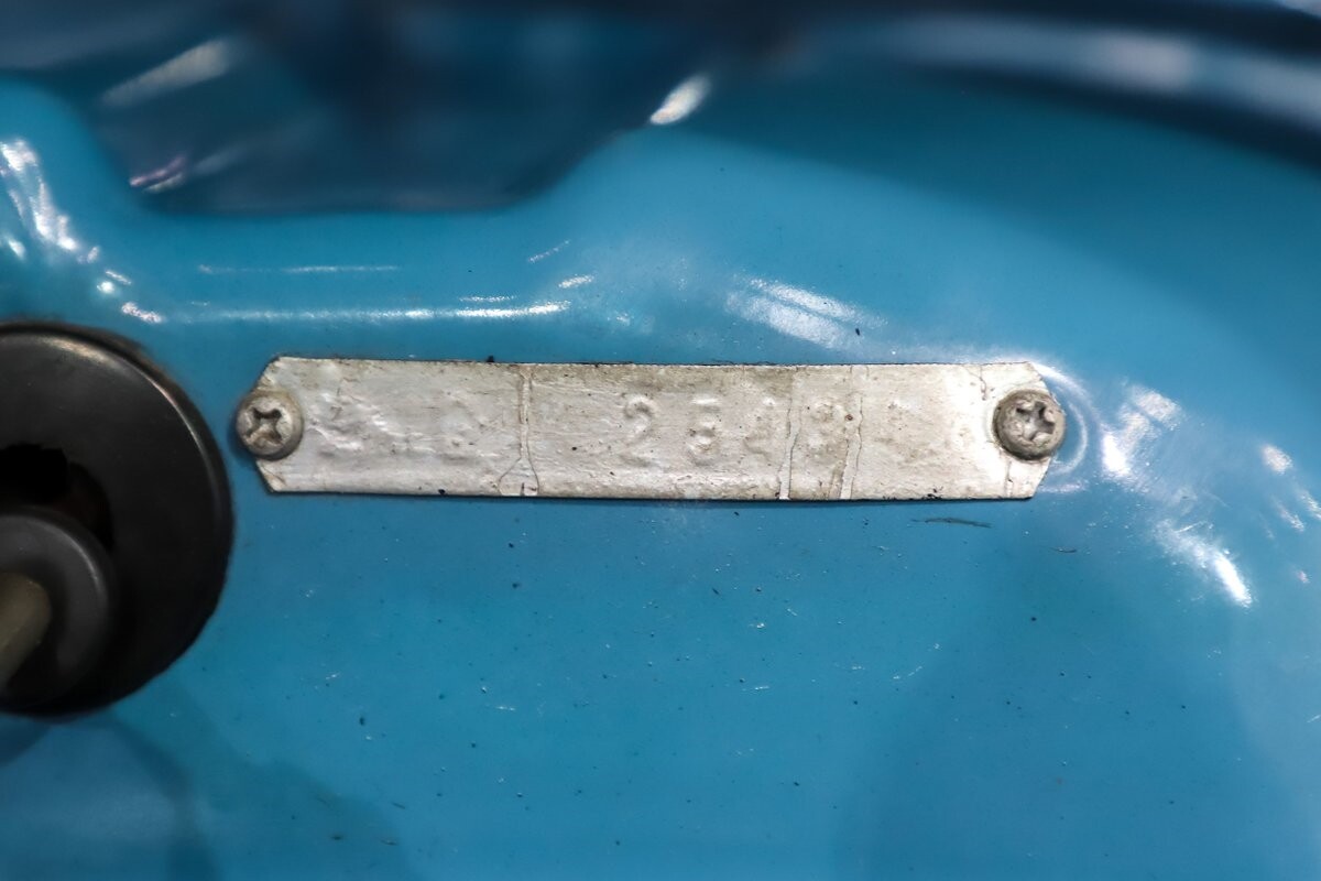TRUNK COMPARTMENT: The trunk compartment is complete: it has a spare tire, the tool kit, air pump and jack. There's also some literature, British license plates and front badge bar. It is solid and painted nicely. It also has a cream color liner and blue carpet mat.