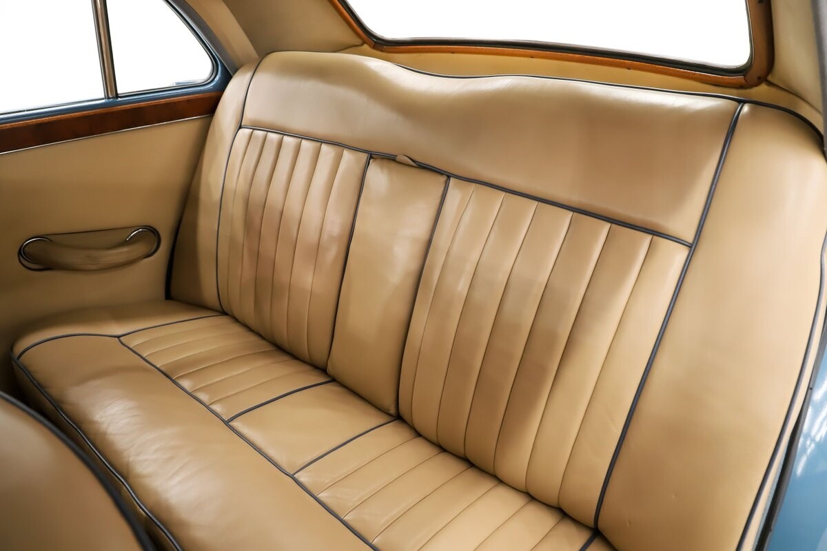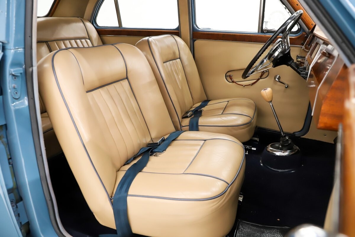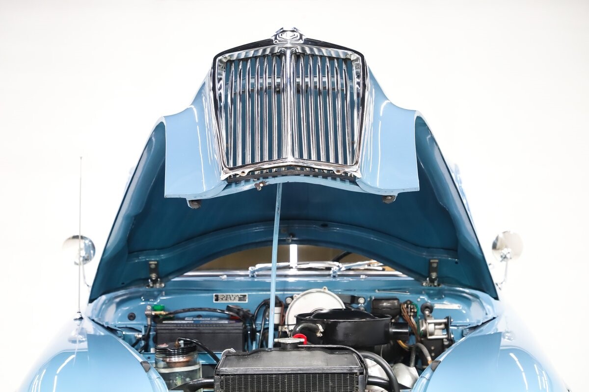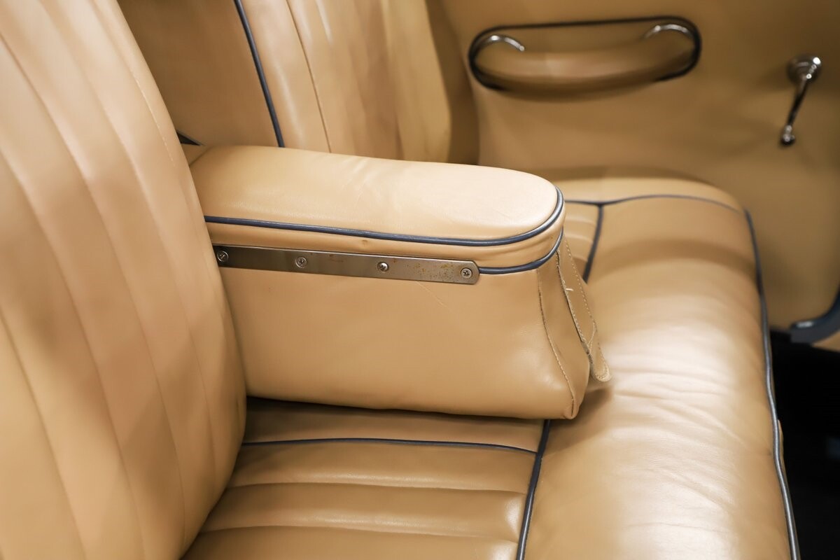 INTERIOR: The cabin is finished with a beautiful cream Connoly leather with blue piping. Bucket seats in front, it has a fold down armrest in back. Seatbelts have been added. It also has a beautiful wood trim. The carpet matches the navy blue accent piping and in great shape. The wood dash, knobs, optional radio and original gauges look nice. It has a hidden stereo under the dash with speakers. The headliner is in great shape. The stylish steering wheel is beautiful and has a working horn. Overall, the interior gives a luxury presence, it reminds me of a Rolls Royce!