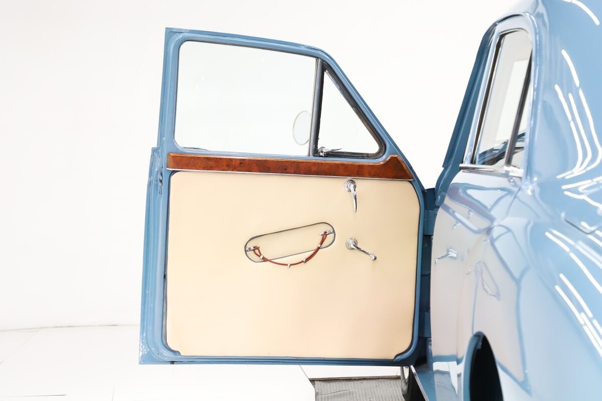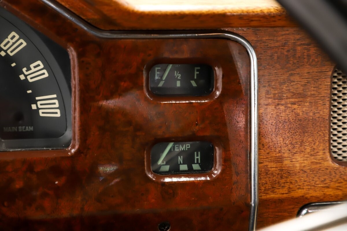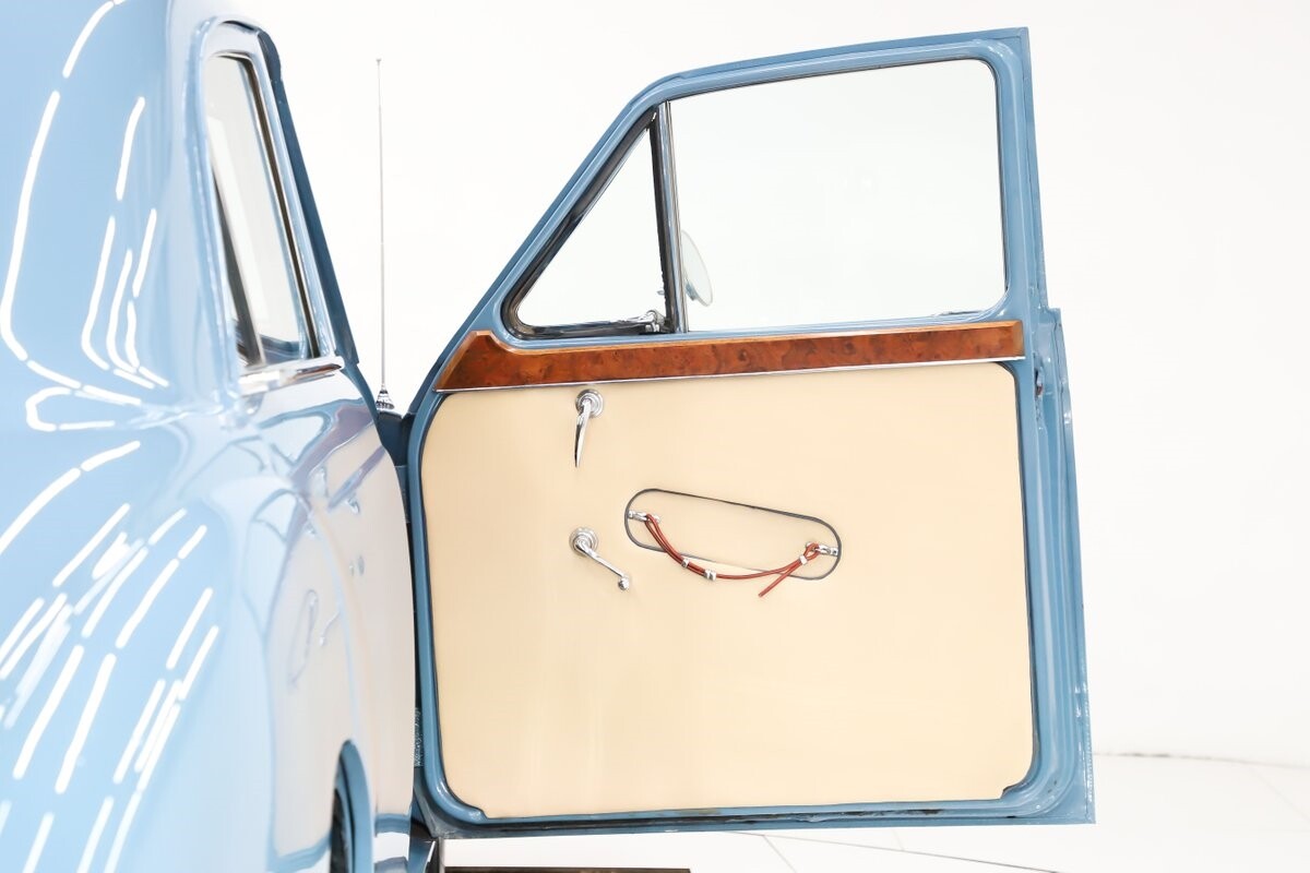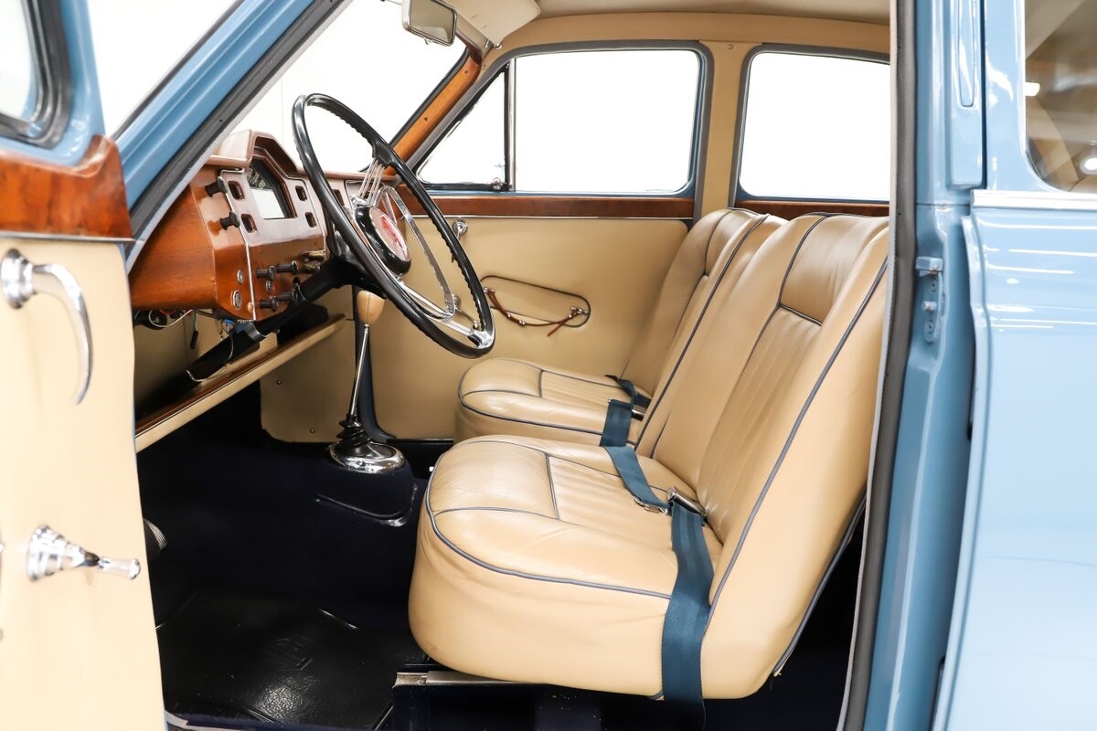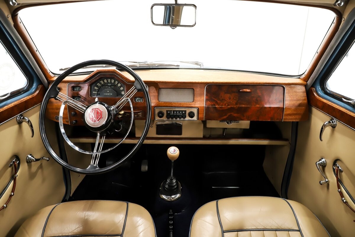 INTERIOR: The cabin is finished with a beautiful cream Connoly leather with blue piping. Bucket seats in front, it has a fold down armrest in back. Seatbelts have been added. It also has a beautiful wood trim. The carpet matches the navy blue accent piping and in great shape. The wood dash, knobs, optional radio and original gauges look nice. It has a hidden stereo under the dash with speakers. The headliner is in great shape. The stylish steering wheel is beautiful and has a working horn. Overall, the interior gives a luxury presence, it reminds me of a Rolls Royce!