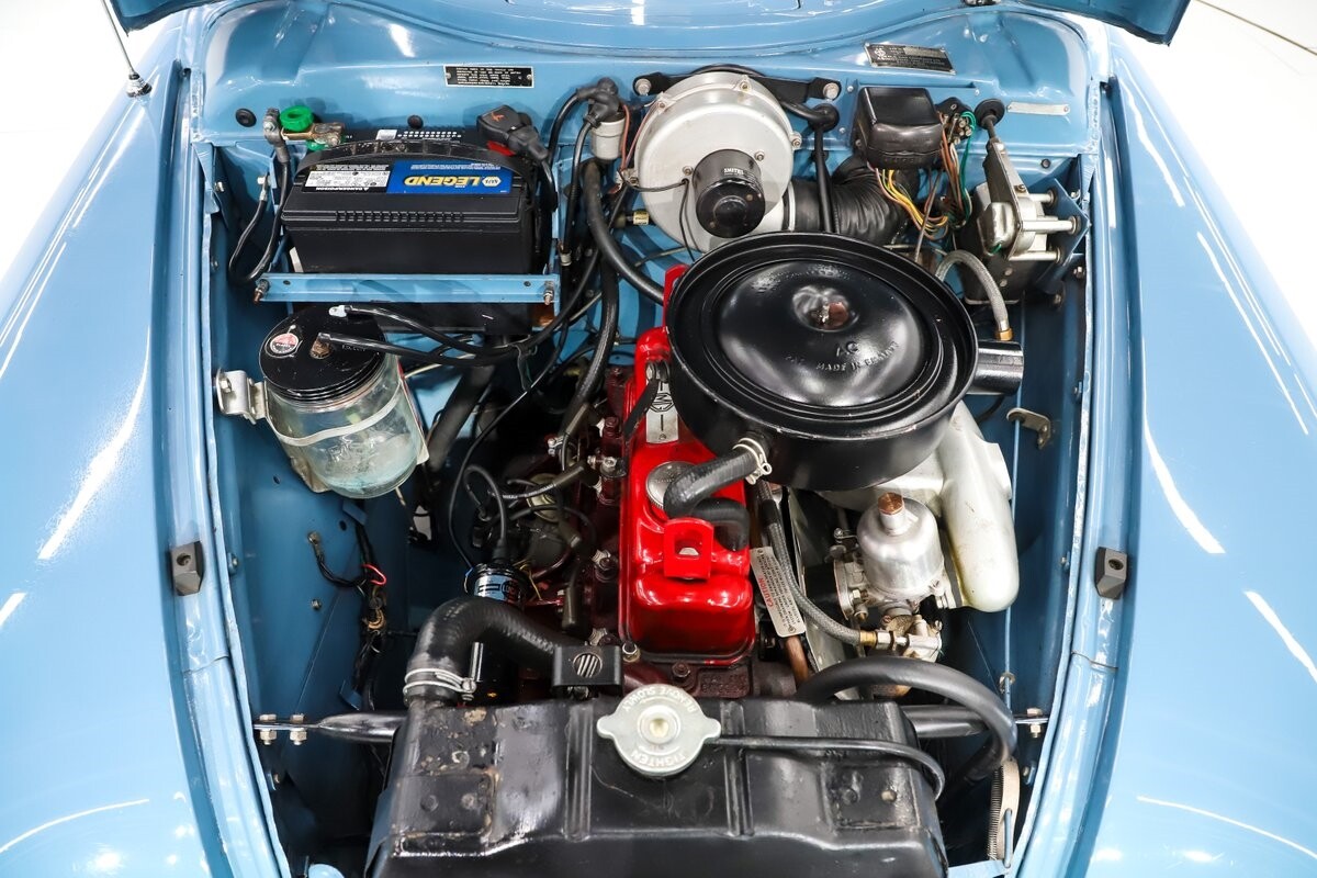 ENGINE COMPARTMENT: Upgraded with the more powerful B series 1798cc 4cyl MGB engine paired with twin carbs. Everything is nice, clean and proper. The engine is painted nicely, it has a clean glossy engine bay too. 12 volt battery with a disconnect swtich.