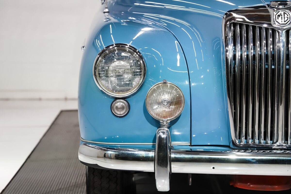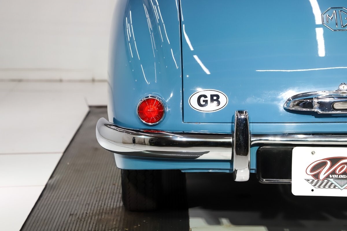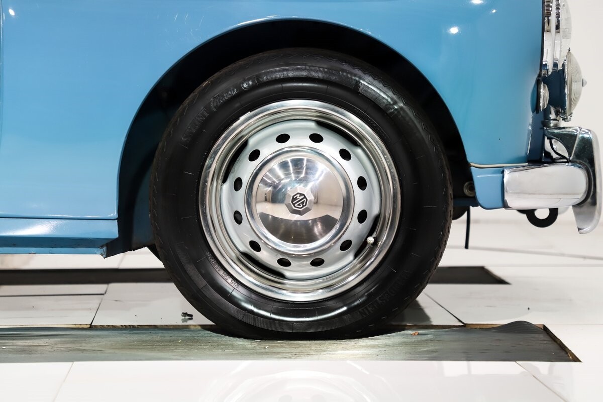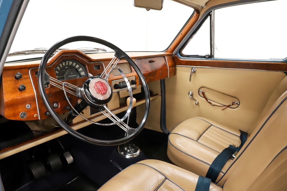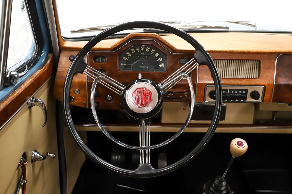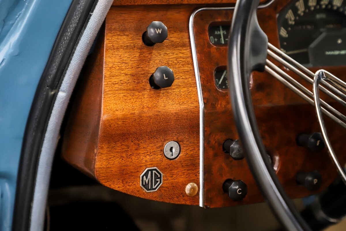 EXTERIOR: Finished in a gorgeous French blue paint. The body is clean and straight, the fit and finish is exceptional. Being an older restoration, the paint has mild crows feet cracking in places. These Magnettes have a very appealing look with the Lucas lamps, the big chrome MG grill and the chrome extended bumpers. All the chrome trim shines like new, there's no rust. The glass is nice and clear and in great shape. It has the upgraded correct radial tires on the MG steel wheels with hubcaps.