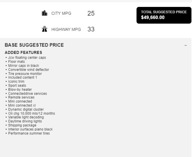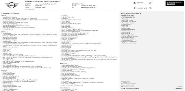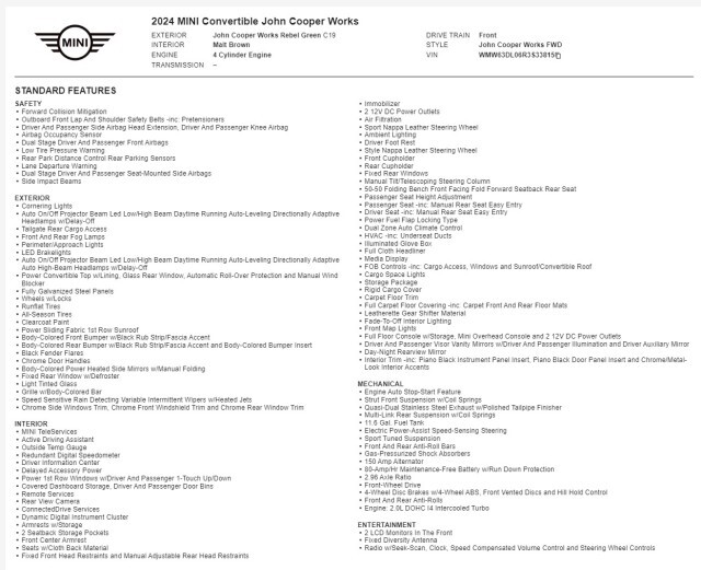 $49,660 ORIGINAL MSRP!! 2024 MINI JOHN COOPER WORKS CONVERTIBLE, REBEL GREEN, MALT BROWN CHESTERFIELD LEATHER INTERIOR, ICONIC TRIM, 18-INCH JCW CIRCUIT WHEELS, DYNAMIC DAMPER CONTROL, COMFORT ACCESS, HEATED FRONT SEATS, DUAL-ZONE AUTO CLIMATE CONTROL, ACTIVE CRUISE CONTROL, ACTIVE DRIVING ASSISTANT, PARKING ASSISTANT, SATELLITE RADIO, SATELLITE RADIO, HARMAN/KARDON PREMIUM SYSTEM, HEAD UP DISPLAY, WIRELESS CHARGING, NAVIGATION, PIANO BLACK INTERIOR SURFACES, NAPPA LEATHER STEERING WHEEL, DRIVE MODES, SPORT SEATS, LED HEADLIGHTS, LIGHTS PACKAGE, REMOTE SERVICES, MEDIA DISPLAY, CONNECTED XL, DYNAMIC DIGITAL CLUSTER, JCW FLOATING HUB CAPS, APPLE CARPLAY, ANDROID AUTO, REAR VIEW CAMERA, 1-OWNER, CLEAN CARFAX, BALANCE OF FACTORY WARRANTY!! This vehicle will be reviewed by an independent certified mechanic in accordance with PA state inspection regulations. If for any reason this vehicle does not pass inspection it will be noted. !!PLEASE CONTACT OUR SALES TEAM AT 877-864-0274 WITH ANY QUESTIONS!! We are pleased to show you another great opportunity! Sky Motor Cars is in the wholesale business and that represents the majority of what we do. When we have a vehicle this nice we present it to the public. Our turn time is quick and depending on auction schedules we may end listings early and take the vehicle to a dealer-only auction. Do not hesitate if you are interested! We have supplied many detailed photos to give you an accurate sense of just how nice this one is! !!THE BALANCE OF THE FACTORY WARRANTY APPLIES!! !!A VARIETY OF EXTENDED WARRANTY OPTIONS ARE AVAILABLE!! !!NATIONWIDE SHIPPING & FINANCING ARE AVAILABLE!! This is a previously enjoyed vehicle so there MAY be a few light scratches and small chips around the vehicle. Please study the photos provided. Anything unusual or significant will be shown in the pictures. PLEASE NOTE THAT UNLESS SPECIFIED OUR VEHICLES ARE NOT MATTE-FINISHED. THE PICTURES OFTEN SHOW THE REFLECTION OF OUR PHOTO BOOTH CURTAINS IN SHINY PAINT AND THAT CAN MAKE THE FINISH APPEAR DULL. Also, note there are many shadows cast on the vehicle due to the conditions in which the photos were taken. If you are unclear of anything please contact us PRIOR to purchasing!