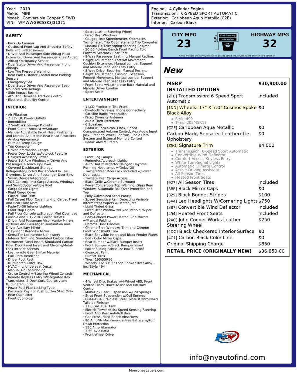 Take a look at this 2019 Caribbean Aqua Metallic MINI Cooper S Convertible with Carbon Black Leatherette Interior, a Clean Carfax, only One Owner and only 26,327 miles. This car is like a sparkling diamond gift. Cars like this rarely exist and to find one this amazing is truly a wonder. This car has the optimal clean history, the extremely valuable and stylish Signature Trim, a stunning color, low mileage and well maintained looks that will shock anyone. Do not miss this once in a lifetime vehicle. It comes equipped with a 2.0L 4-cylinder engine paired to a 6-speed Automatic Transmission, Signature Trim (with Heated Front Seats, Comfort Access Keyless Entry, White Turn-Signal Lights, Automatic Climate Control, Active Driving Assistant), 17 Cosmos Spoke Black Alloy Wheels, Black Mirror Caps, LED Headlights with Cornering Lights, John Cooper Works Leather Steering Wheel, Carbon Black Color Line, Bluetooth, Cruise Control, Steering Wheel Controls, AM/FM Radio, Satellite Radio, Power Windows, Power Locks, Air Conditioning and so much more. Every NY Auto Find vehicle comes with a complimentary Limited Warranty and a Carfax Vehicle Report. Our vehicles are priced to sell quickly. Please call to check availability and to schedule an appointment. -