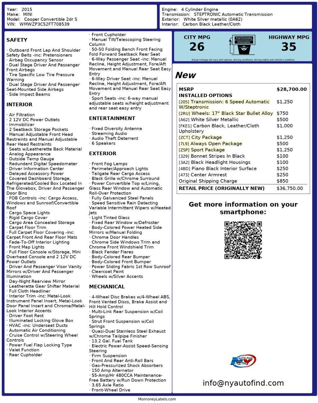 Take a look at this 2015 White Silver Metallic MINI Cooper S Convertible with Carbon Black Leather/Cloth Interior, a Clean Carfax and only 88,494 miles. This is a car that will captivate everyone wherever you go. Imagine owning this fine vehicle with a clean history, gorgeous wheels and a ton of awesome options. It even has relatively low mileage, so do not hesitate with a car of this quality. It comes equipped with a 1.6L 4-cylinder engine paired to a 6-speed Automatic Transmission, City Package (with Auto-Dimming Interior and Exterior Mirrors, Supplemental ZP1 Equipment, Auto-Dimming Rearview Mirror, Comfort Access Keyless Entry, Anti-Theft Alarm System, Power Folding Mirrors, Rear Park Distance Control), Heated Front Seats, Sport Package (with 17 Black Star Bullet Alloy Wheels, White Turn Signals, Xenon Headlights, Dynamic Traction Control), Piano Black Interior Surface, Center Armrest, Cruise Control, Steering Wheel Controls, AM/FM Radio, Power Windows, Power Locks, Air Conditioning and so much more. Every NY Auto Find vehicle comes with a complimentary Limited Warranty and a Carfax Vehicle Report. Our vehicles are priced to sell quickly. Please call to check availability and to schedule an appointment. -