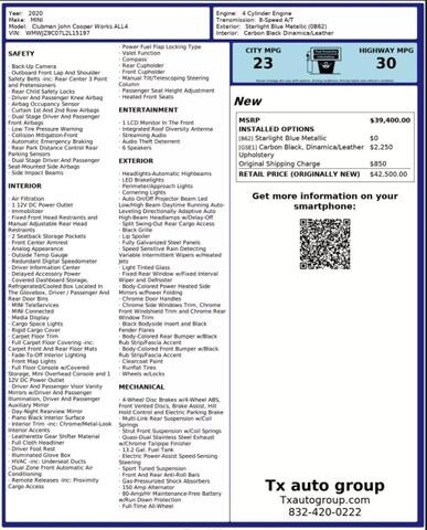 Have a look at this One Owner, Extra Clean, Adult Owned, Serviced, Accident Free, & Non Smoker 2020 Mini Clubman John Cooper Works ALL4 Hatchback with Starlight Blue Metallic Exterior Paint over Carbon Black Leather Interior Upholstery.