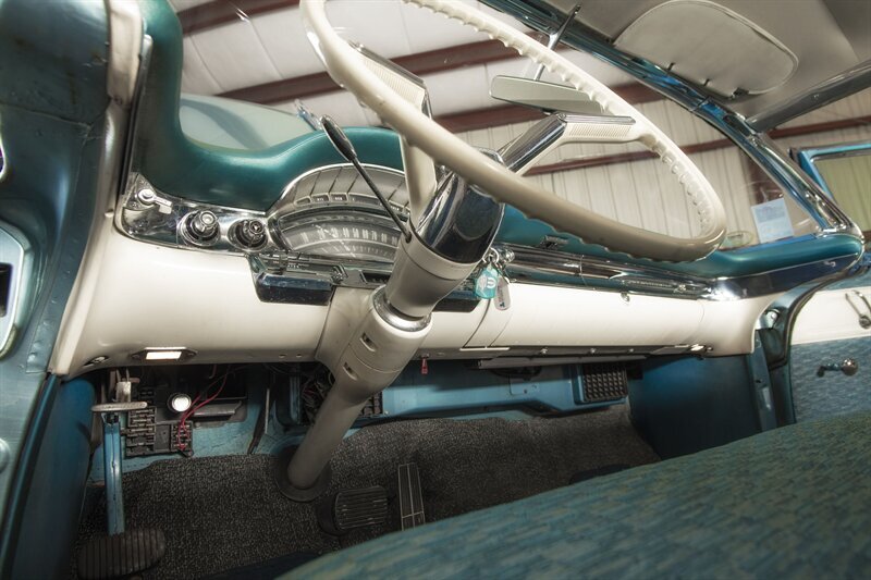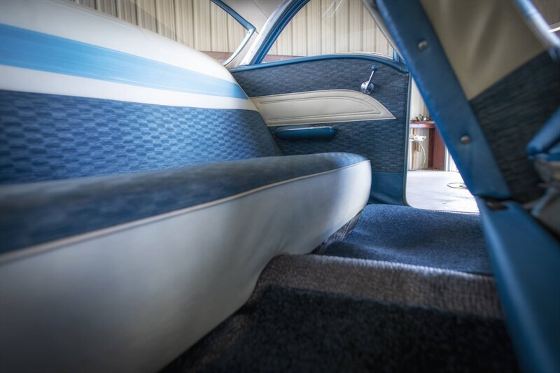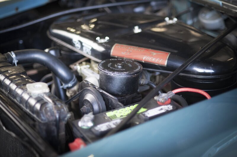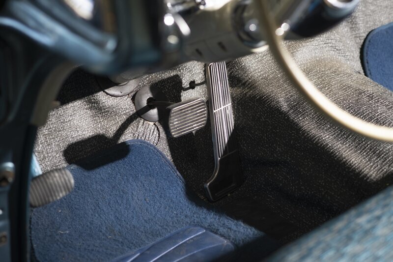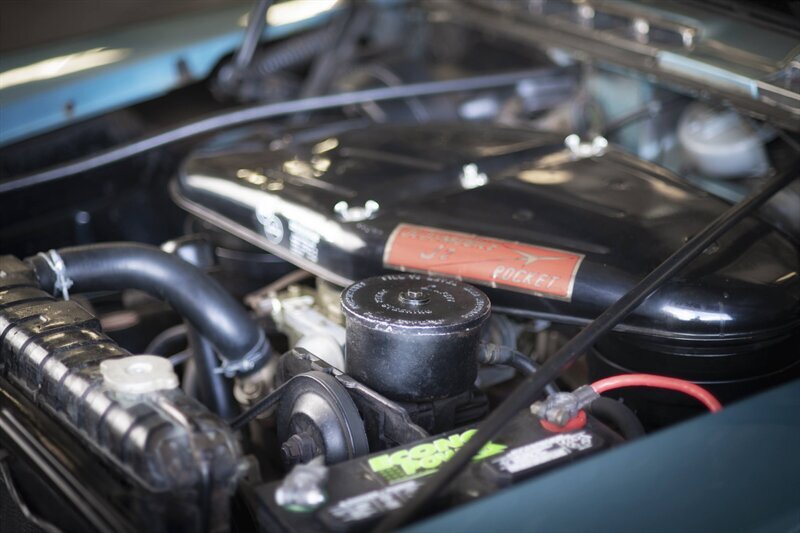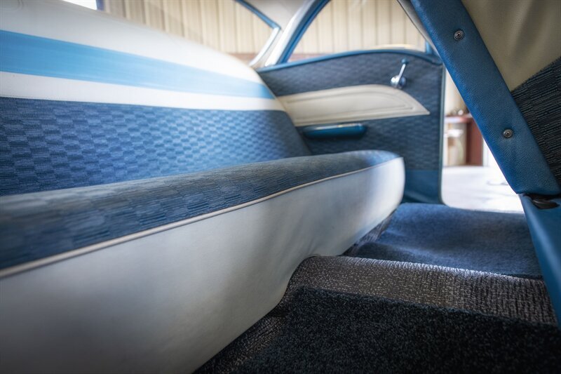 Inside, the car has its original ivory/blue cloth interior (code 363). Ordered without clock, radio or sideview mirrors but there is an original clock included. The front and rear bench seats show decently but could use some clean-up TLC while the inner door panels are in good, original order. A white, two-spoke steering wheel faces the driver while the only gauge on the dash is for fuel. A revised instrument panel was highlighted by a new deep-dish steering wheel with "horn bars" replacing the long-standing horn ring still common during that period. Note also that the quadrant selector – PNDSLR instead of the PRNDSL of later years. Park and Reverse are at opposite ends, not next to each other. A factory AM radio completes the interior.