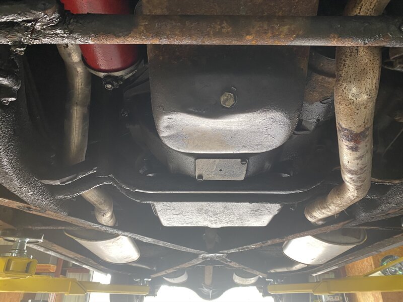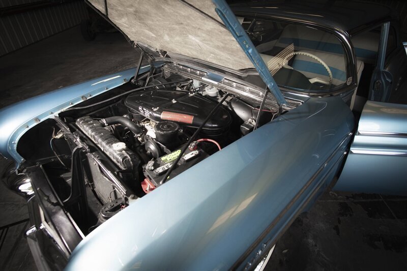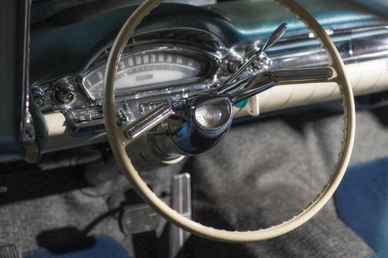This car is a smaller version of General Motors’ other times it put a large motor in a smaller or lighter body. The Dynamic 88 was billed as the entry-level model beneath the Super 88 yet this example has the highest powered V-8 available in 1958, something that came standard on the Super 88 models: the 371 CID Rocket V-8 with three two-barrel carburetors (code J-2), breathing via true dual exhausts. Most of the time, the J-2 drove using its center carburetor; for passing power, or for a particularly dramatic launch, you would floor it (only three-quarters throttle was required) and dip into the outer four barrels, launching you forth with a noteworthy burst of power that belied a car of this size. (The outer carbs, which drew their vacuum from the windscreen wiper pump, were either open or closed--no in-between.) However, this example has no air-conditioning though it does offer power steering and power drum brakes. Backing this motor is a Hydramatic four-speed automatic transmission and a 3.64:1 rear end.