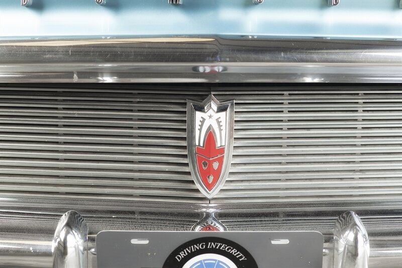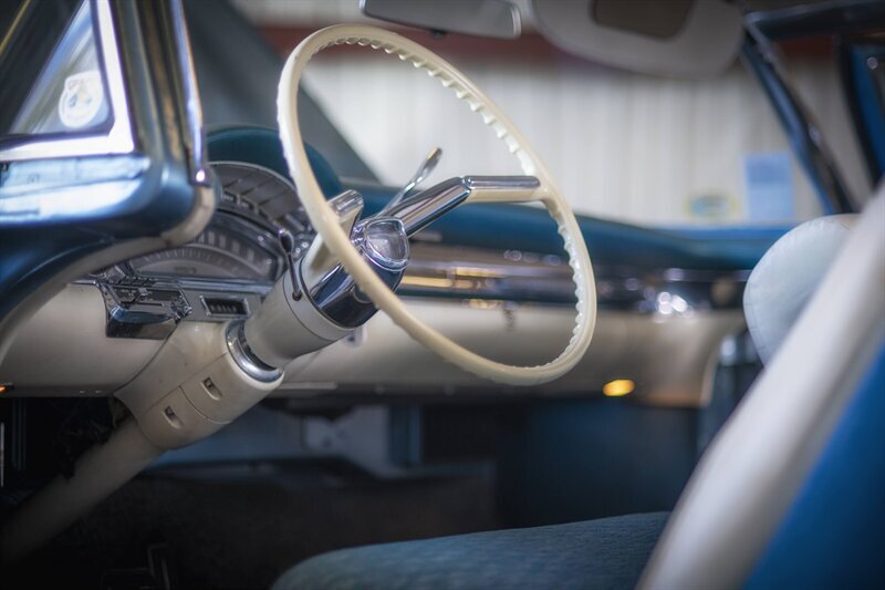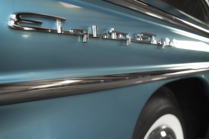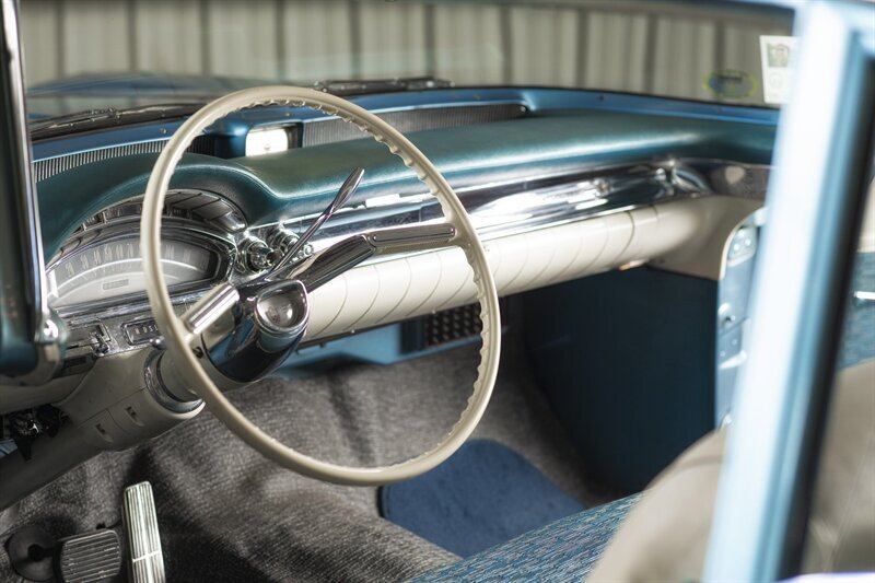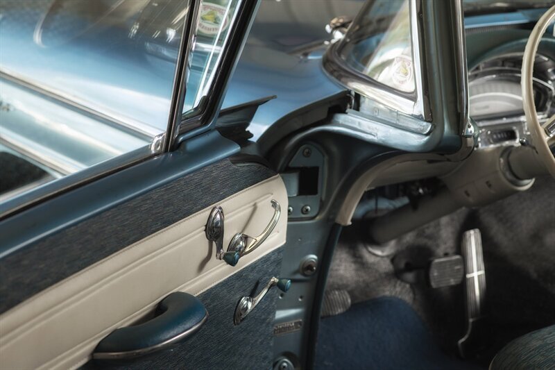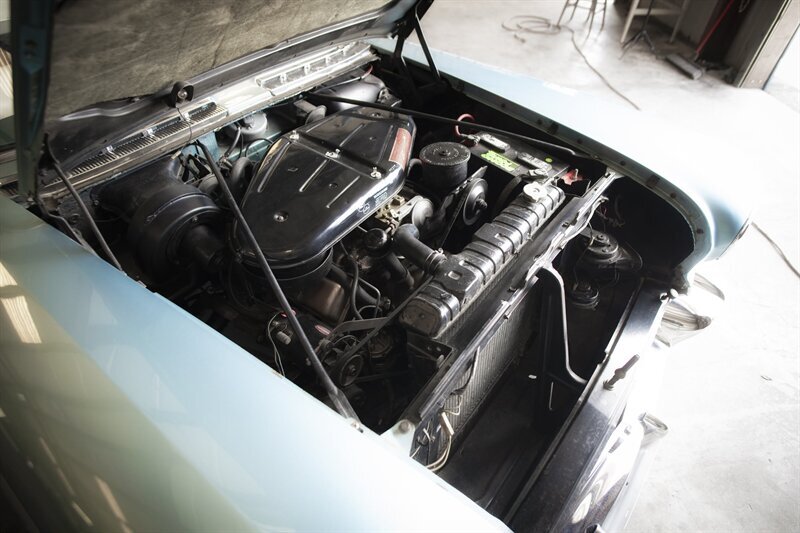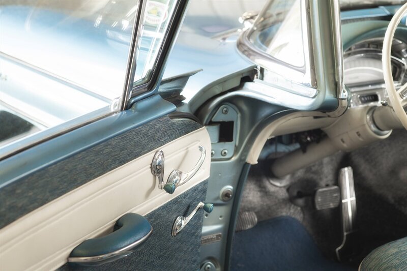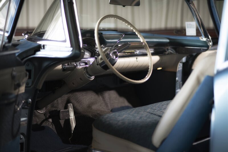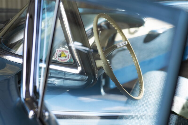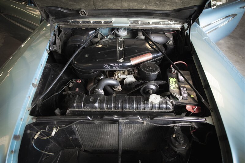 This big cruiser rolls on BFGoodrich Silvertown wide whitewall tires, size 8.50-14, at all corners, including the spare. Each tire is mounted on a steel wheel topped with a factory wheel cover. All tires and wheel covers are in very good order and there’s a jack located in the trunk. The white headliner looks good for its age. The blue-over-white metal dash looks great and like the exterior, is bedecked with chrome.