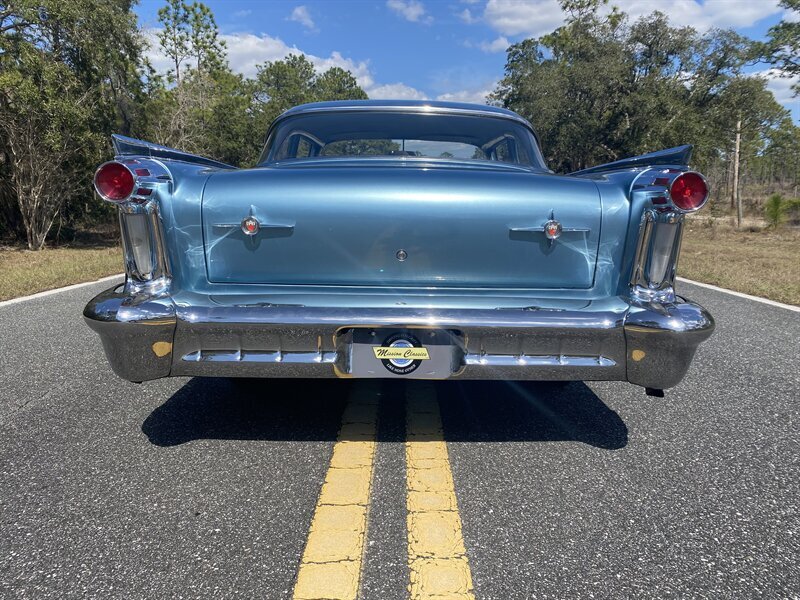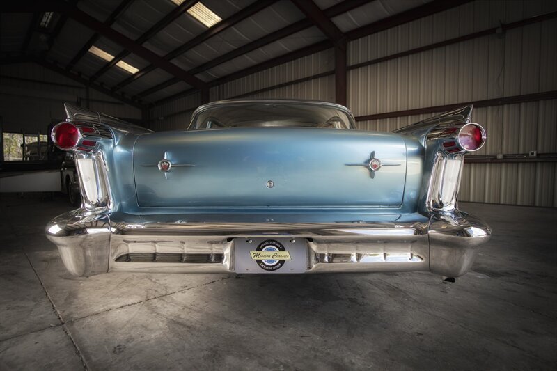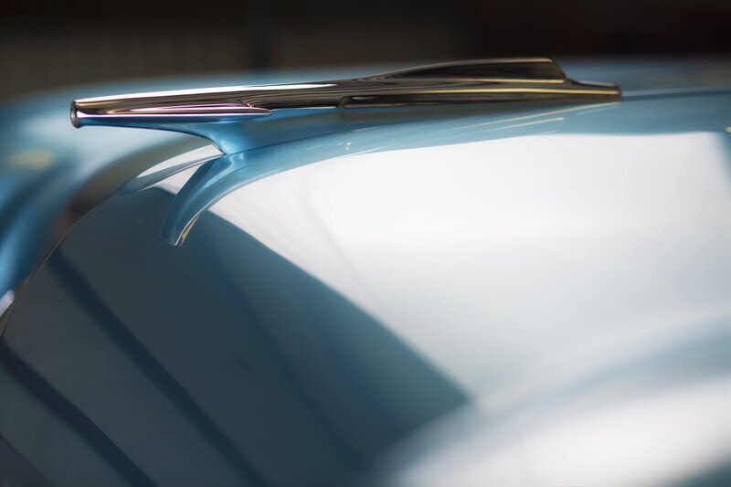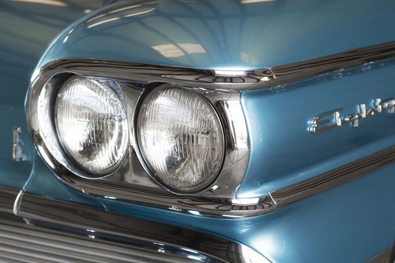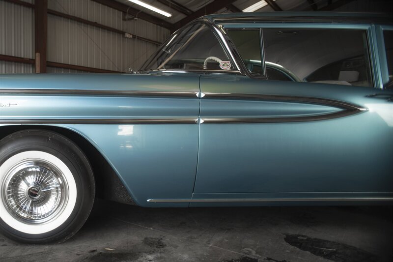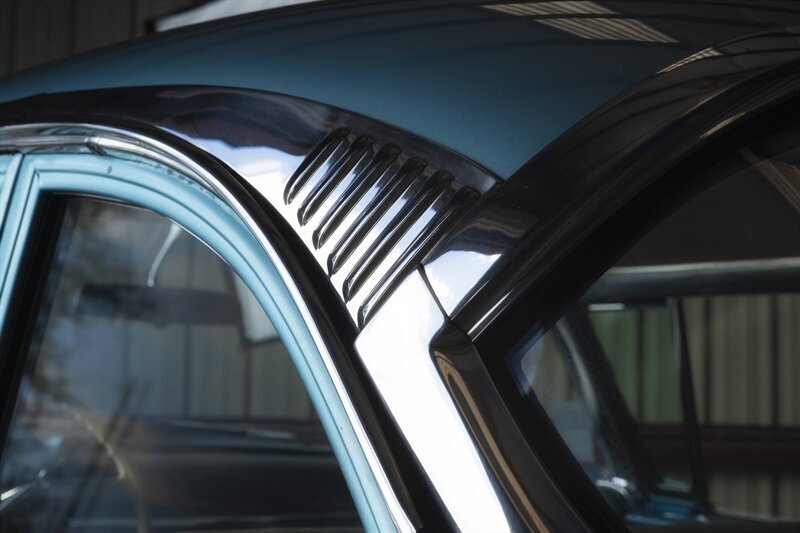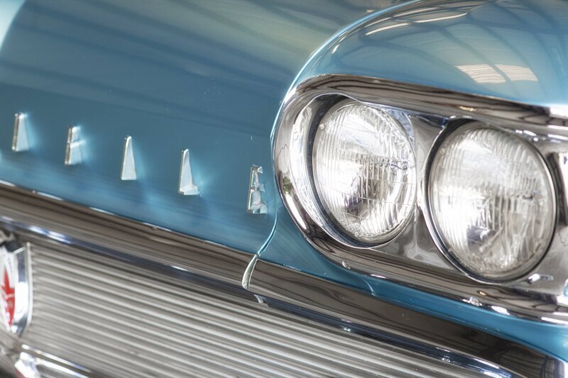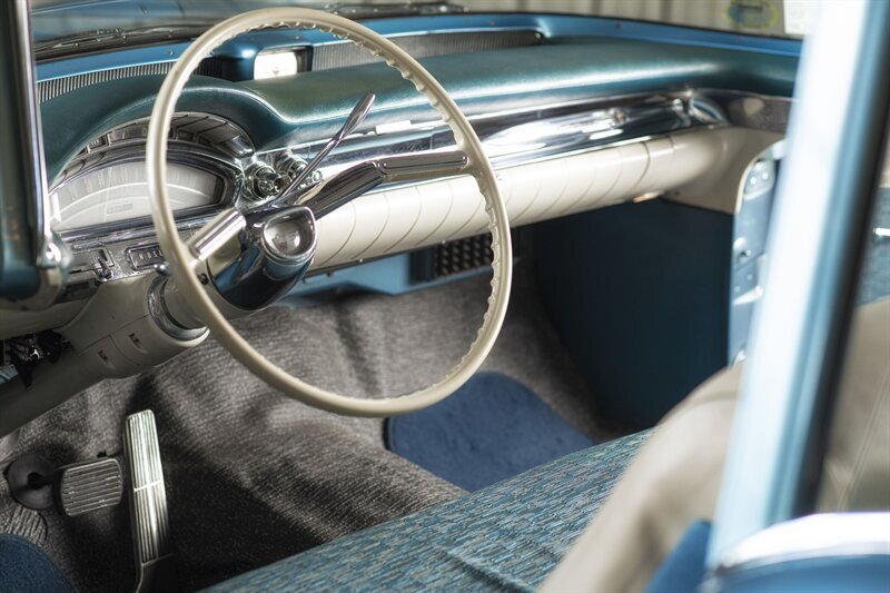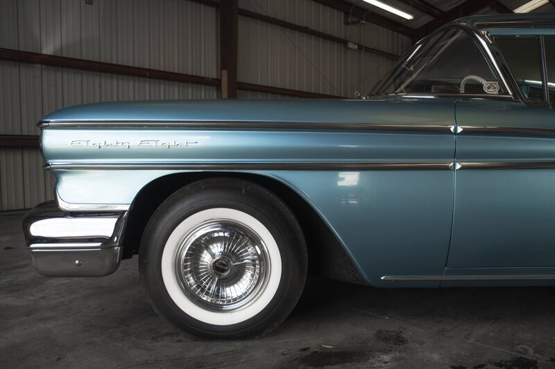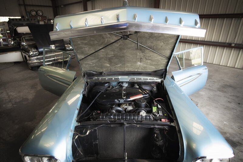 This big cruiser rolls on BFGoodrich Silvertown wide whitewall tires, size 8.50-14, at all corners, including the spare. Each tire is mounted on a steel wheel topped with a factory wheel cover. All tires and wheel covers are in very good order and there’s a jack located in the trunk. The white headliner looks good for its age. The blue-over-white metal dash looks great and like the exterior, is bedecked with chrome.