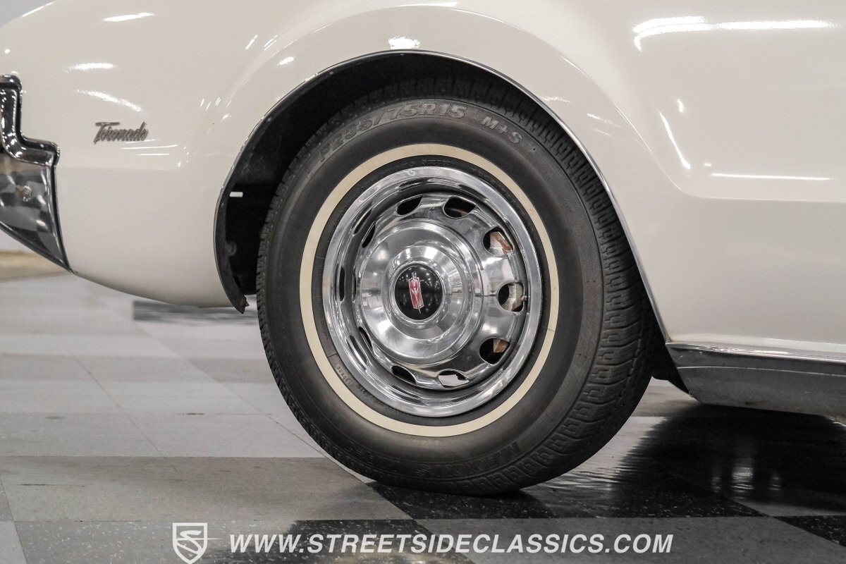 Stand out from the crowd with this 1967 Oldsmobile Toronado, a true original that's not afraid to break the mold. The Provincial White paint and black vinyl top create a striking contrast that's sure to get noticed. The chrome details and 15" hubcaps add just the right amount of shine. With fresh 235/75R15 tires, this Toronado is itching to hit the open road.