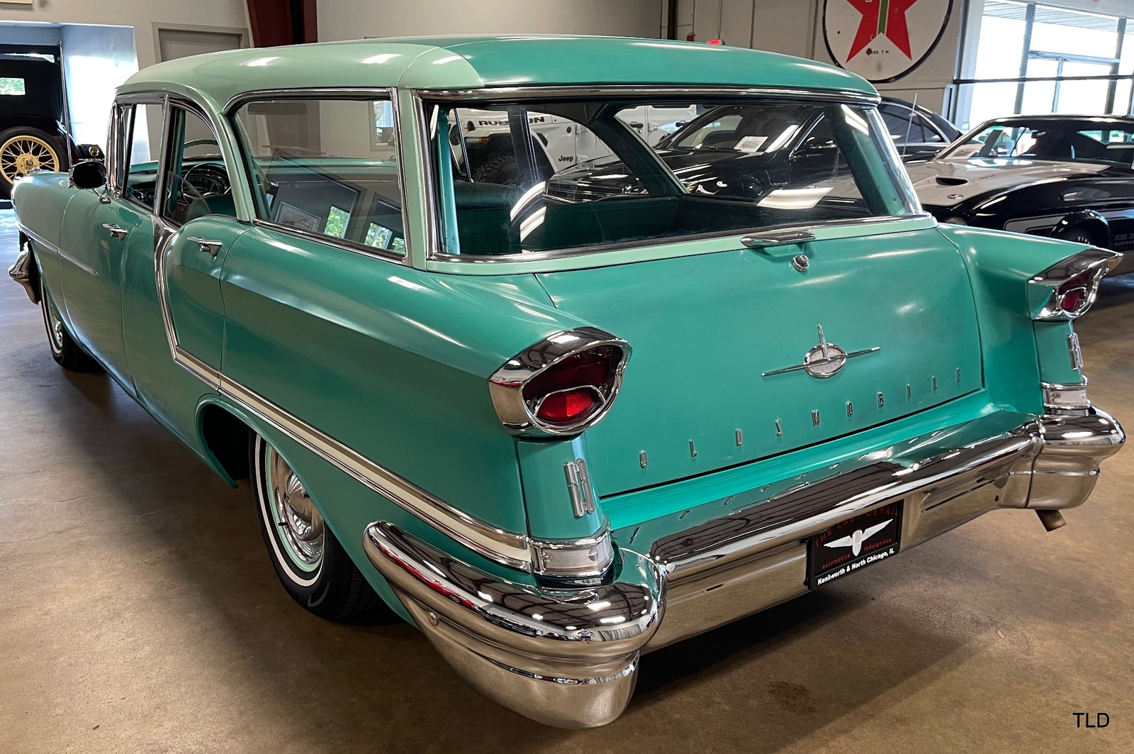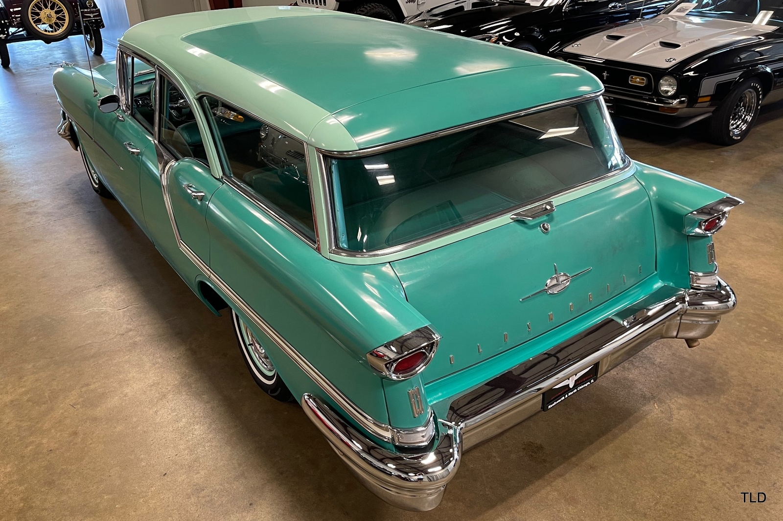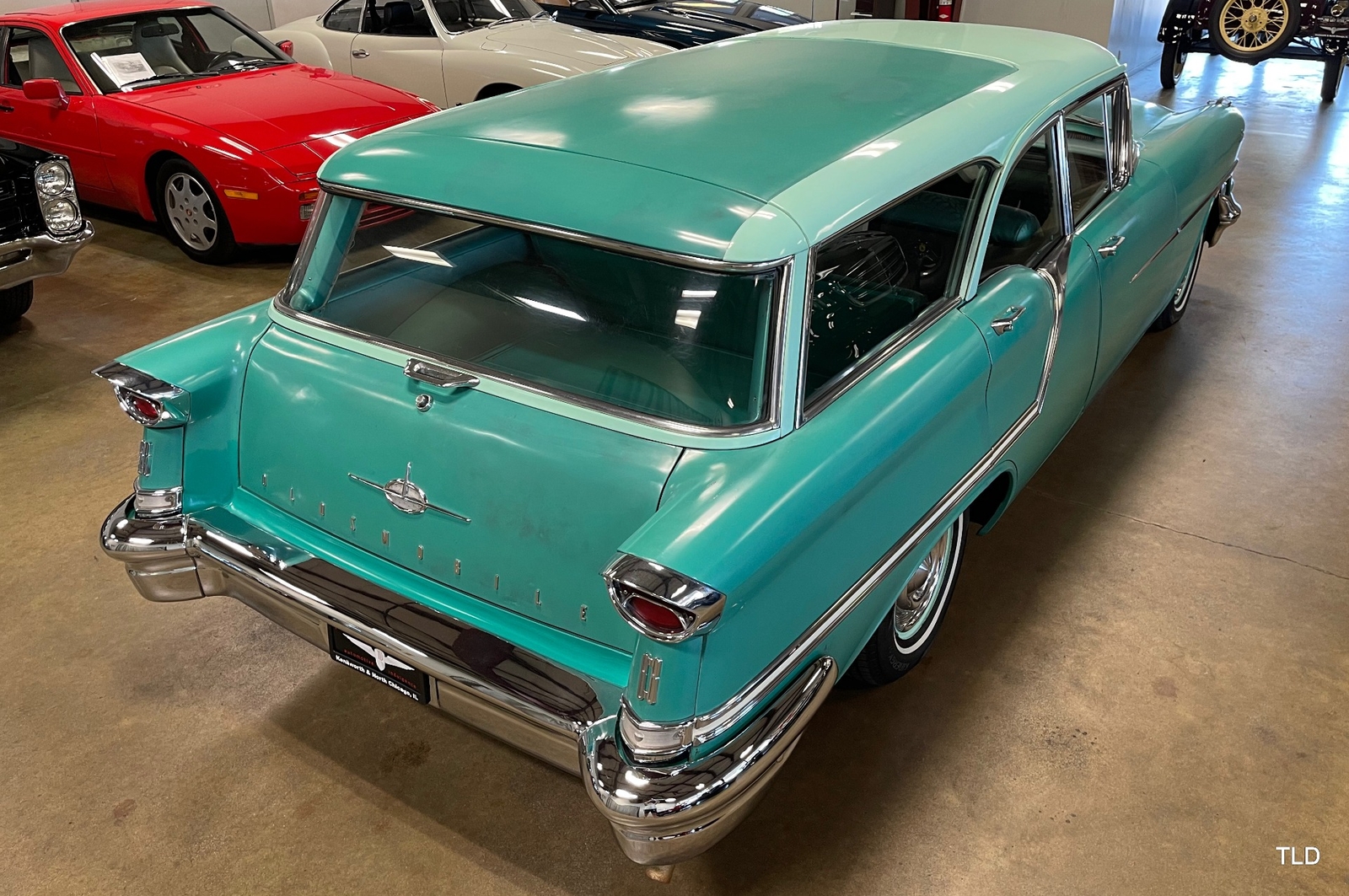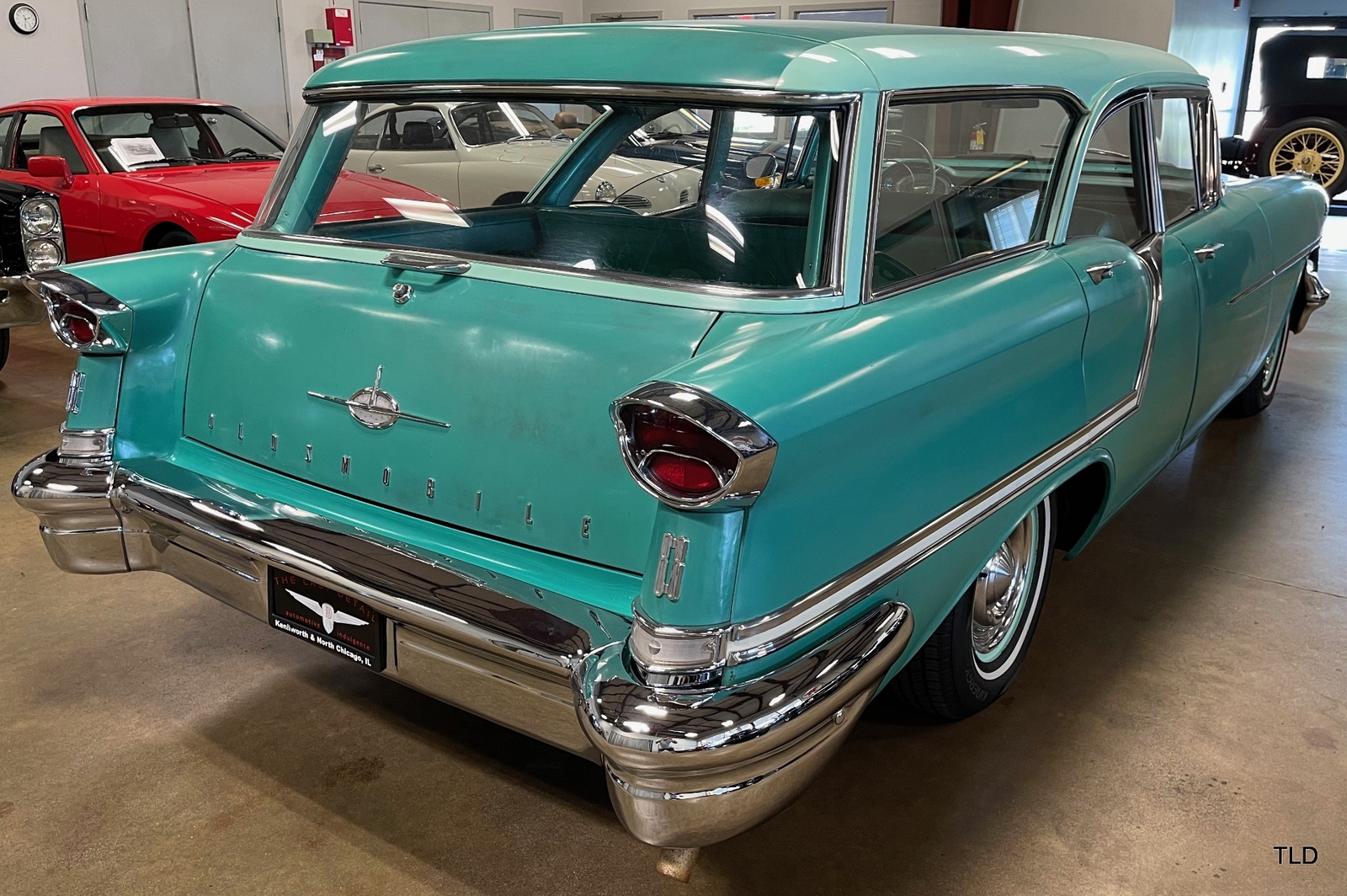 Formerly under long-term ownership and storage in Colorado, this Oldsmobile 88 Fiesta station wagon is an excellent survivor of 5,052 pillared-roof Golden Anniversary 88 models produced for 1957. Over the past three years, the Fiesta has received major service work including an engine overhaul with a 0.030 overbore, re-sealing of the gas tank, a transmission-fluid flush, new brakes and shock absorbers, and a carburetor rebuild. Desirable upgrades include installation of an electric fuel pump and Pertronix electronic ignition system. The Ice Green and Allegheny Green two-tone paint finish remains exceptionally original, as does the two-tone green vinyl and cloth upholstery. Factory features and options include the automatic transmission, AM radio, and heater. Original rubber floor mats remain in place. Additional items include a lubrication receipt and door-jamb sticker from 1958 and a paint-code breakdown, plus a spare wheel/tire, roadside jack and lug wrench. Very nicely preserved and remaining mostly in OEM condition, this 1957 Oldsmobile Golden Rocket 88 Fiesta Station Wagon is a wonderful find, sure to please anyone who appreciates the irreplaceable look and feel of a highly original and never fully-restored automobile. Contact us for complete details and make it yours in time for summer drives and shows!