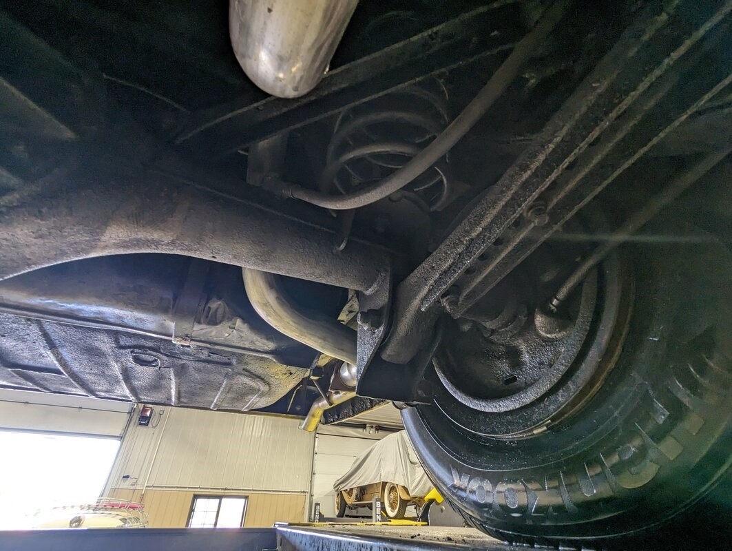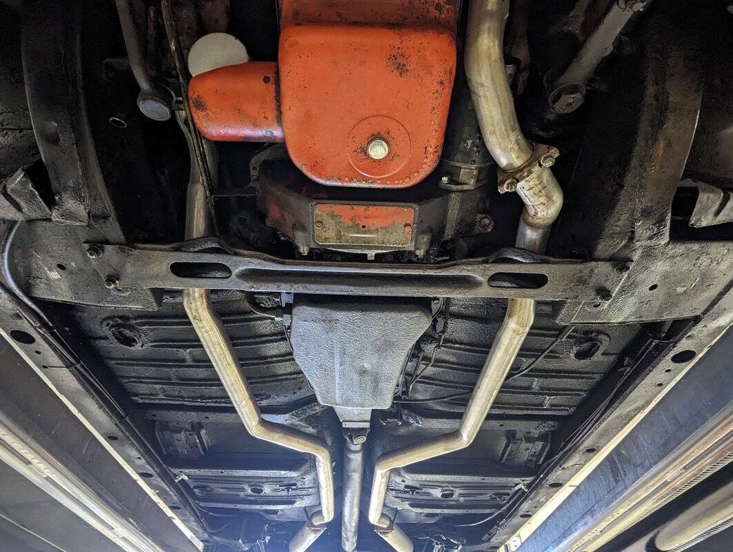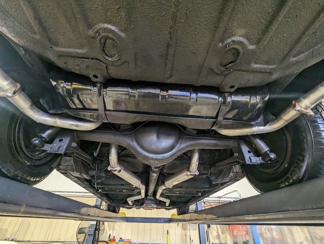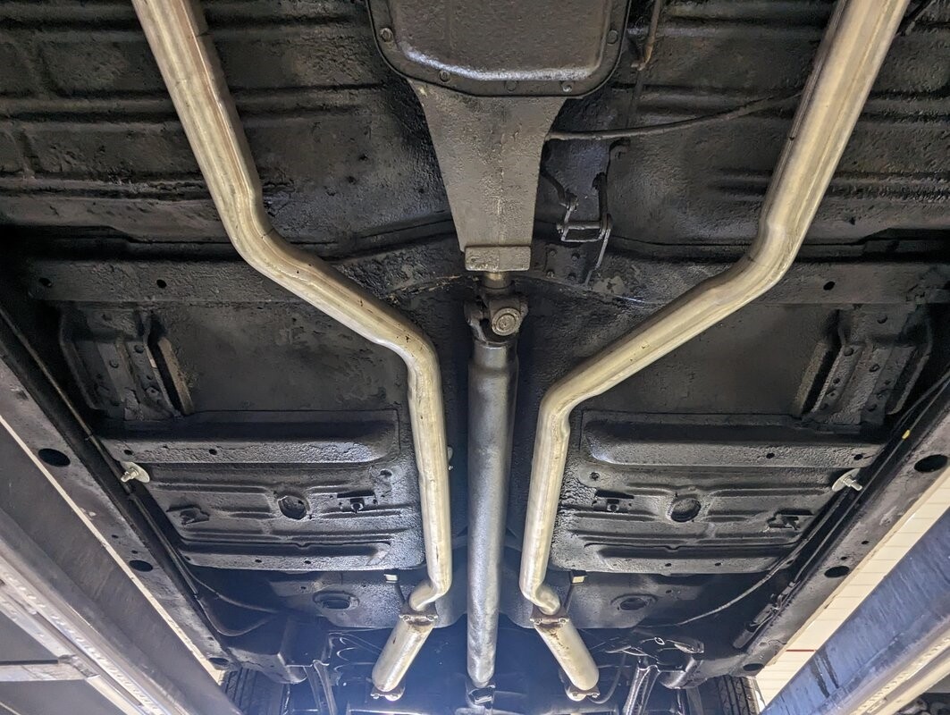 UNDERSIDE: Underneath the car appears to be solid and maintained as needed. The dual exhaust looks recent with glass pack style mufflers. The fuel tank has been replaced. The front end has been inspected and serviced. The shocks and springs look like they were replaced. The starter was just rebuilt. It has the original Hydramatic trans, the 1962 tag is still attached.