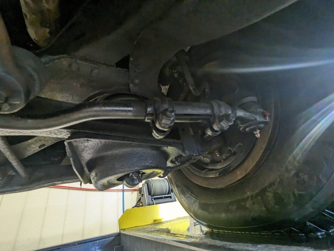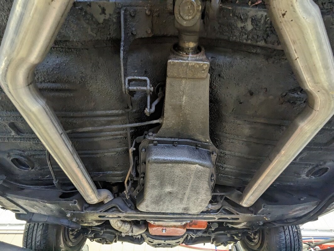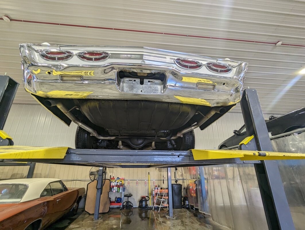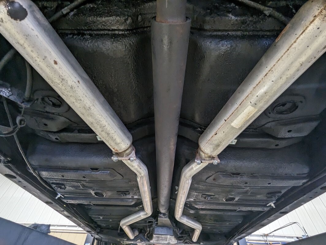 UNDERSIDE: Underneath the car appears to be solid and maintained as needed. The dual exhaust looks recent with glass pack style mufflers. The fuel tank has been replaced. The front end has been inspected and serviced. The shocks and springs look like they were replaced. The starter was just rebuilt. It has the original Hydramatic trans, the 1962 tag is still attached.