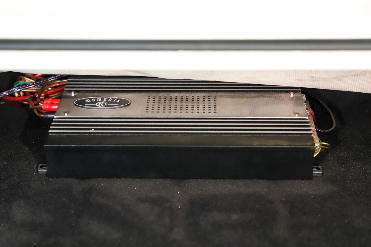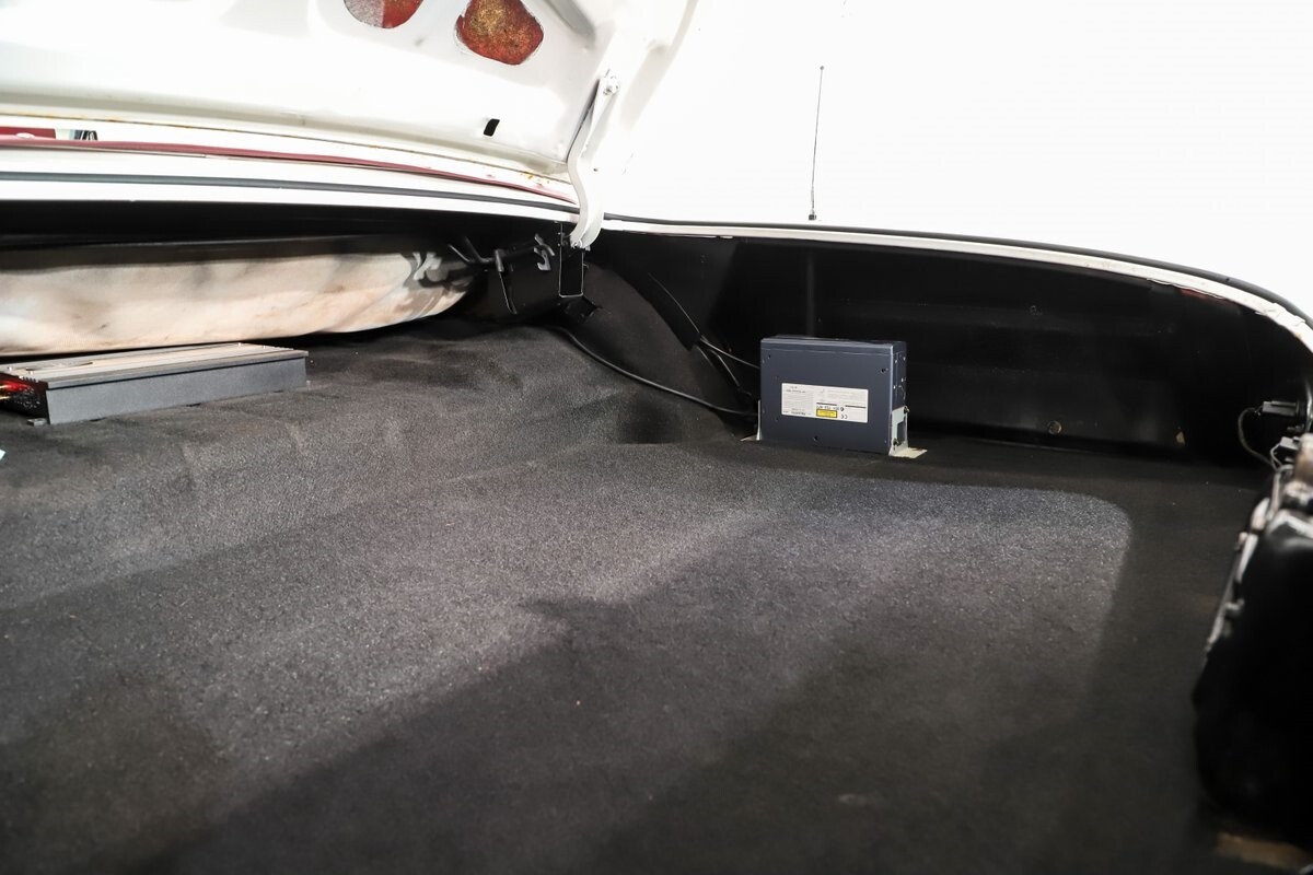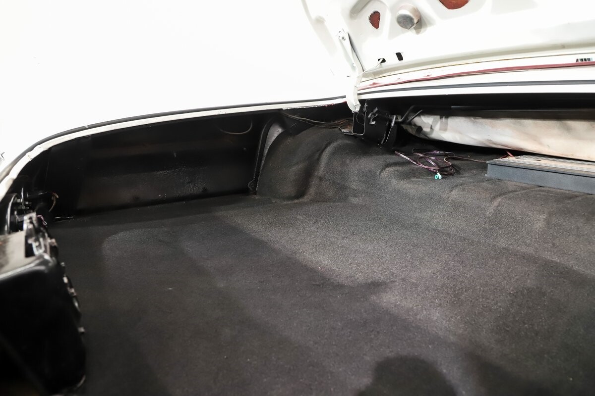 TRUNK COMPARTMENT: Giant trunk! Under the lid and jamb were repainted. It's lined in felt and has a custom floor panel. Underneath it is the spare and jack. There is also a CD changer and amp too.