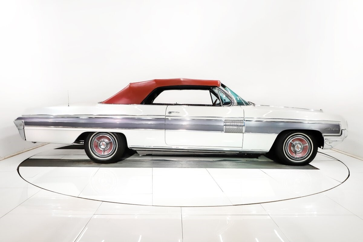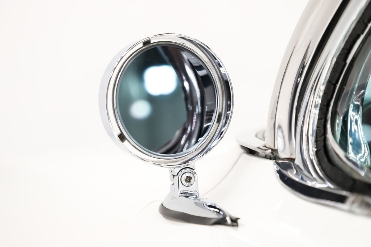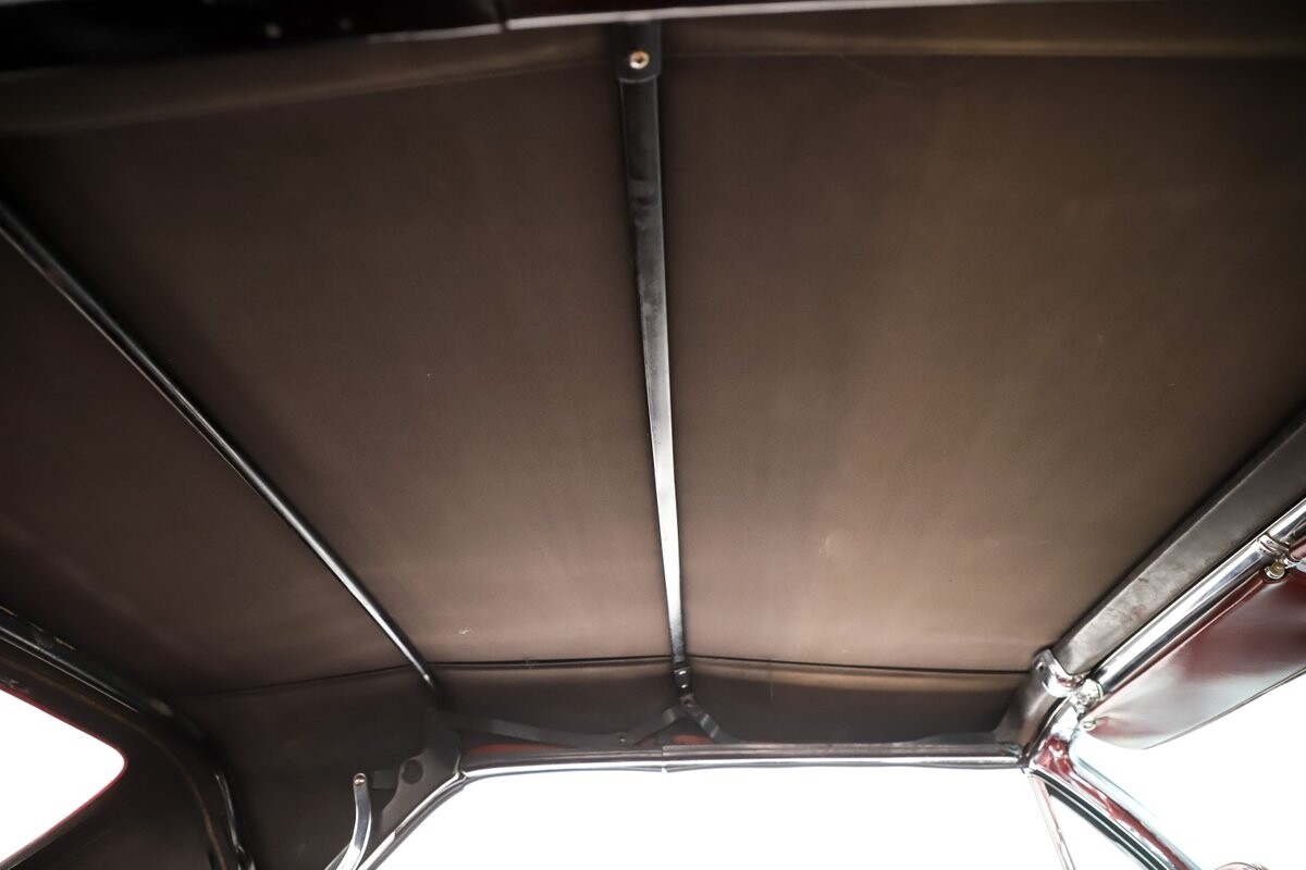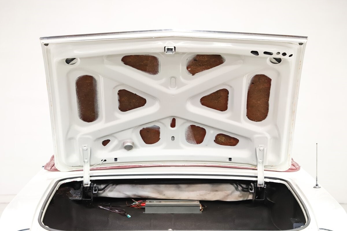 EXTERIOR: Overall it's a great looking car. I would be proud to go to any cruise night or car show with it. Very solid, straight and fits good. The paint is a white metal flake that is smooth and glossy. It's an older paint job with minor flaws if you look for them. The chrome and trim are original and present nicely. There is a dent in the rear bumper. Original glass, weather strips were replaced. Dark red convertible top looks sharp!