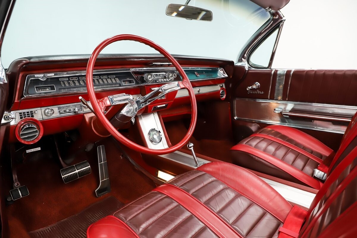 INTERIOR: Best part of the car. Someone spent some coin on genuine leather upholstery! The door panels are really stylish, upper panels are new leather. The seats are really cool too; buckets in front and the back is shaped like buckets too. All leather seats including the sides. The dash is also very cool with lots of trim, shapes and check out the clear plastic over the glove box and the cool steering wheel! Even the pedals have style. There is a modern stereo hidden in the glove box. Features include a console with a tachometer, power windows and seat, wonderbar radio, front seat belts and speed warning indicator.