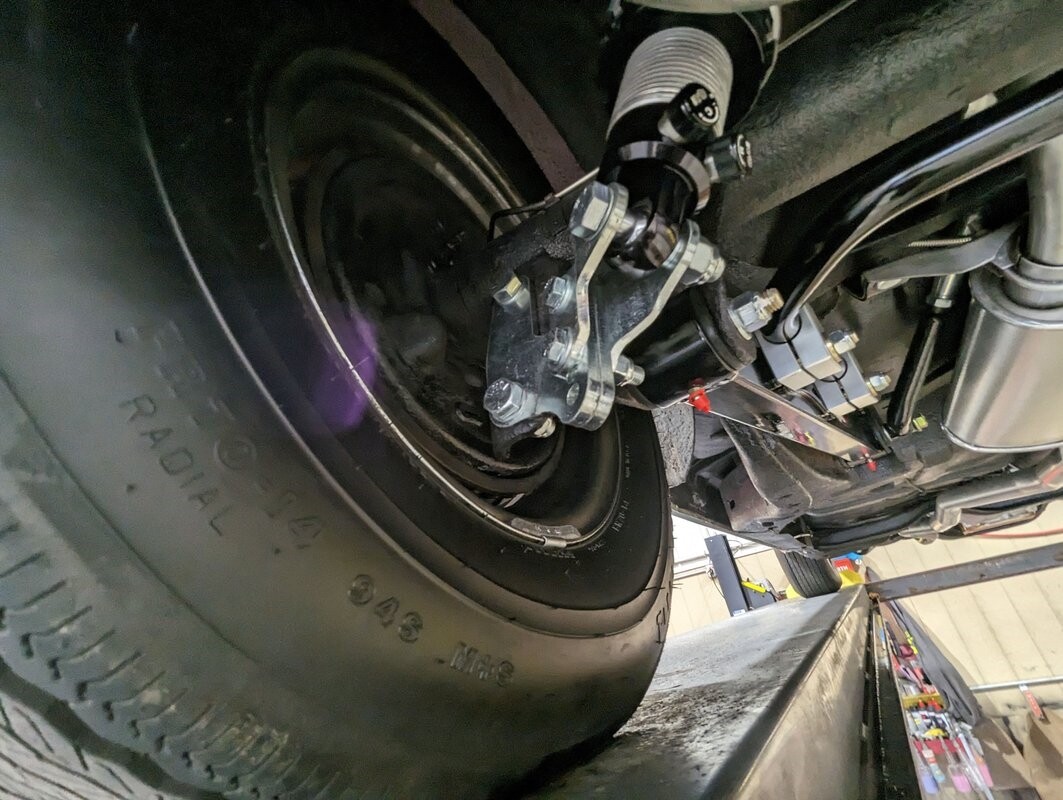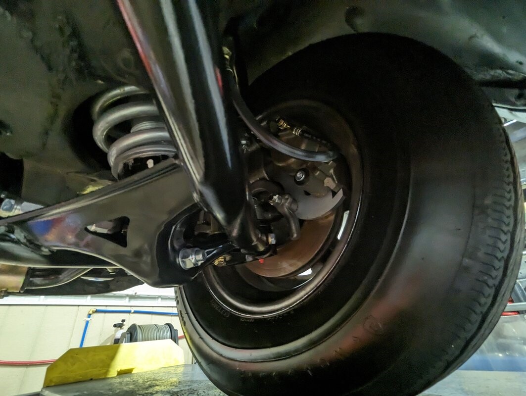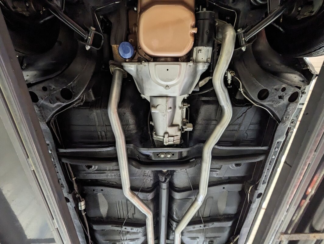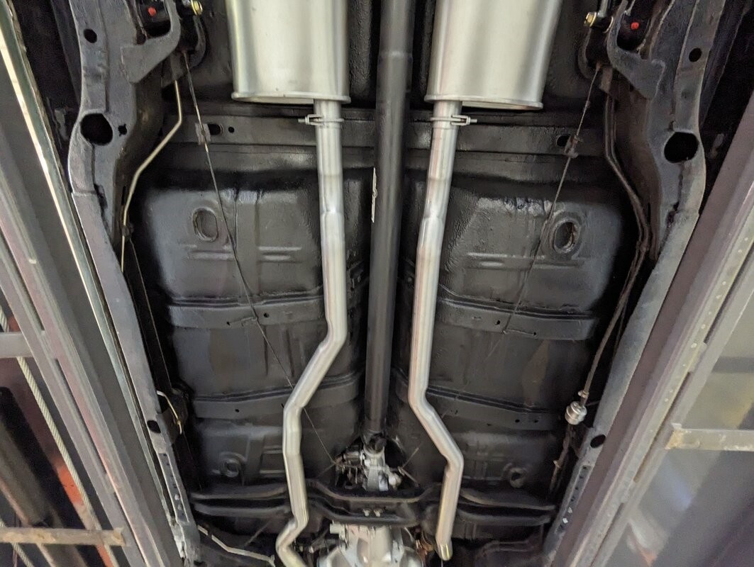 UNDERSIDE: The underside has been neatly preserved, maintained, and upgraded with bolt on parts to enhance the driver experience. The steering components have been upgraded with a Ridetech steering kit that includes center link, idler arm, tie rod ends/adjusters, and jam nuts. The entire front suspension has been upgraded with QA1 components and includes adjustable coil over shocks, tubular upper and lower control arms, and sway bar. The rear suspension has been upgraded with QA1 components as well and includes adjustable coil over shocks, lower trailing arms, adjustable upper trailing arms, rear sway bar and adjustable frame supports. The result of all the suspension work is essentially a pro touring ride quality. The front brakes have been upgraded with a Leed power disc brake conversion kit and new lines also. The rear brakes are drums, and the emergency brake is hooked up. The entire dual exhaust system has been replaced and sounds fantastic when flowing through the correct polished trumpet style exhaust tips. The gas tank appears to be original, but the fuel lines have been replaced. Looking up at the rebuilt numbers matching 400 engine everything looks fresh and there are no visible leaks. Same goes for the M20 Muncie 4 speed manual transmission. It has been totally rebuilt and looks very clean. The 12 bolt posi rear end is original to this car. The frame and floors are solid and look fresh with black paint.