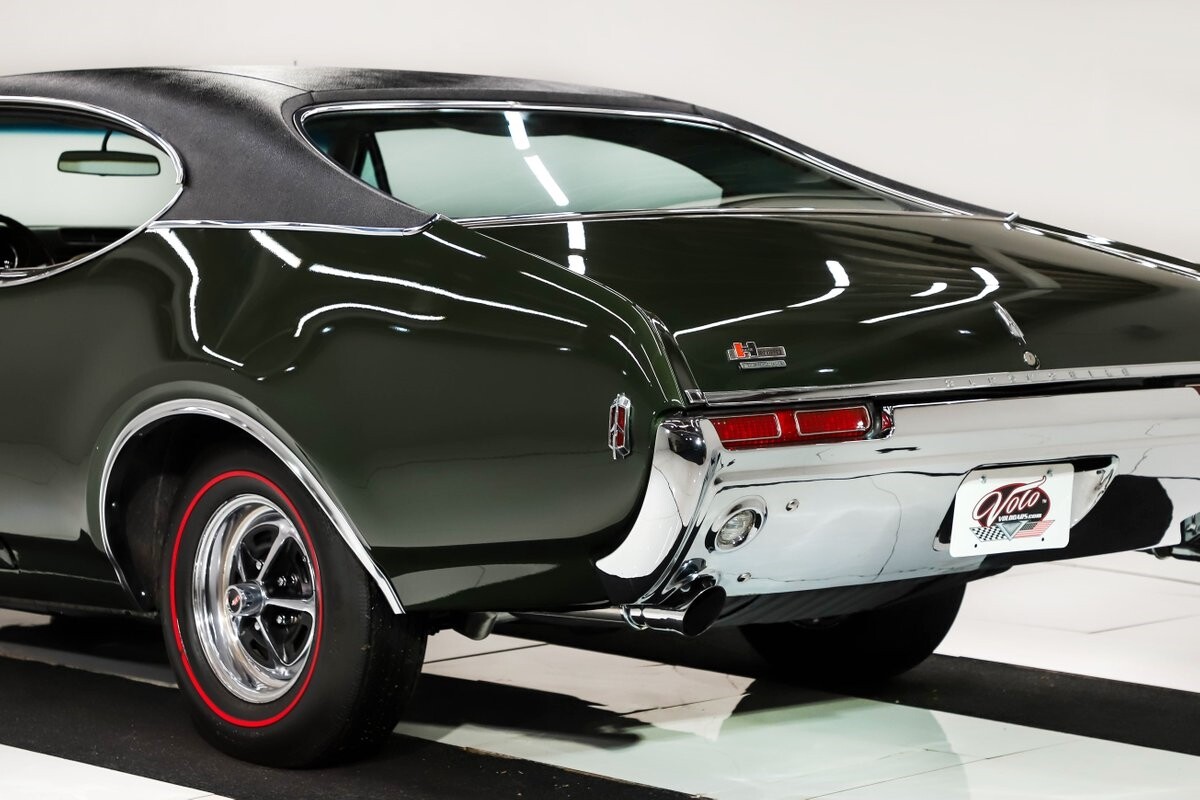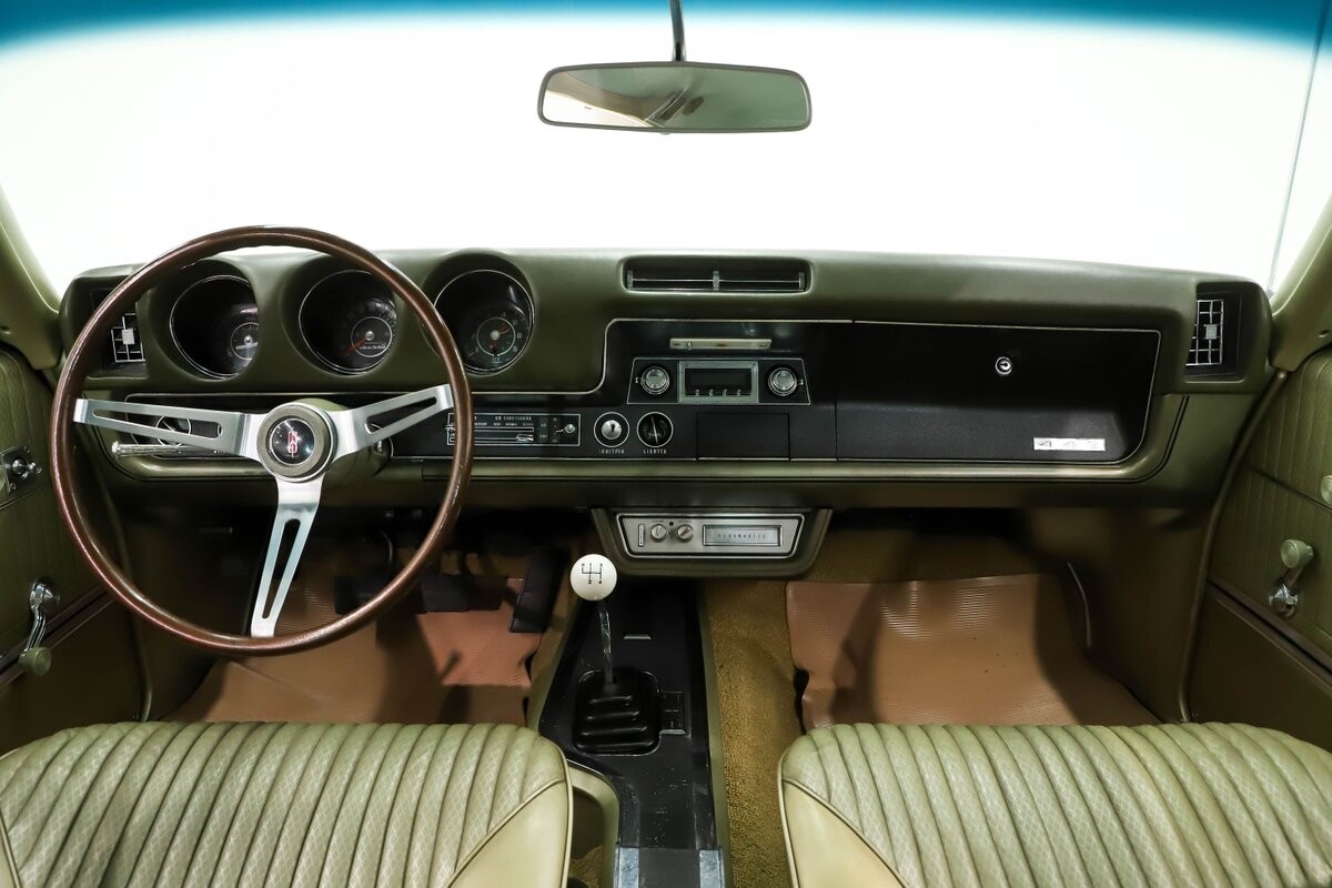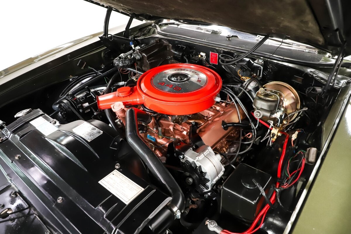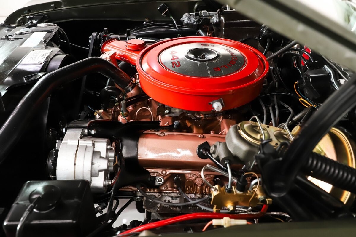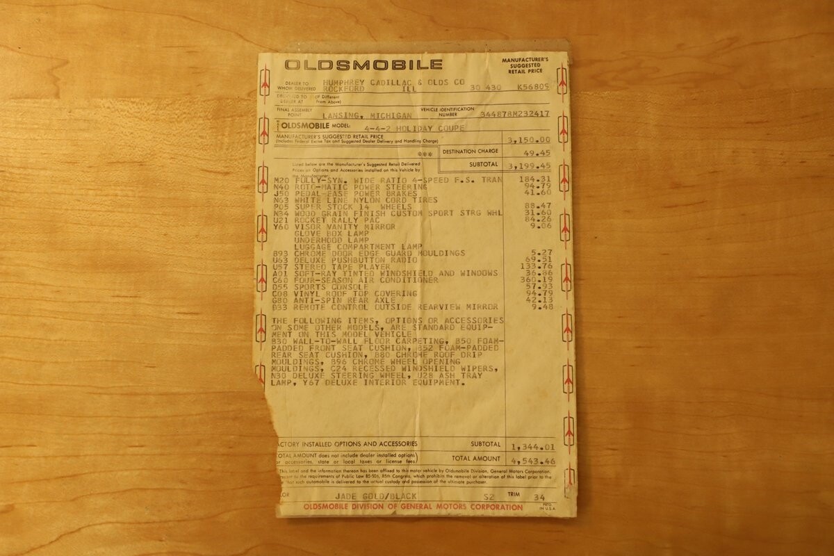 INTERIOR: This interior is 100% original with exception of the headliner, sun visors, and Retro Sound stereo (original included in the trunk)! The authentic front bucket seats are in fantastic condition and show just the slightest bit of patina. The factory center console sits proudly between the front seats and look amazing. The Hurst shifter is original and says 442 right on it! The rear seat is also in remarkable condition. It has the original seat belts all the way around. The factory door panels are in exquisite shape. The dash pad is free of any imperfections as is the rest of the dash. The original gauges are in place and there are currently 88,159 actual miles on the odometer. It is equipped with optional Tic Tok Tach and rally gauges from the factory. It still retains the very rare and original 8-track tape player. The original radio was replaced with a Bluetooth and SiriusXM capable digital radio by Retro Sound. The headliner and visors were professionally reupholstered. The carpeting and floor mats are original and in outstanding condition. The dome light and kick panel lights are in working condition.