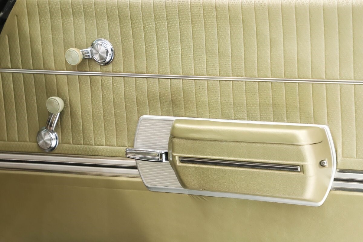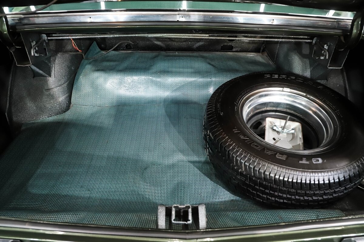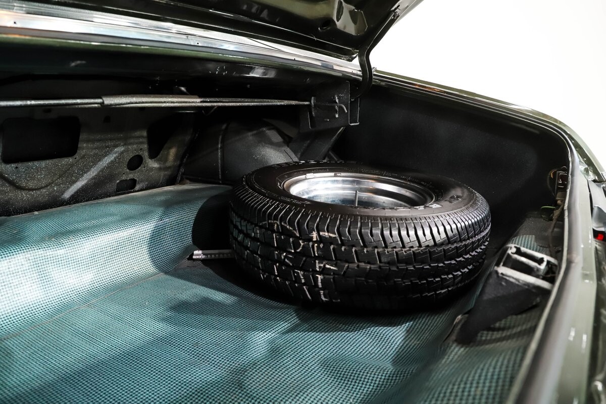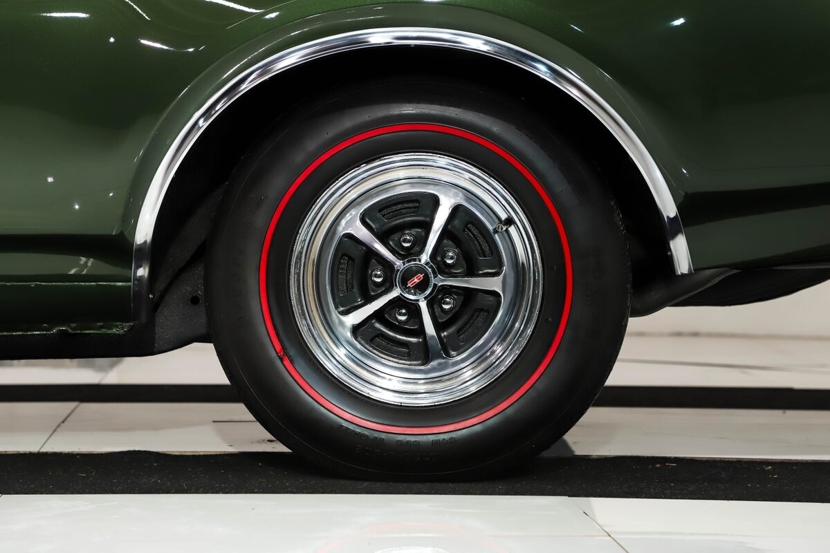 EXTERIOR: What a slick looking car! It has been professionally repainted its factory original Jade Green metallic color with optional white stripes flanking each fender. It was then sanded and polished to a smooth and reflective finish. The vinyl top was replaced. All the panels are properly aligned with good gaps all the way around. The doors close easily like a new car. The mostly original trim still has a lustrous shine to it. The front and rear bumpers have been rechromed. The grille, headlight bezels, and taillights are original and in great shape. All the glass is original except the windshield. Beautiful 14 inch chrome SS1 rims are wrapped in reproduction Firestone Redline tires that are actually radials!